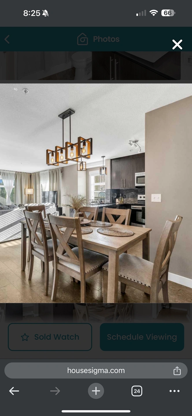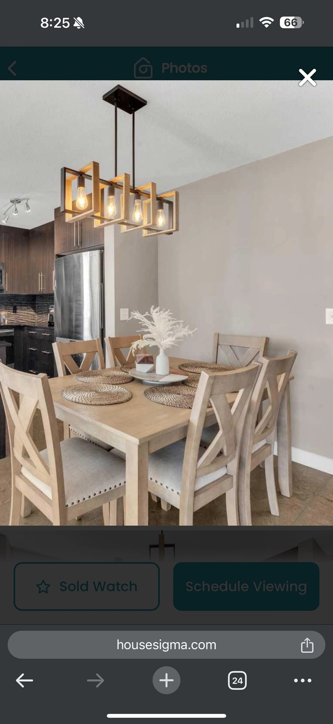 5Includes dining table and 6 upholstered chairs in a light brown colour . Table made with hardwood solids, veneer and MDF substrate; chair made with hardwood solids Light brown natural wood tone. No pets and smoke- free environment. Table width: 36 Apron to floor: 23.13" Chair (6) width: 19 Seat width: 19" Seat depth: 21.13" Seat height: 20.13"
