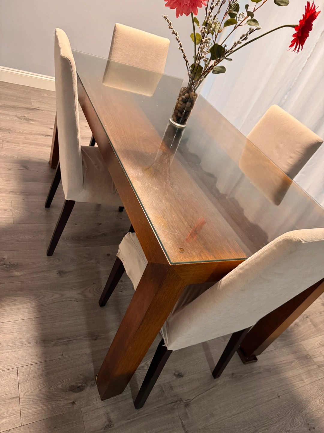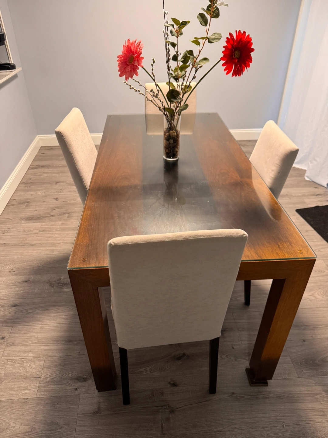 Glass Round Dining Table with 4 Black Chairs