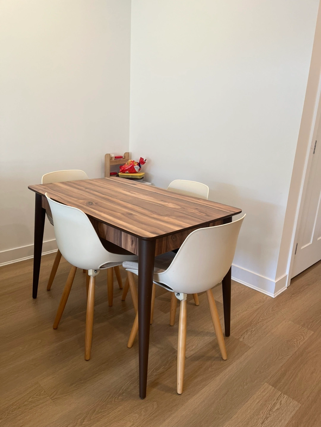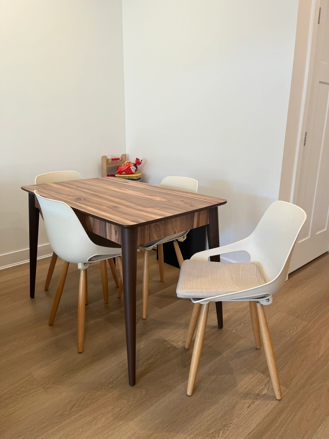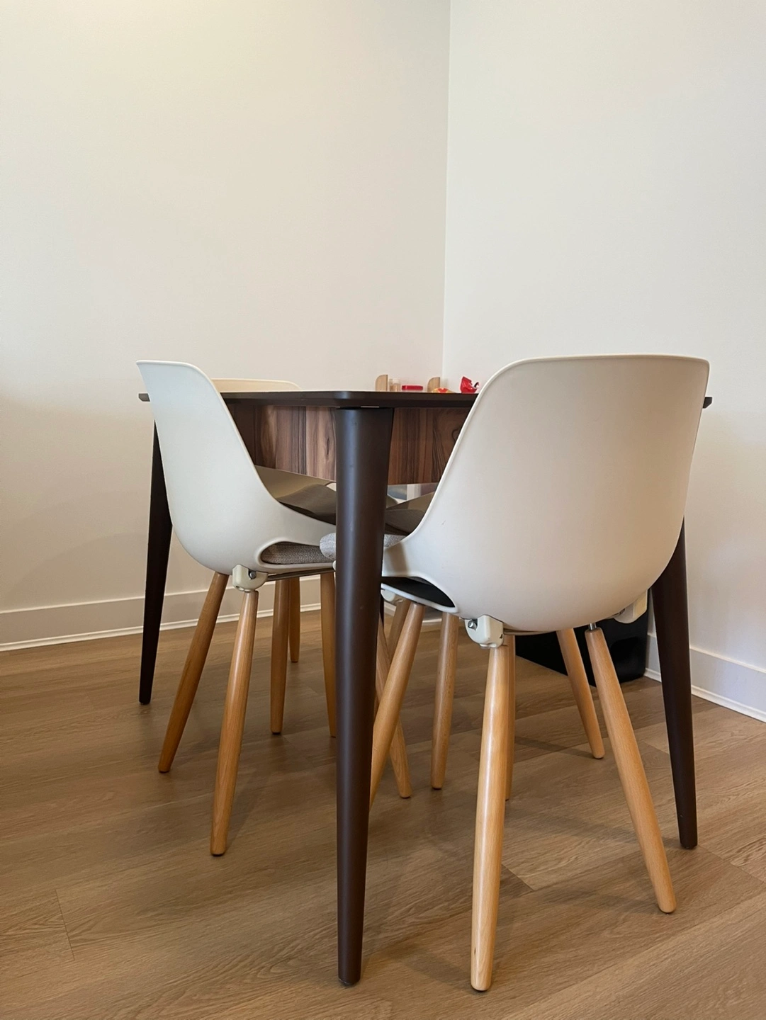 Four off-white plastic chairs with beige fabric seat cushions. Modern rectangular dining table, brown wood-look top and dark brown legs. Minimalist style, great for small spaces.