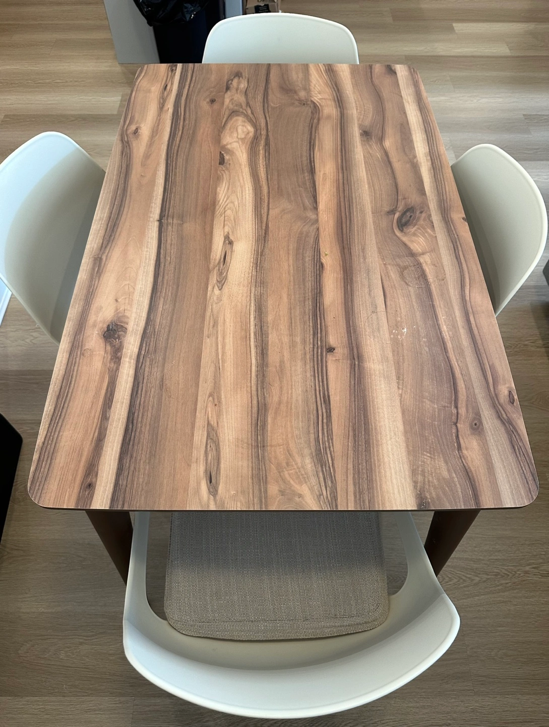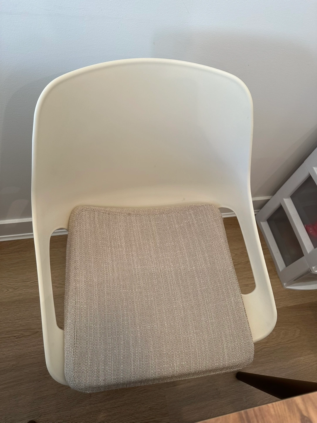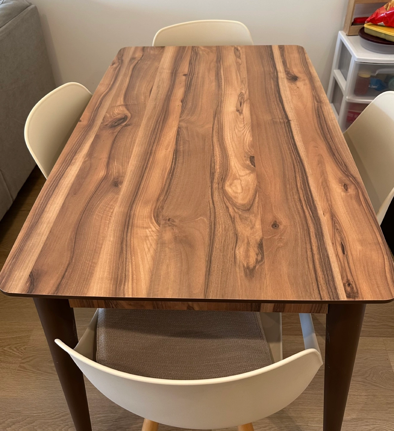 Four off-white plastic chairs with beige fabric seat cushions. Modern rectangular dining table, brown wood-look top and dark brown legs. Minimalist style, great for small spaces.