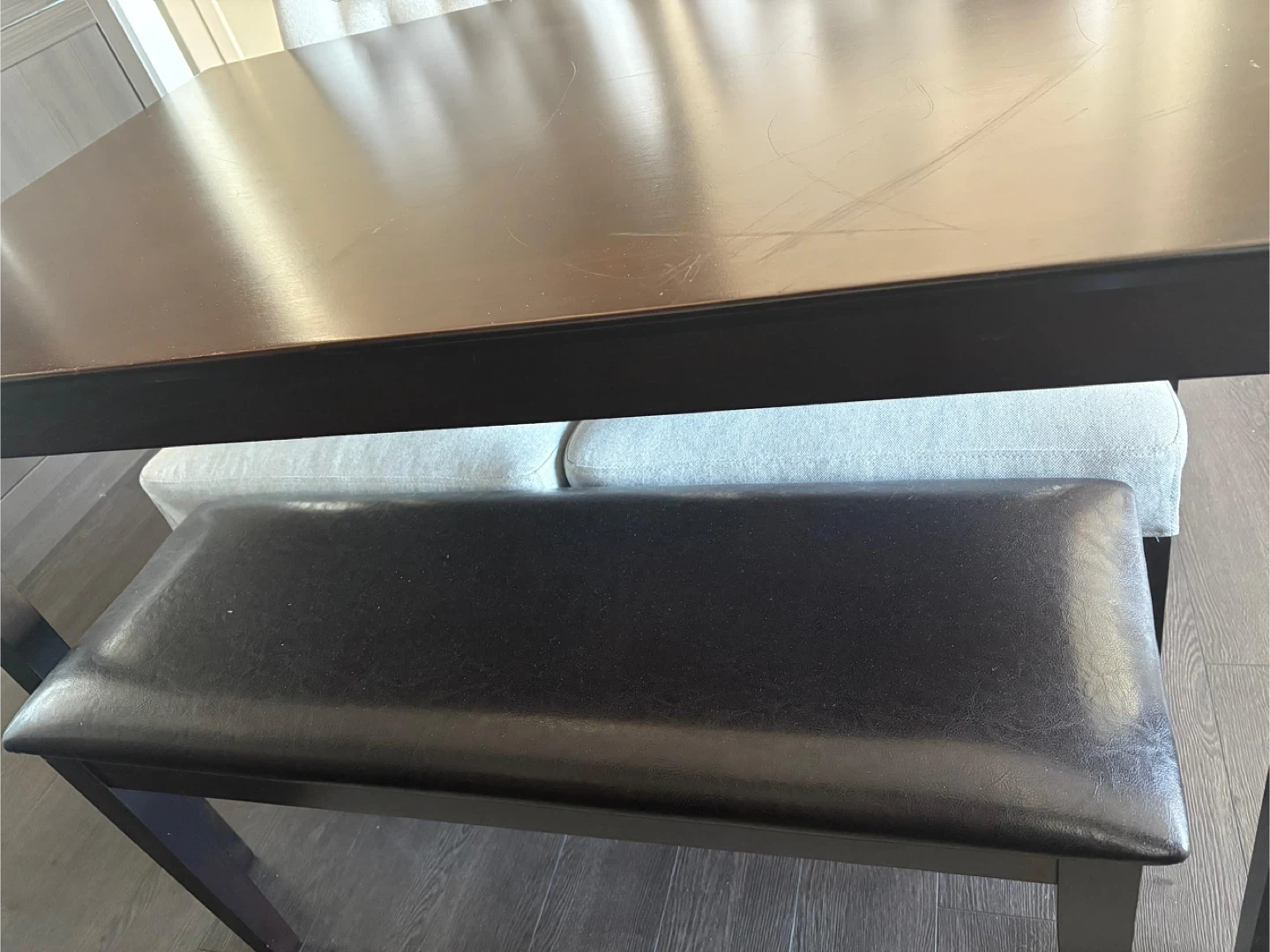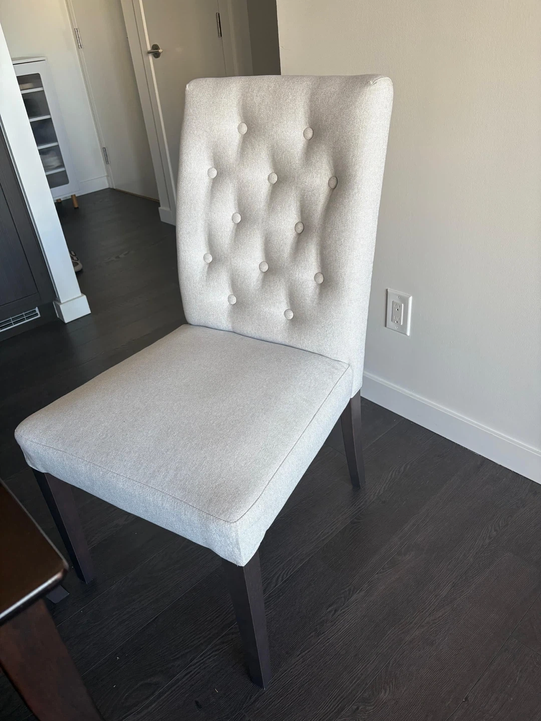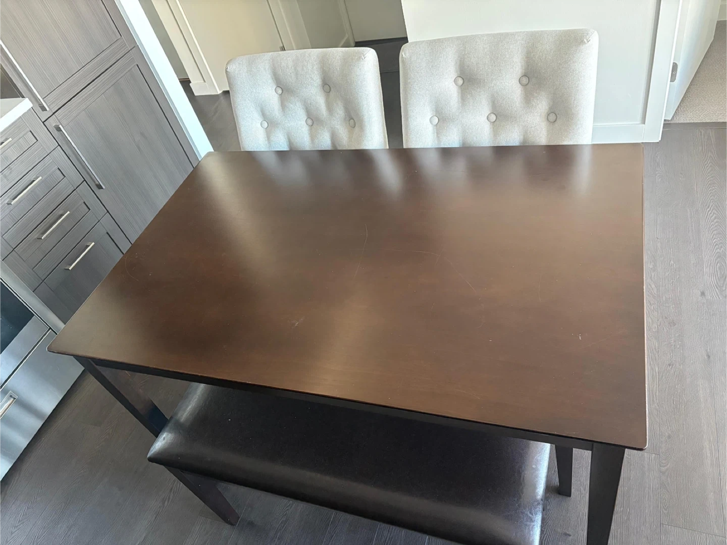 Selling a dining table with two chairs and a bench. The table is a dark wood colour, and the chairs are a light beige with button detailing. The bench is a dark brown colour. It's a lovely set for a smaller dining space! Dimensions: Table: 29.5x47x30 Bench: 13x37x18