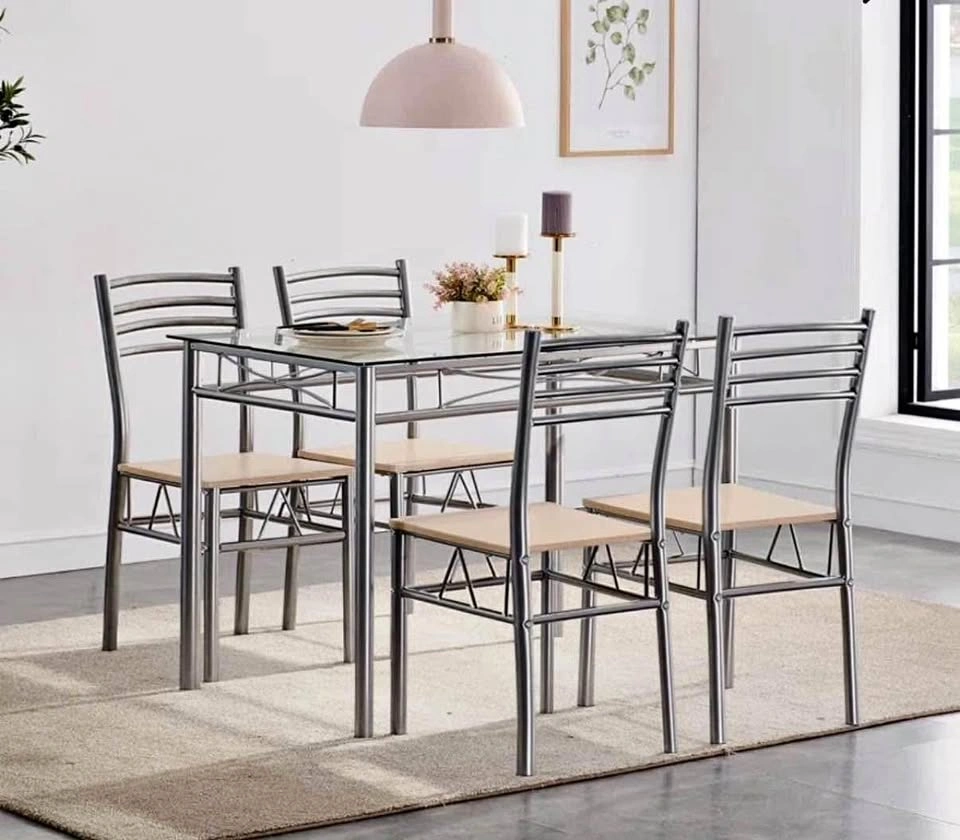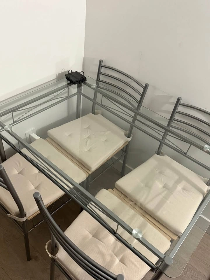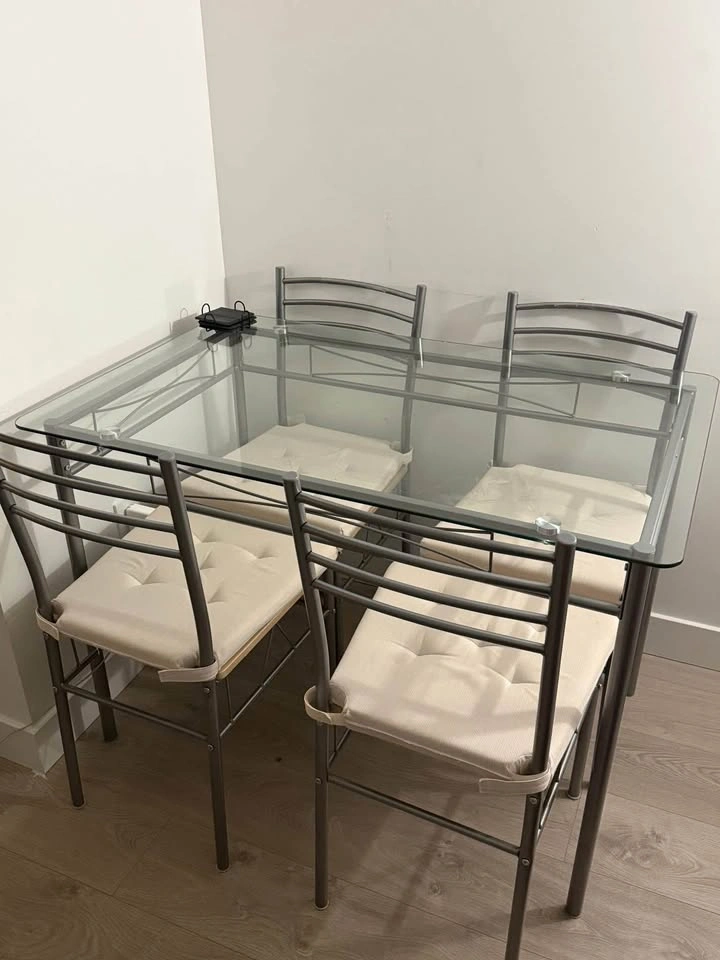 10Simple and sturdy dining set perfect for everyday use. Includes: - 1 rectangular dining table - 4 matching chairs - 4 IKEA seat cushions (removable covers, easy to clean) Condition: Gently used and solid structure Pickup only