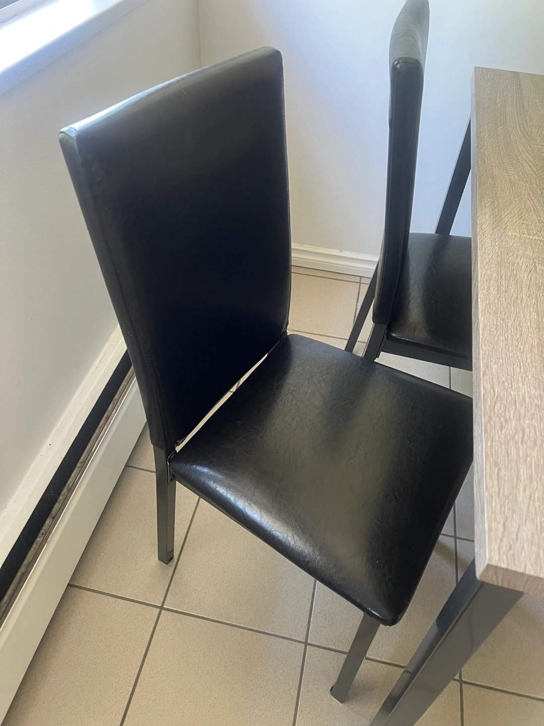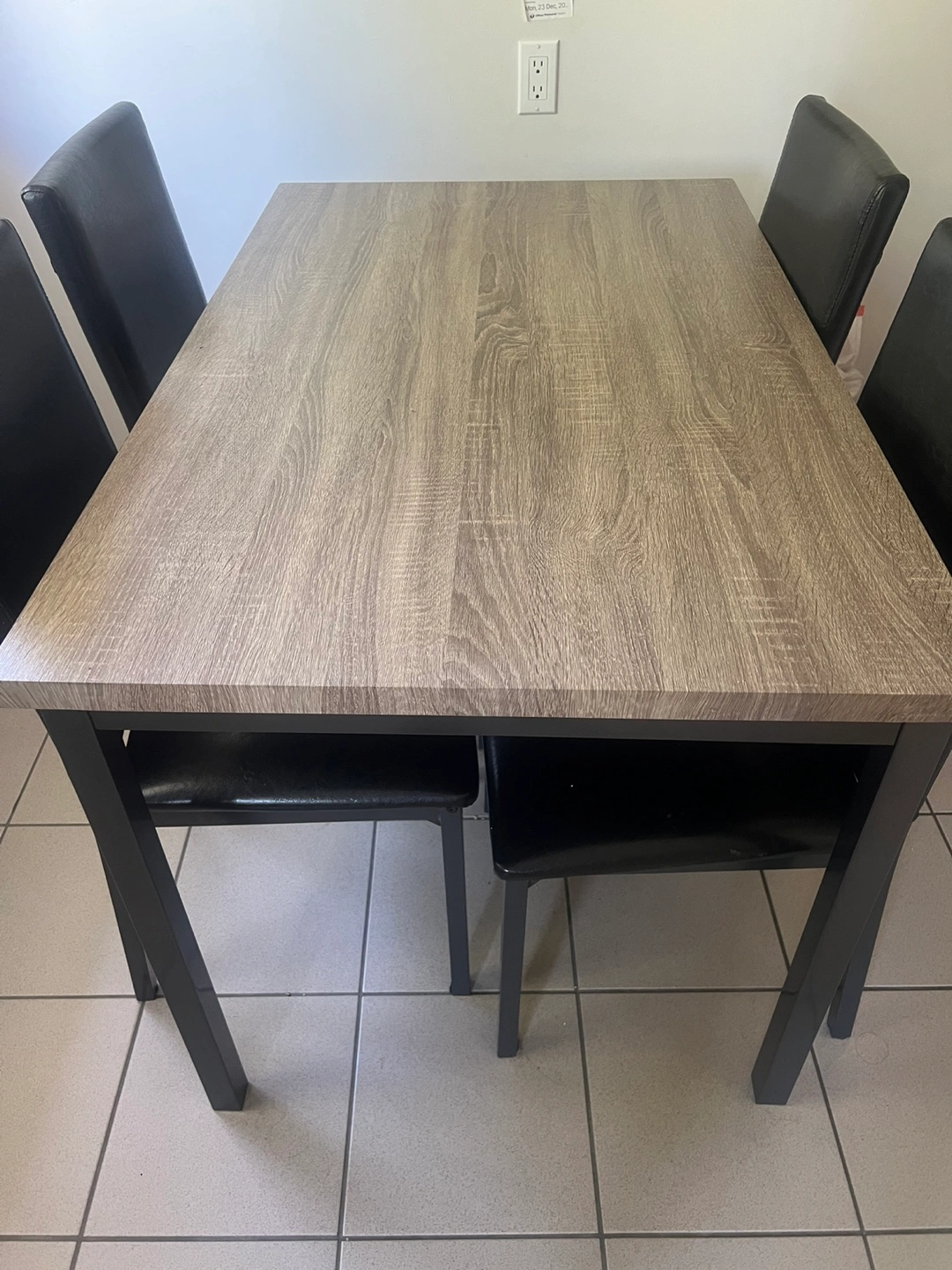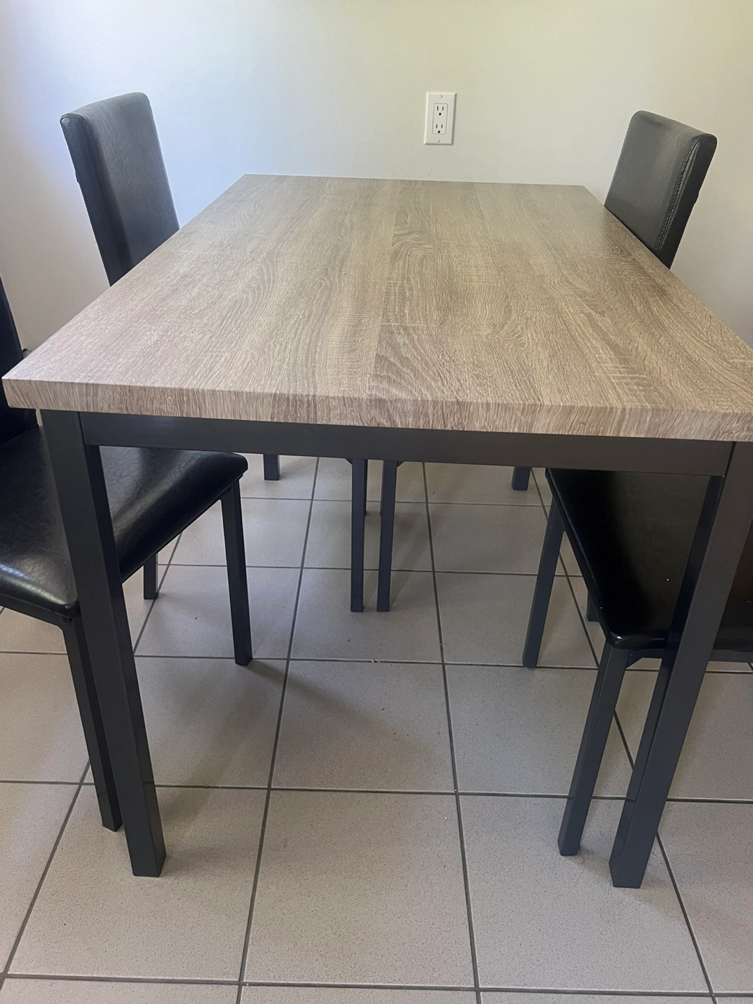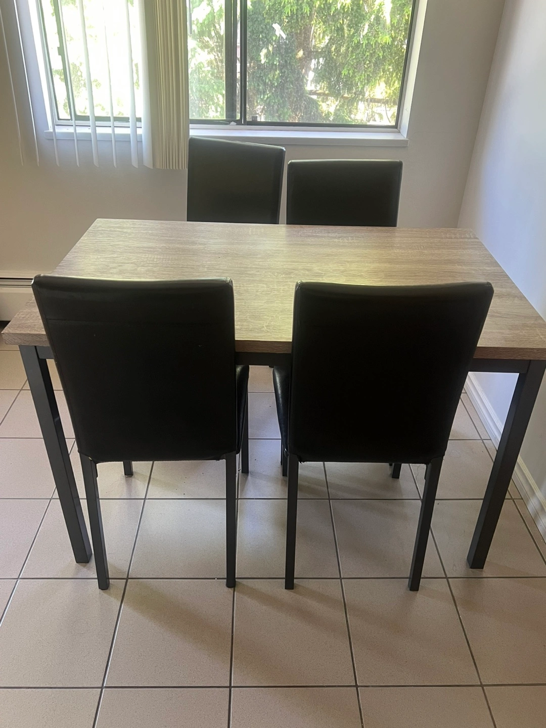 Selling a dining table with four chairs. The table has a wood-look top and black metal legs. The chairs are black with a sleek, modern design. It's in good condition and ready for a new home!