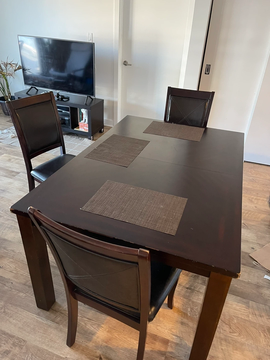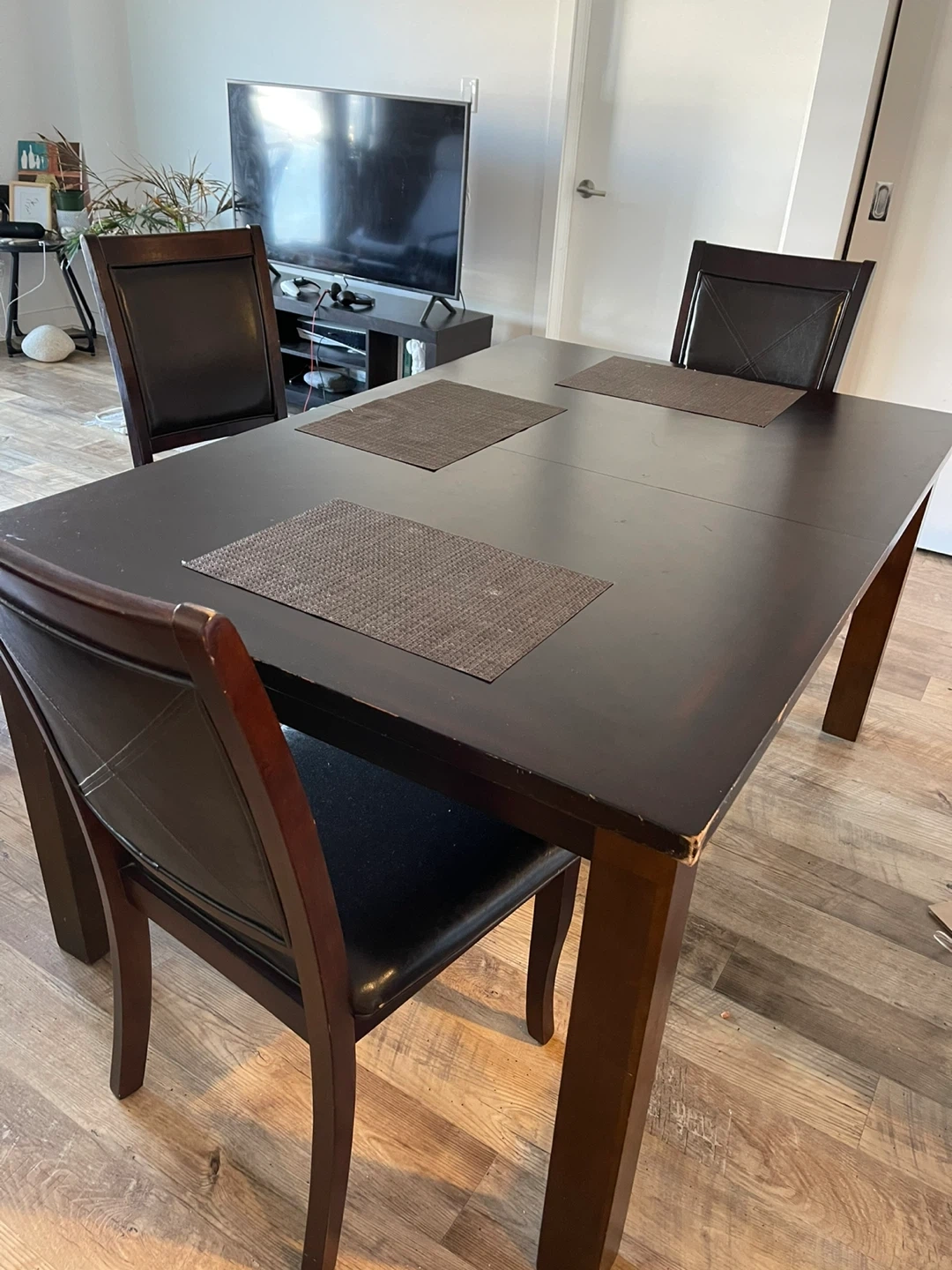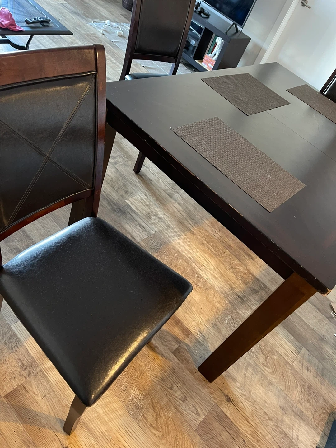 10Selling a dining table with four chairs. The table is a dark brown colour and has some minor wear and tear, but is still in good condition. The 3 chairs are black with a dark brown wood frame. Great for a small dining space!
