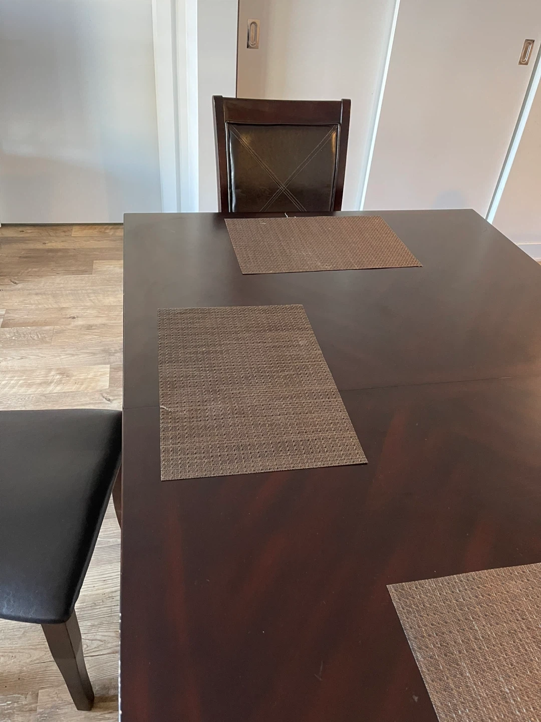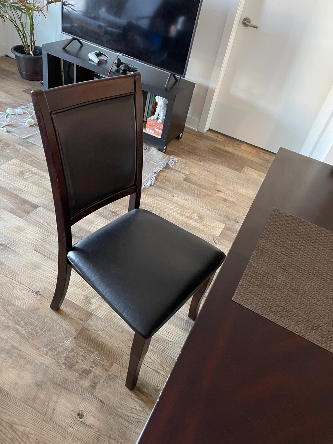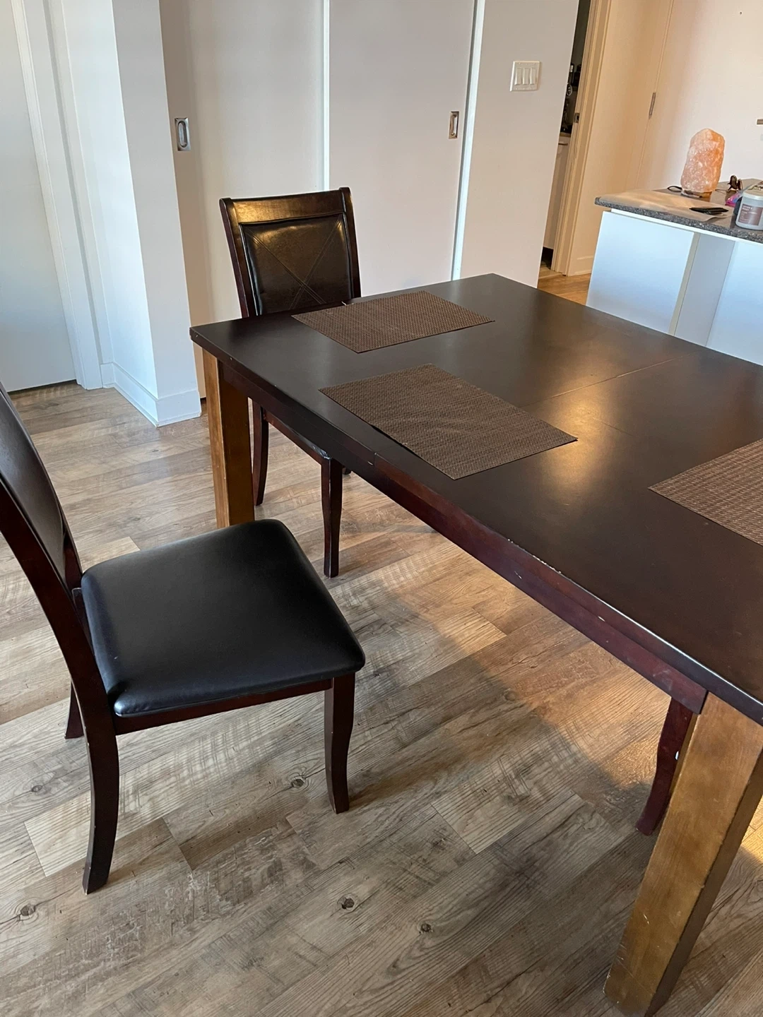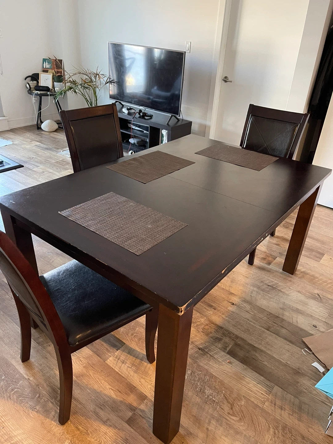 10Selling a dining table with four chairs. The table is a dark brown colour and has some minor wear and tear, but is still in good condition. The 3 chairs are black with a dark brown wood frame. Great for a small dining space!