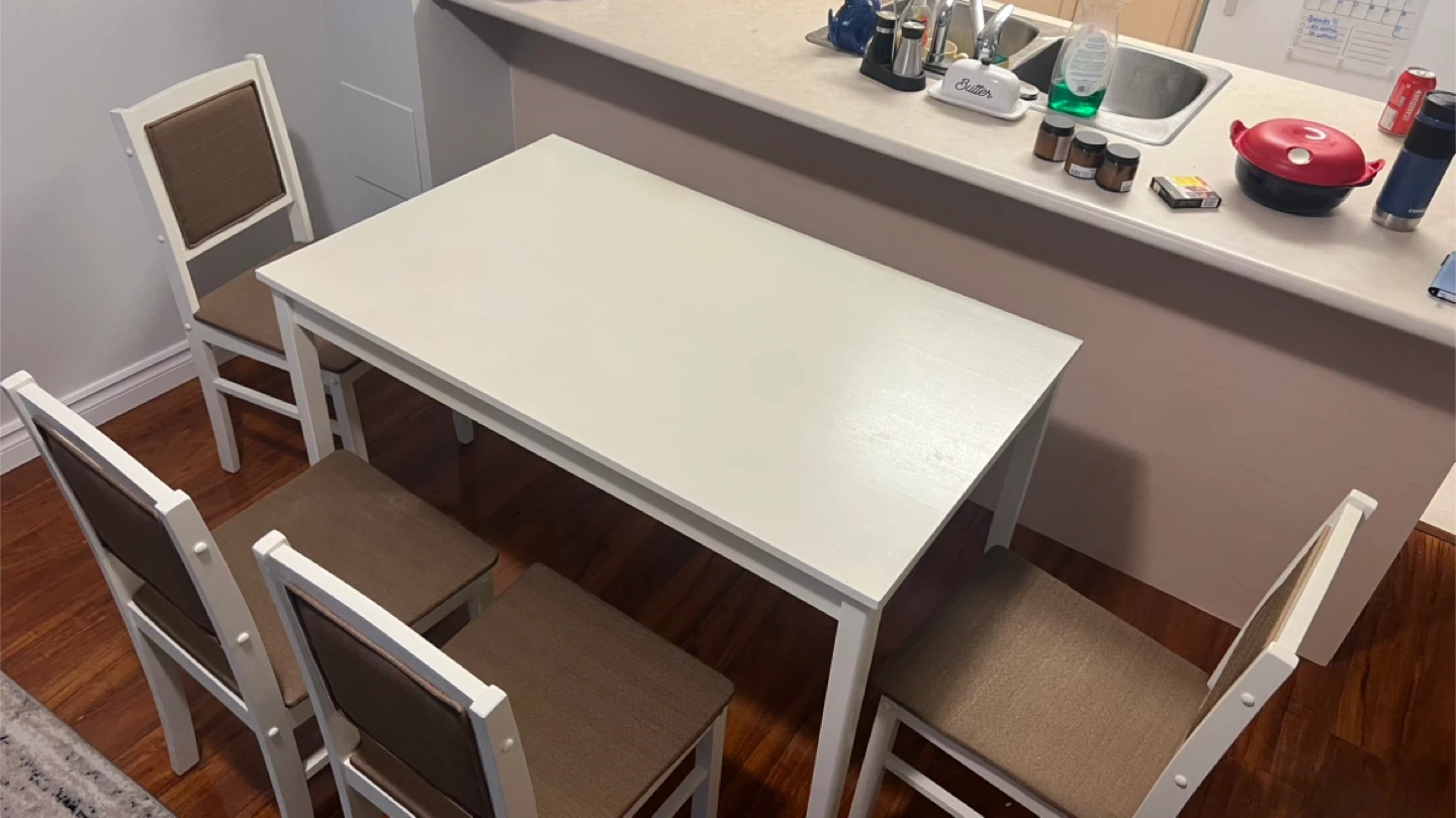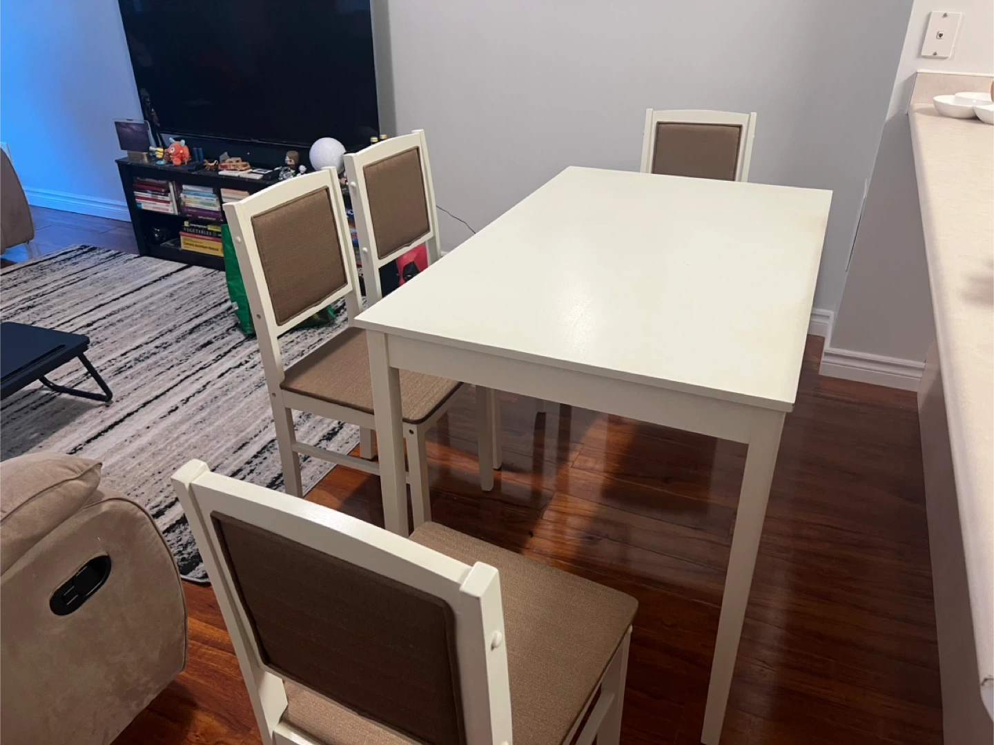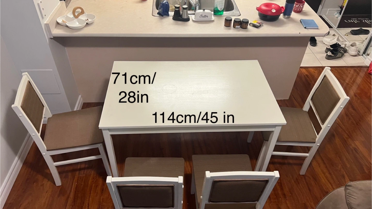 Selling my COSTWAY 5-piece dining set (table + 4 chairs) for $220. I’ve had it for just a year and it’s been very well taken care of, so it’s still in perfect condition with no scratches or damage. The table measures 45″ L × 28″ W × 30″ H, and each chair is 16″ L × 18″ W × 34″ H. It has a sturdy wooden build, a spacious tabletop, and the chairs tuck in neatly—making it great for apartments or dining areas where space matters. With its modern yet cozy style, it blends easily with any décor. Available for pick-up—message me if you’d like more pictures or details!