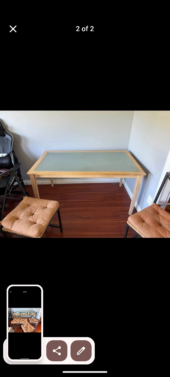 28Selling a dining table with four chairs. The table has a light wood frame and a sage green top. The chairs have a black metal frame with tan cushions. Perfect for a small dining area!