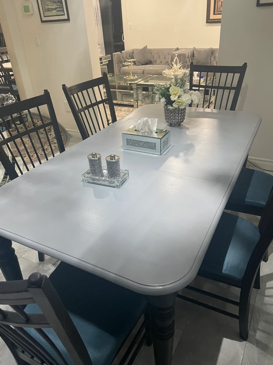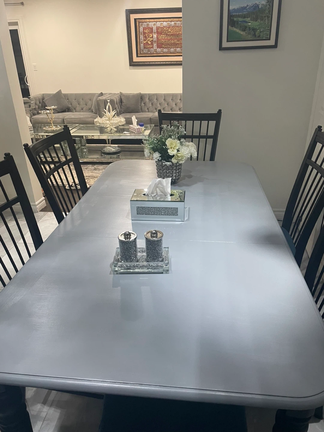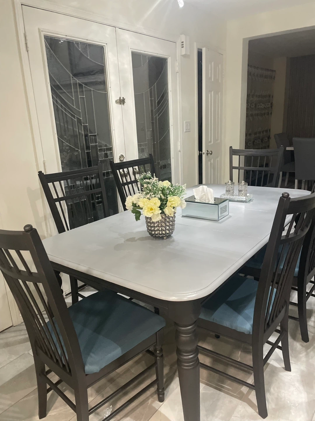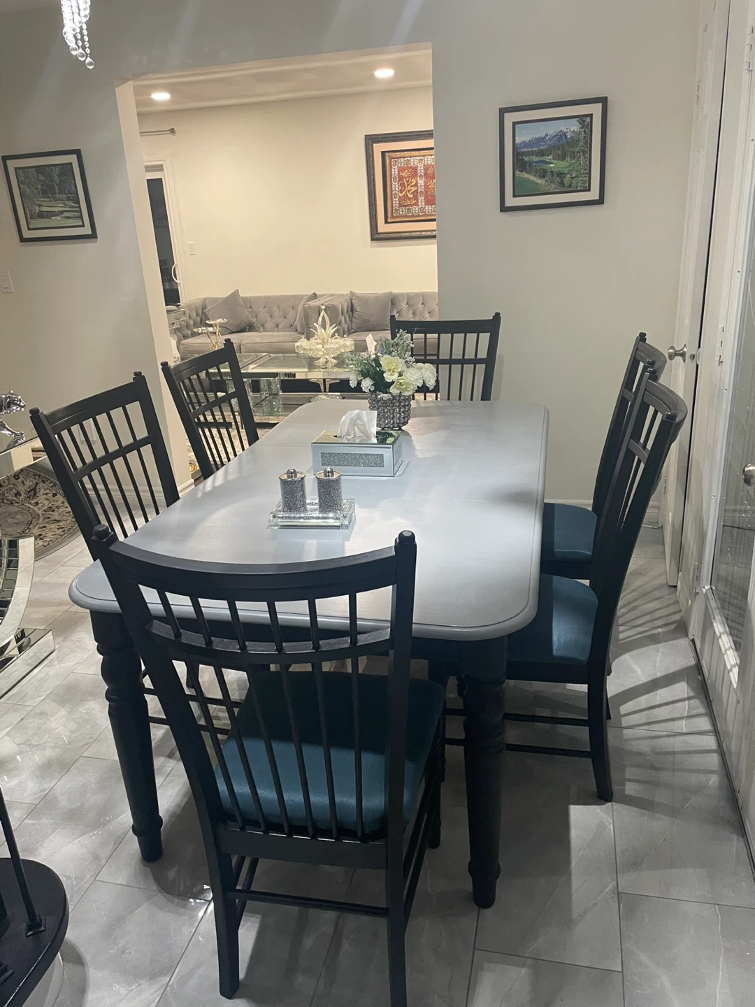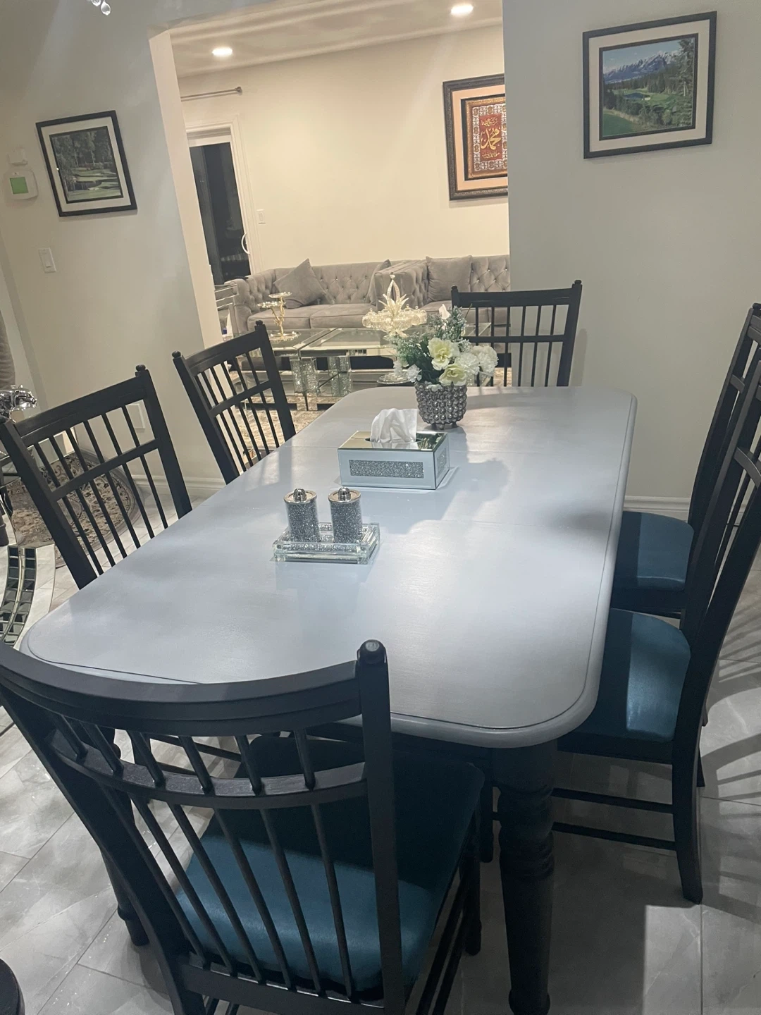 10Selling a dining table with six chairs. The table dimensions are approximately 72 inches in length, 40 inches in width, and 36 inches in height. It's a great set for family dinners or entertaining guests!