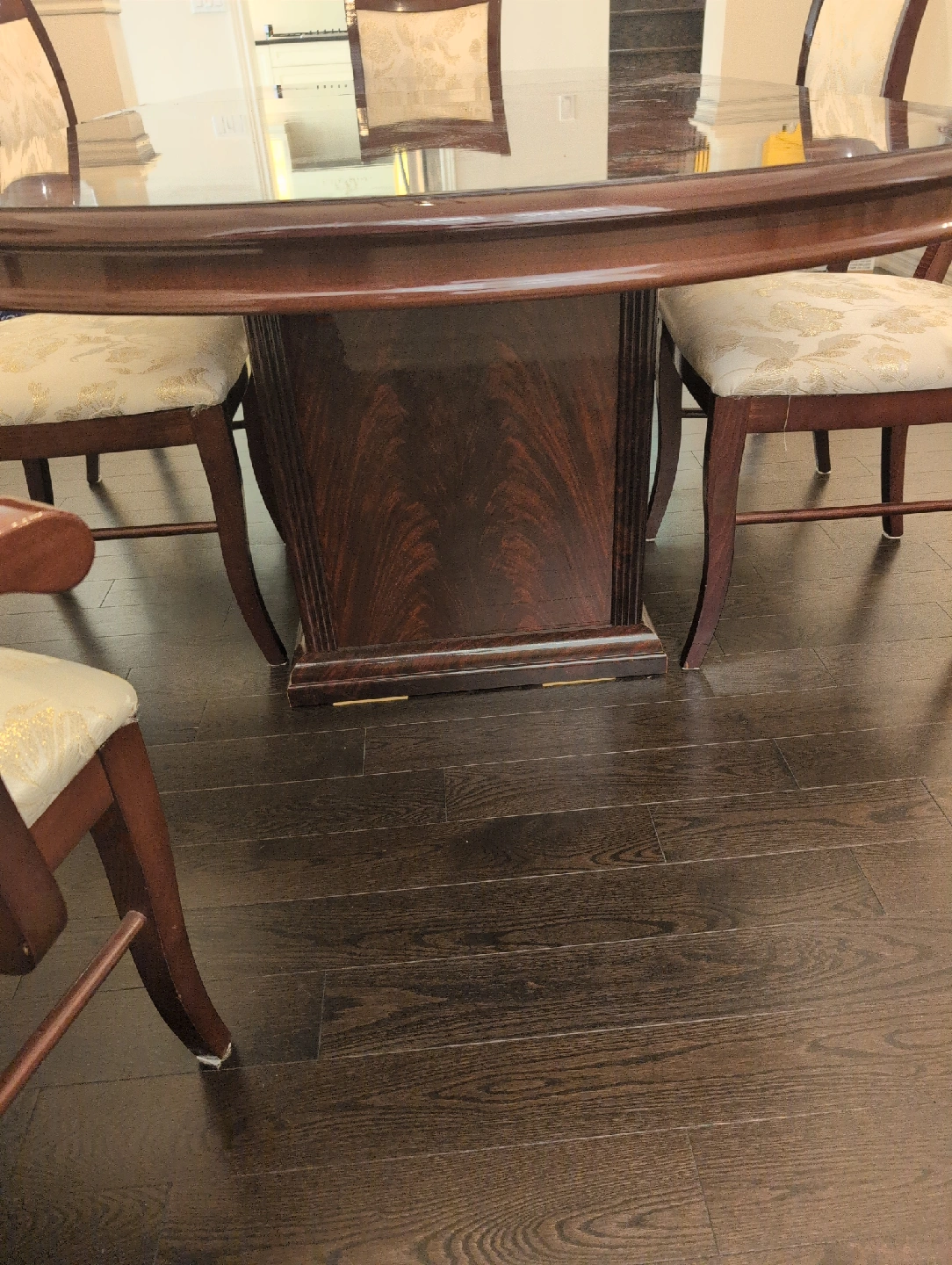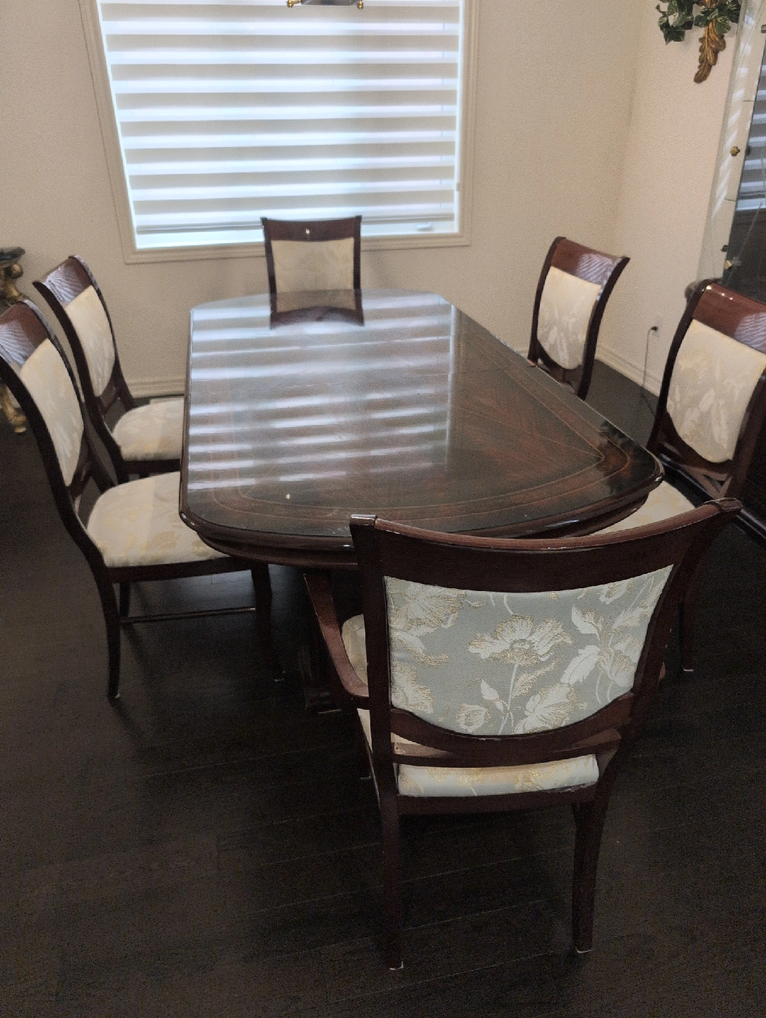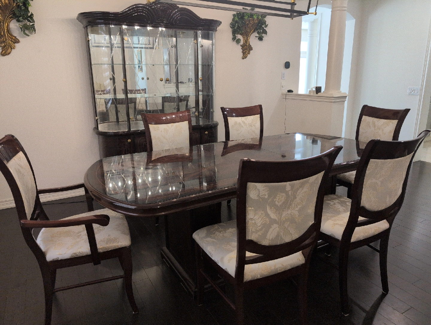 10Selling a beautiful dining table with six chairs and a matching curio cabinet. The set is in great condition and would be a lovely addition to any dining room. The table has a rich, dark wood finish and the chairs are upholstered with a floral pattern. The curio cabinet offers ample storage and display space for your treasured items. Small amount of damage in table top as shown on pics. Removable stain on one of chairs as shown on pics. available for pick up. moving soon. 88" x 41" x 31"