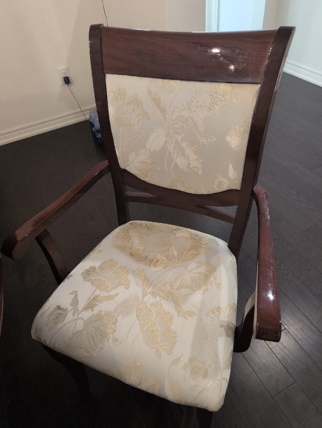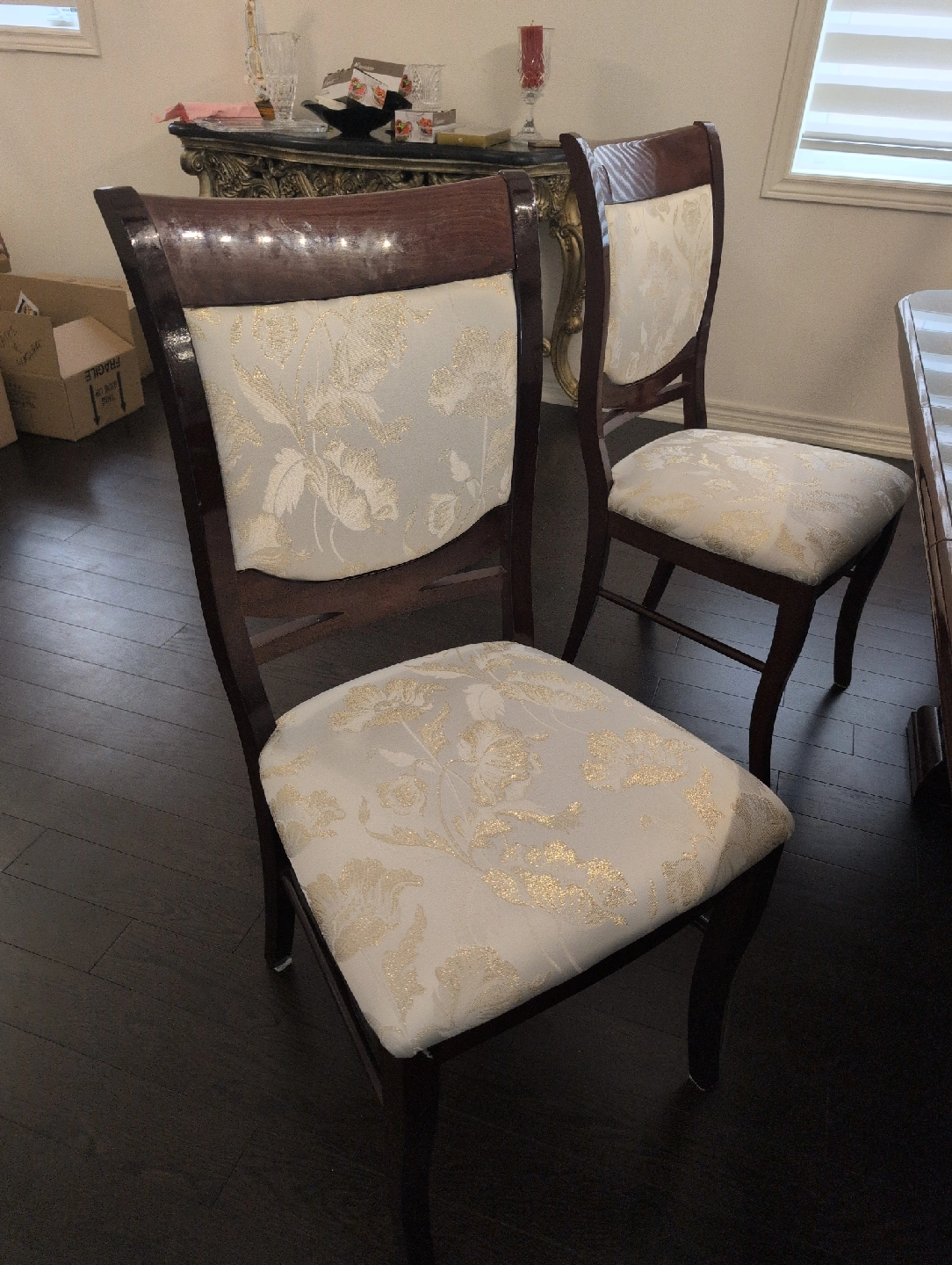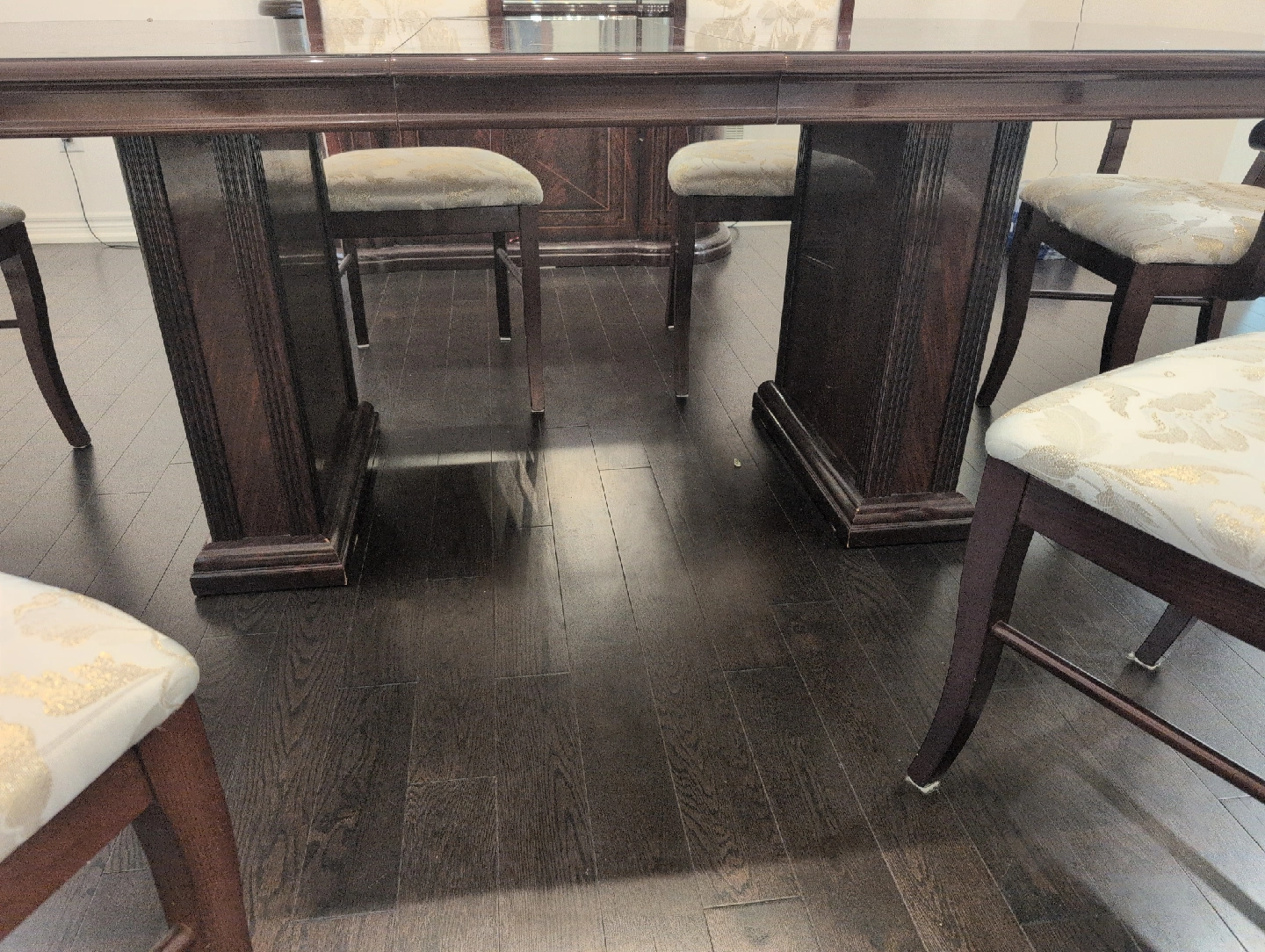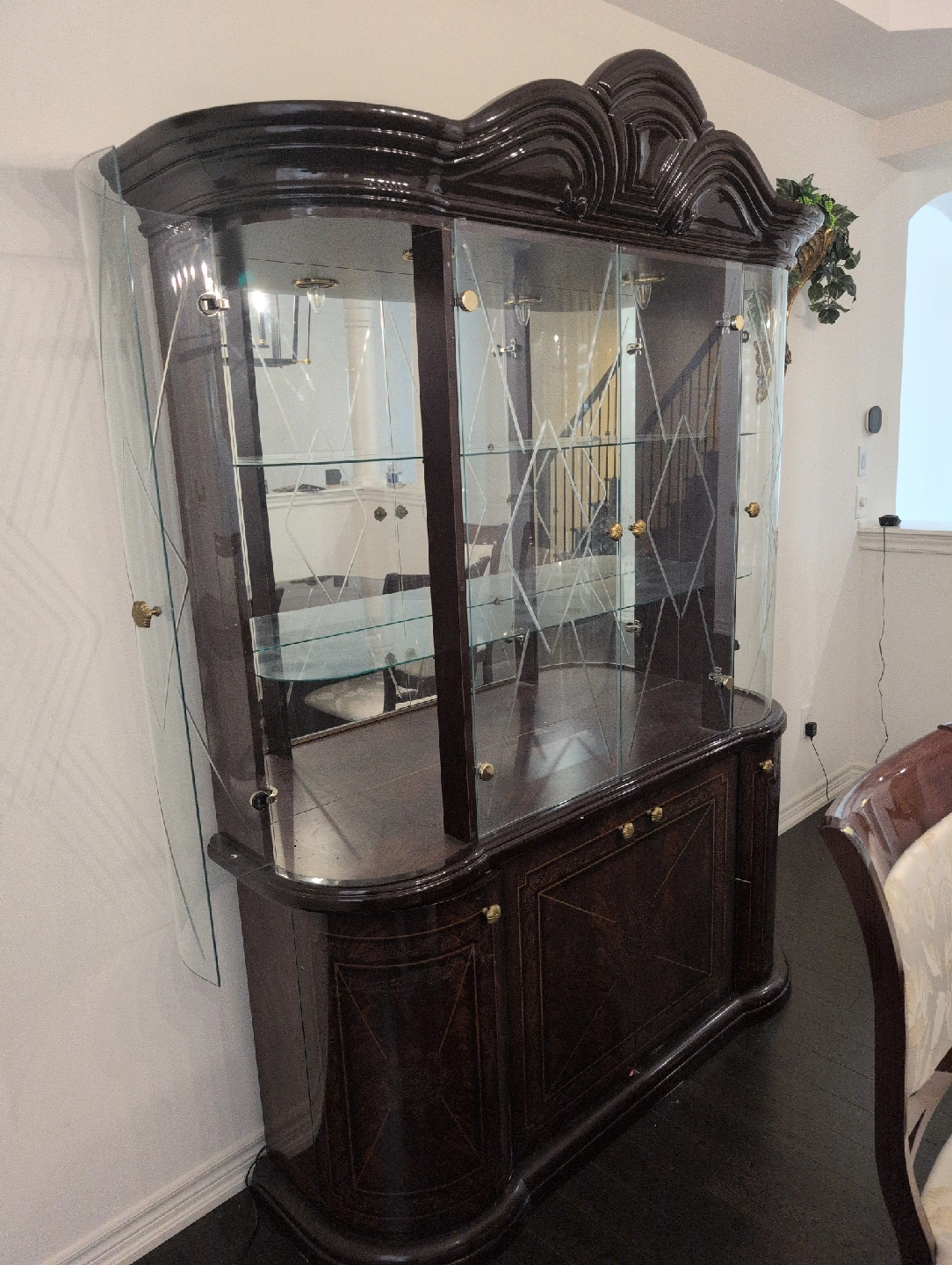 10Selling a beautiful dining table with six chairs and a matching curio cabinet. The set is in great condition and would be a lovely addition to any dining room. The table has a rich, dark wood finish and the chairs are upholstered with a floral pattern. The curio cabinet offers ample storage and display space for your treasured items. Small amount of damage in table top as shown on pics. Removable stain on one of chairs as shown on pics. available for pick up. moving soon. 88" x 41" x 31"