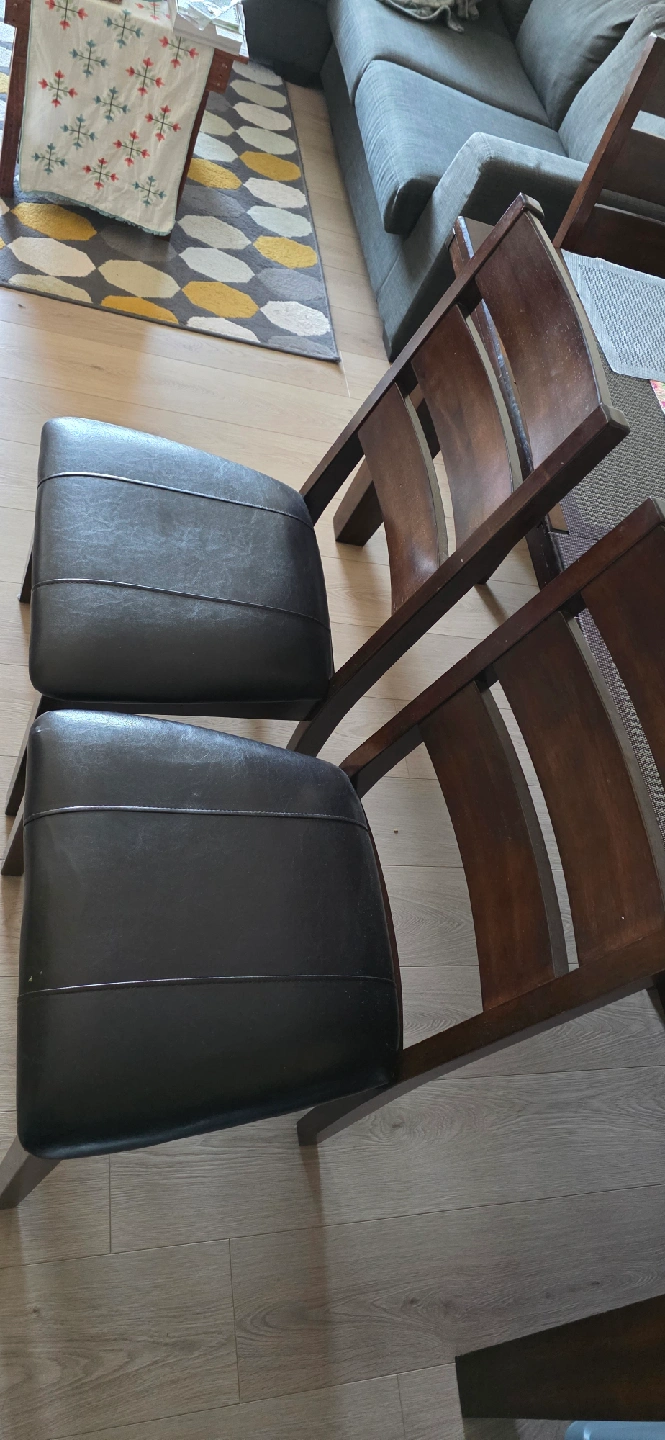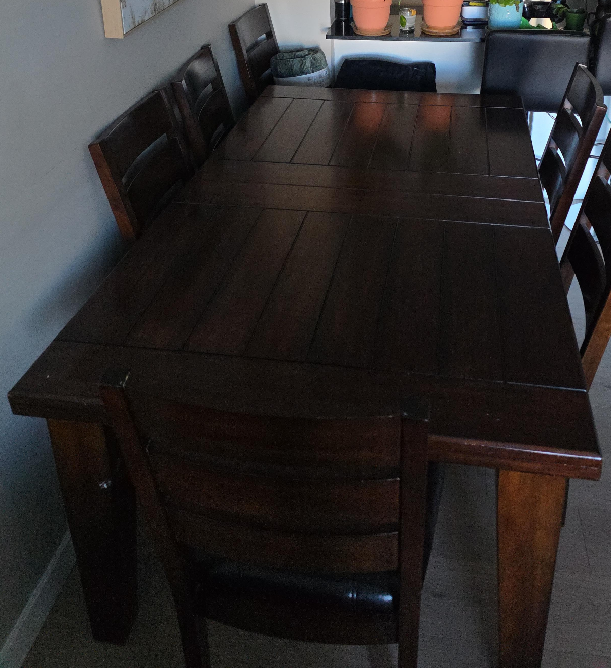 15Dark wood dining table with six matching chairs available. This set is perfect for family dinners or entertaining guests. The table and chairs are sturdy and in good condition. A great addition to any dining room!