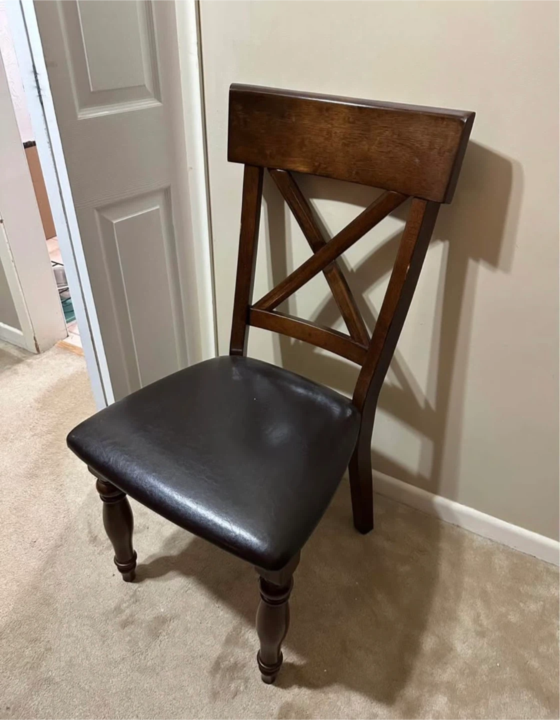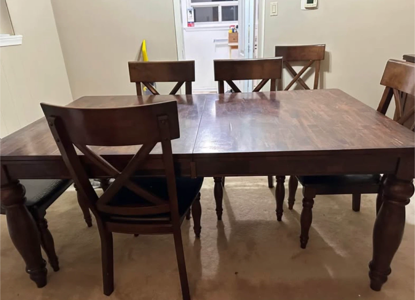 76Selling a dining table with six chairs. The set is in good condition and has a classic design with a dark wood finish and black leather seats. Perfect for family dinners or gatherings! Some Chairs need screws replaced or best offer