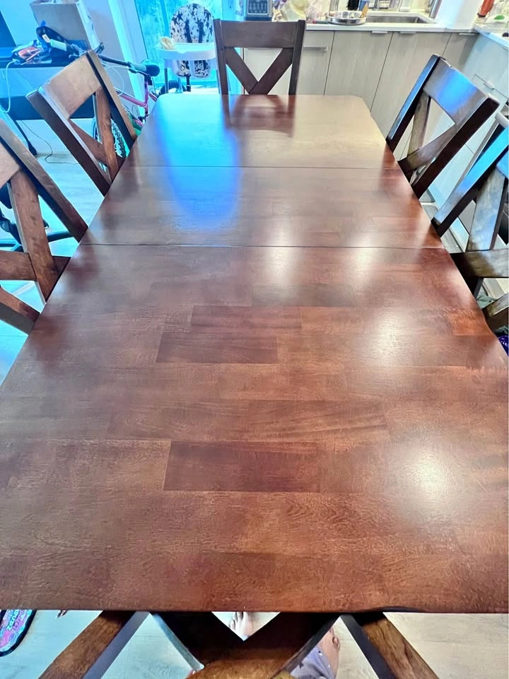 10Extendable dining table with 6 sturdy chairs. No scratches, no breaks — very solid and well cared for. Table extends from 60” to 78”. Originally $1,195, selling for just $340 as part of a moving-out sale. Pickup only.