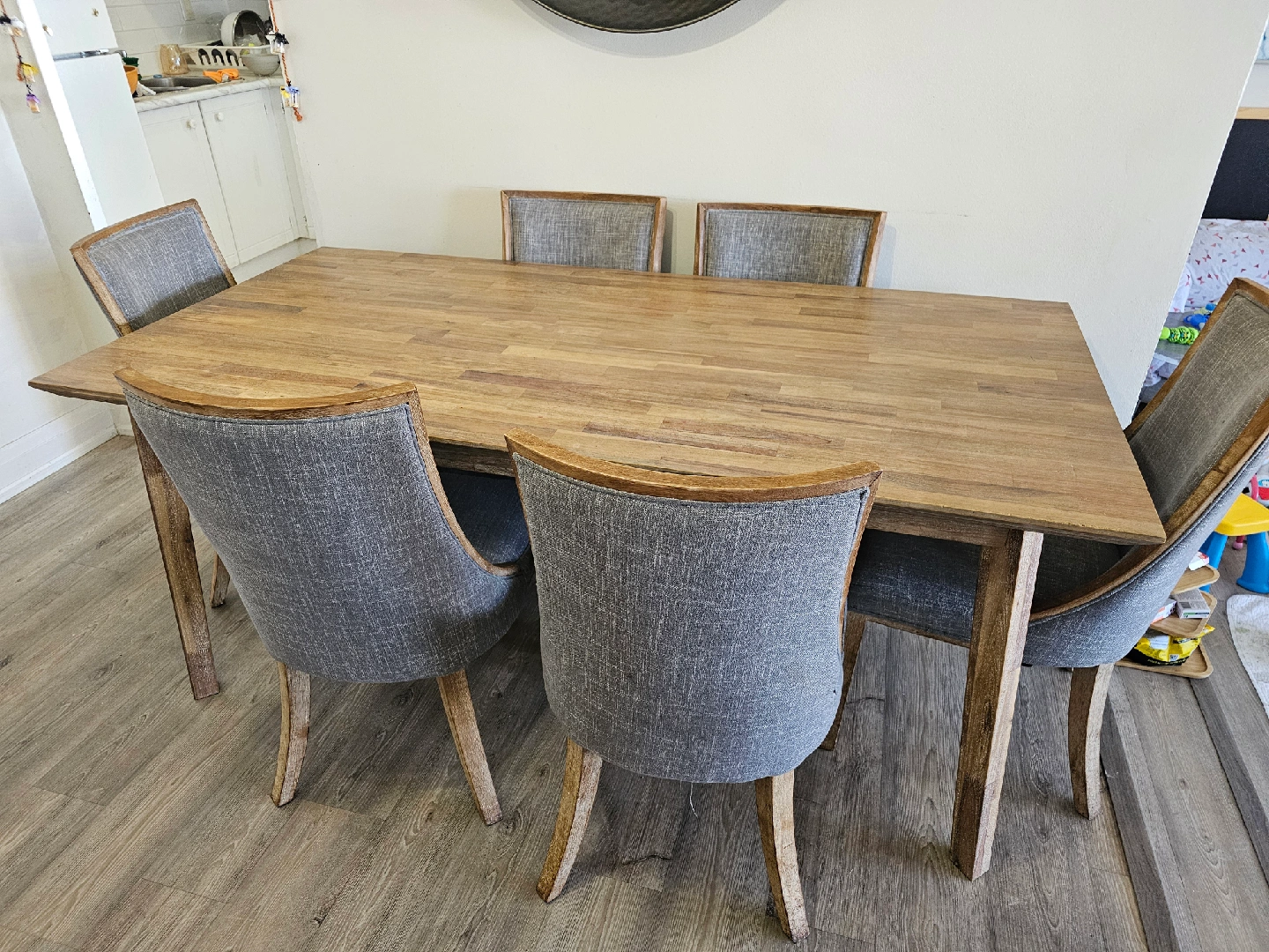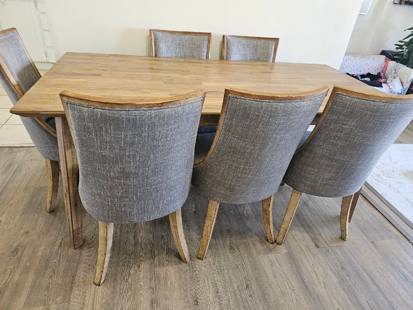 Selling a dining table with six chairs. The table has a light wood finish, and the chairs are upholstered in a gray fabric. The set is in good condition and would be a great addition to any dining room