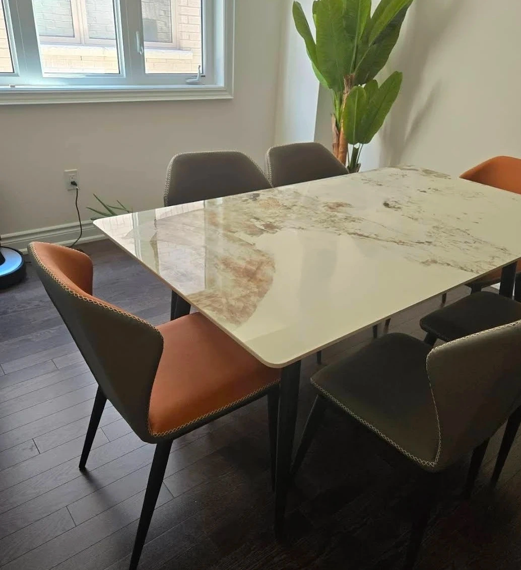 120Selling a dining table with six chairs. The table has a unique marble-like top and sleek black legs. The chairs are a mix of brown and orange, with a stylish design. Perfect for a modern dining room!