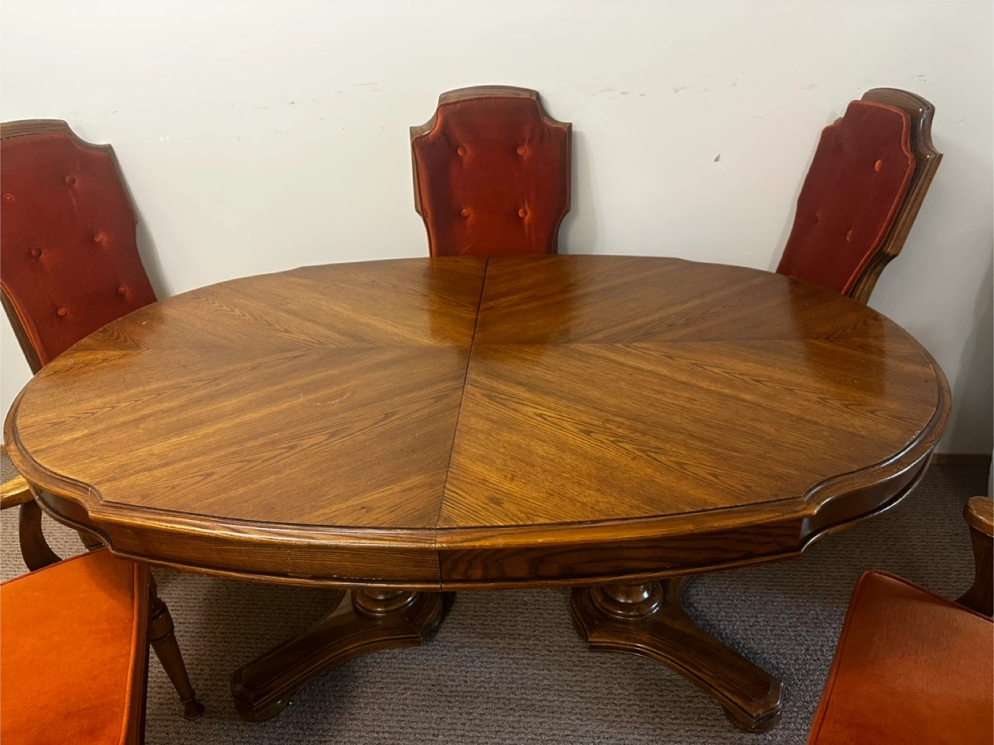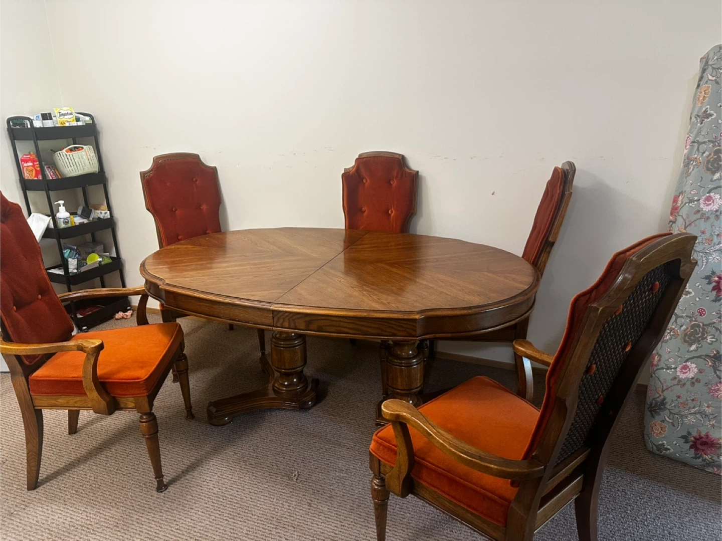 This is a beautiful dining table that comes with six matching chairs. The table has a unique wood grain pattern and a sturdy base. The chairs are upholstered in a lovely red fabric. A good addition to any dining room! The table can be extended to 10 ft for bigger parties and it is easy for transporting. Pick up only