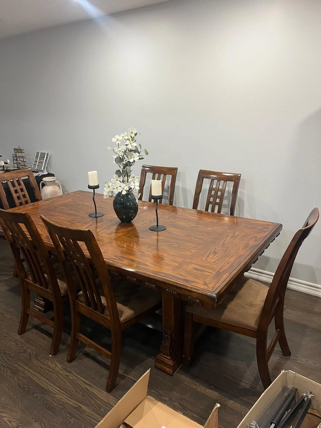Selling a solid wood dining table with six chairs. It's a beautiful set that would look great in any dining room. The table is sturdy and in good condition, with a rich wood finish. Chairs have padded seats for extra comfort. Perfect for family dinners or entertaining guests!