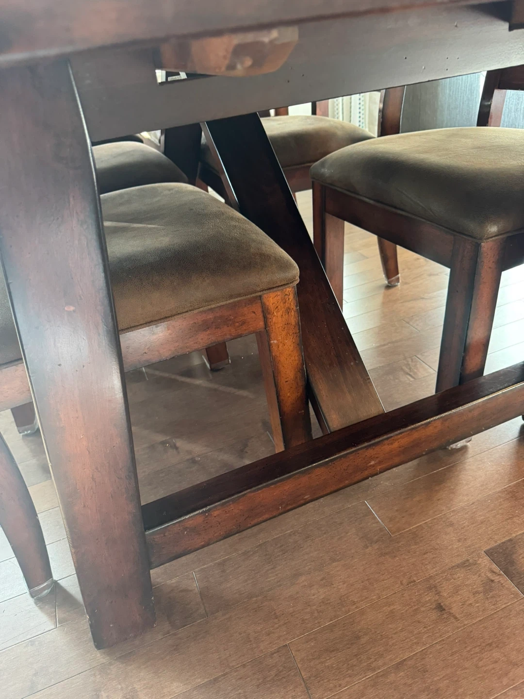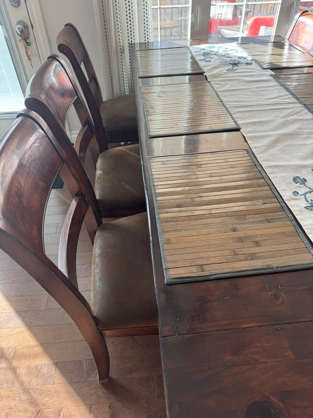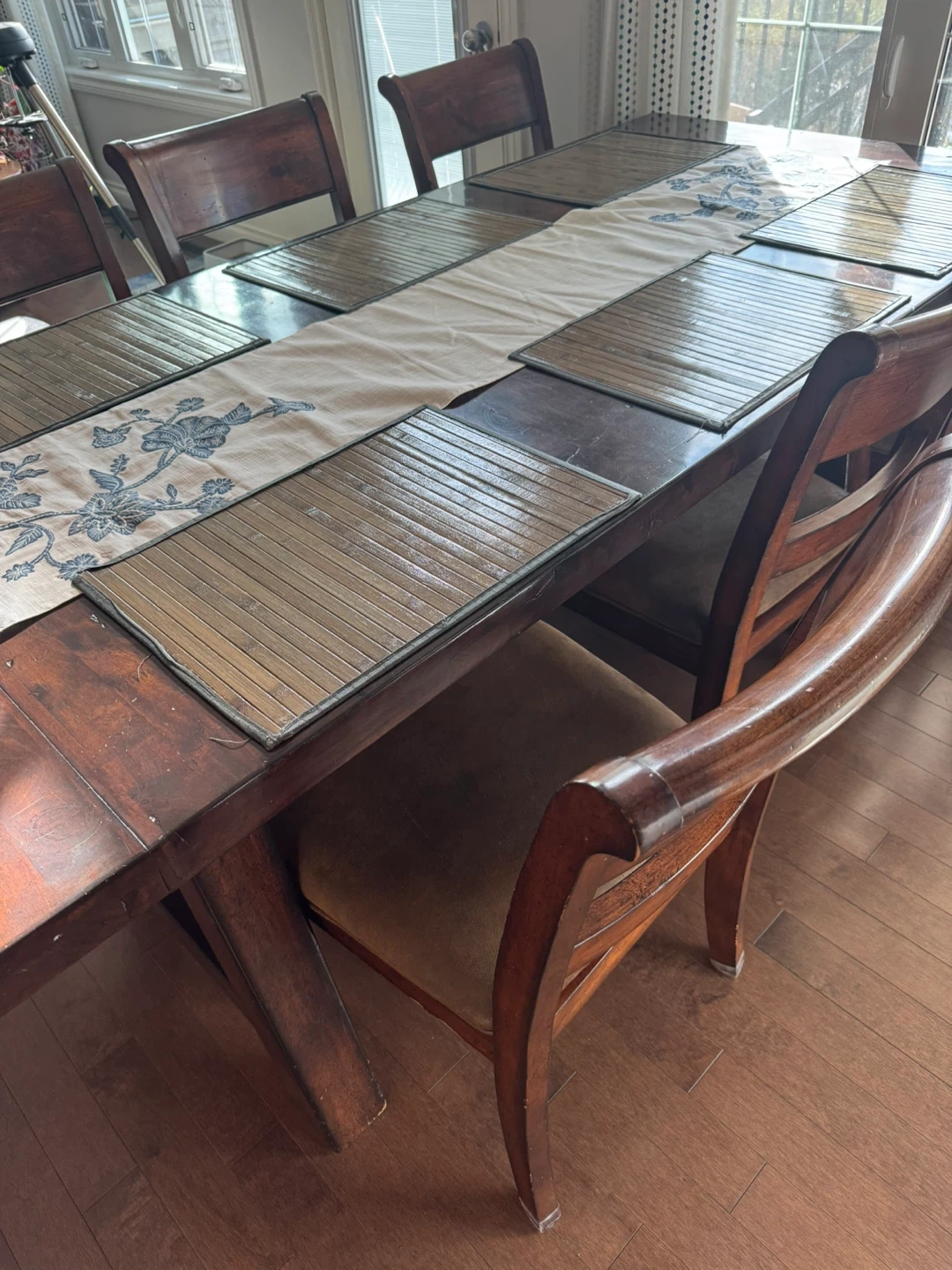 24Dining table with six chairs. The table and chairs are made of wood, with a dark brown finish. The chair seats are upholstered with a brown fabric, it is in good condition. It has 2 leaves and can easily fit 10 people. W-40inches, L-84.5 inches with 1 leaf. It extends another 13 inches with other leaf.