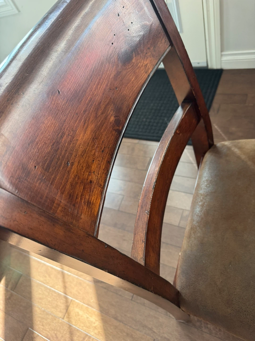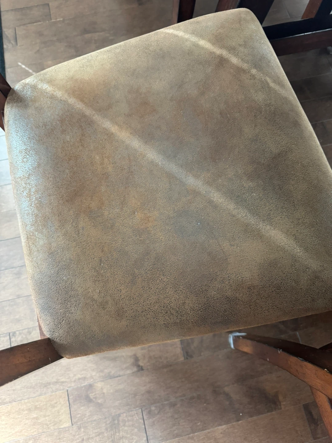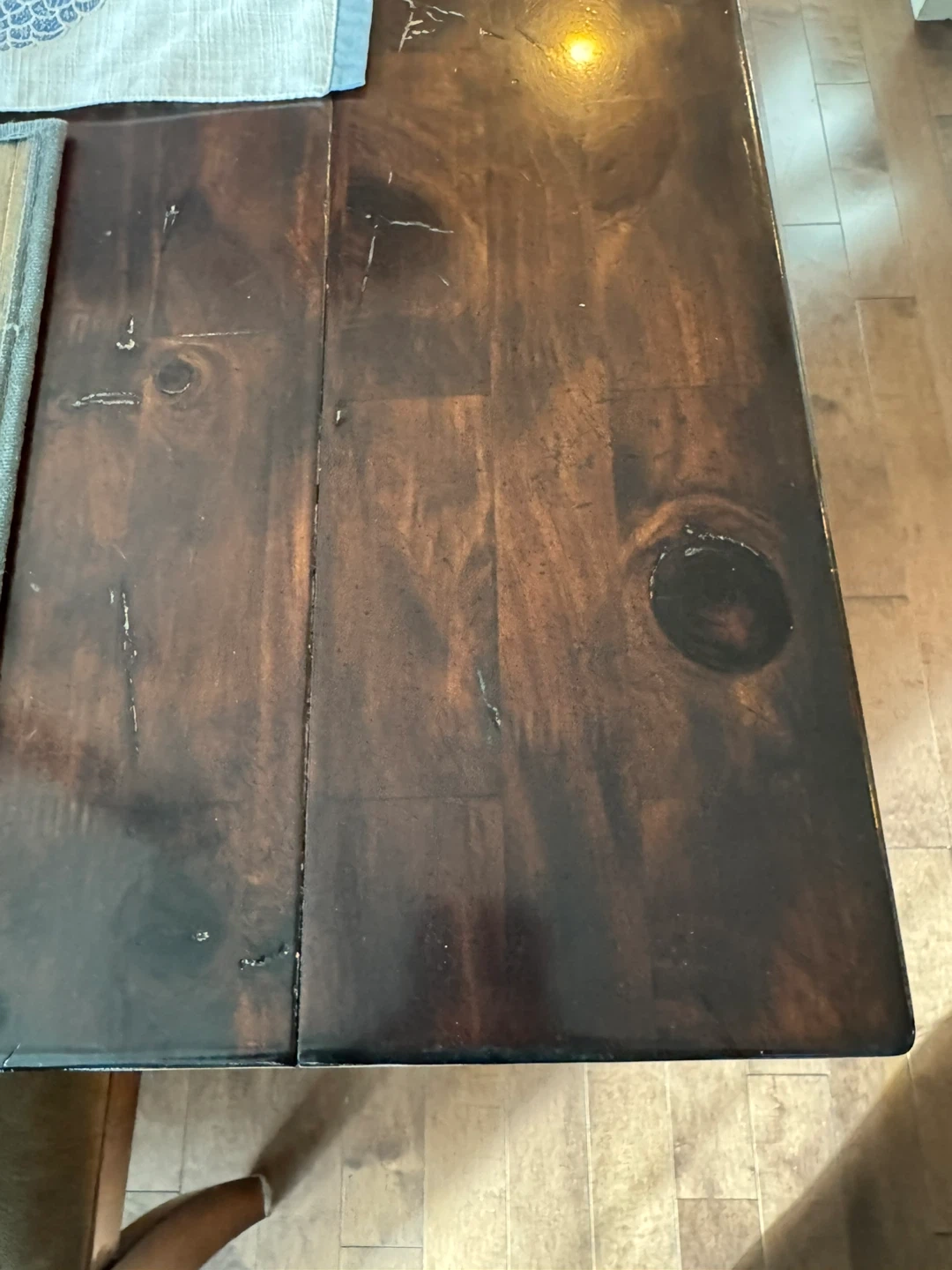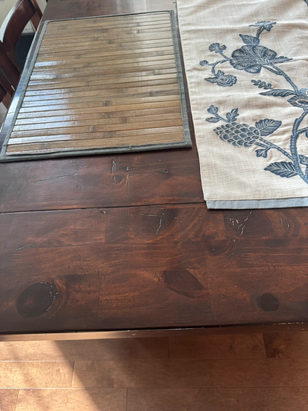 24Dining table with six chairs. The table and chairs are made of wood, with a dark brown finish. The chair seats are upholstered with a brown fabric, it is in good condition. It has 2 leaves and can easily fit 10 people. W-40inches, L-84.5 inches with 1 leaf. It extends another 13 inches with other leaf.