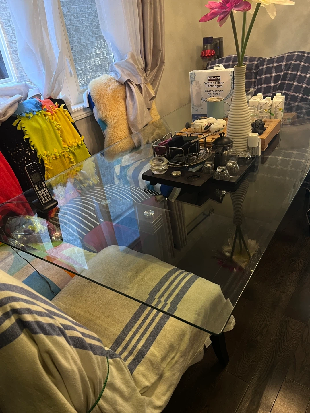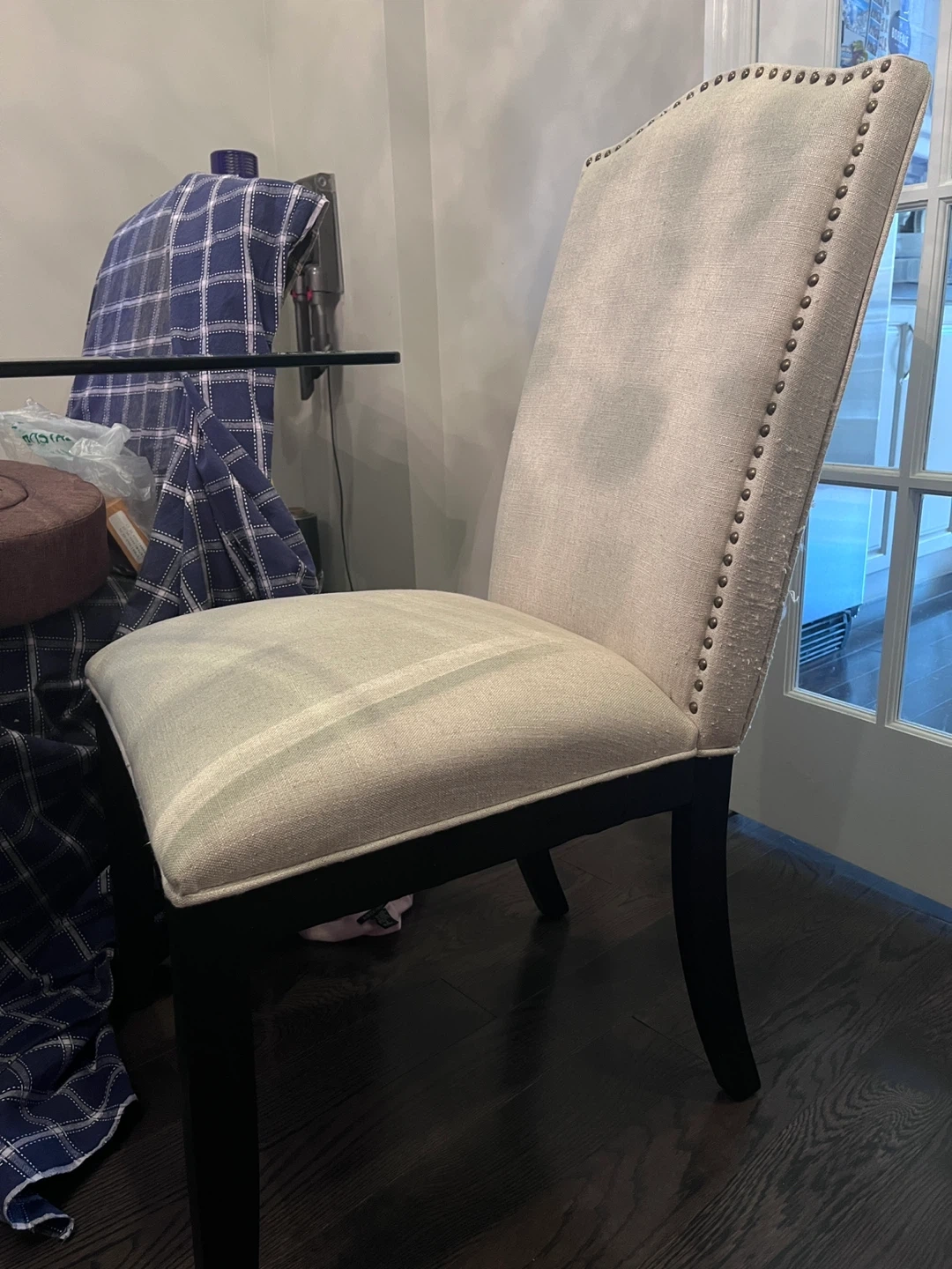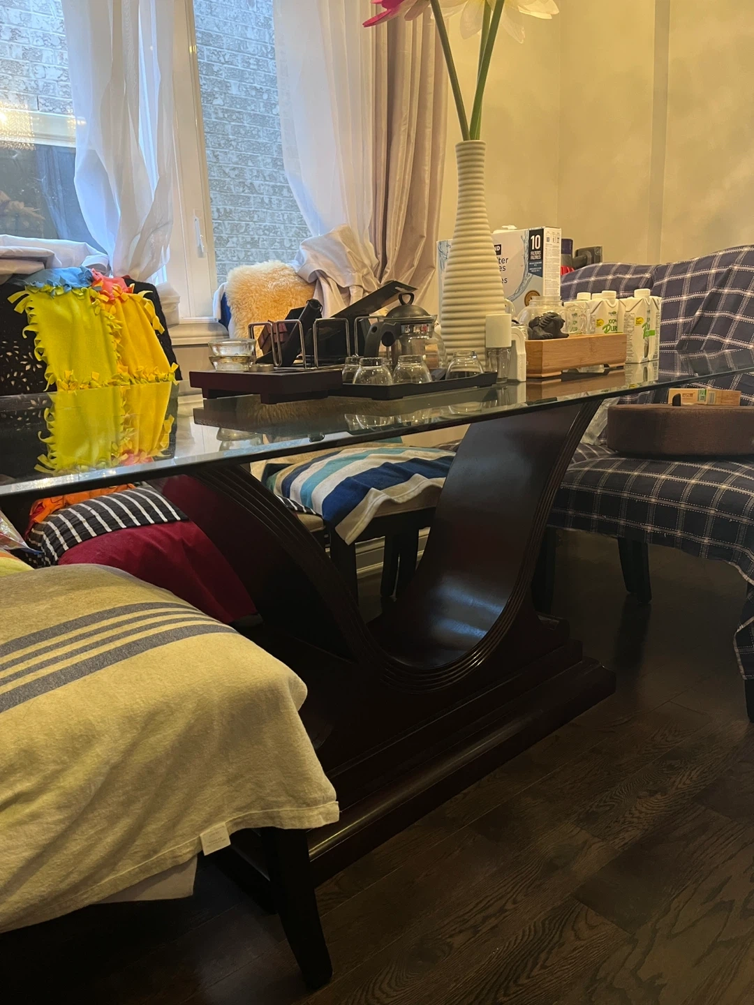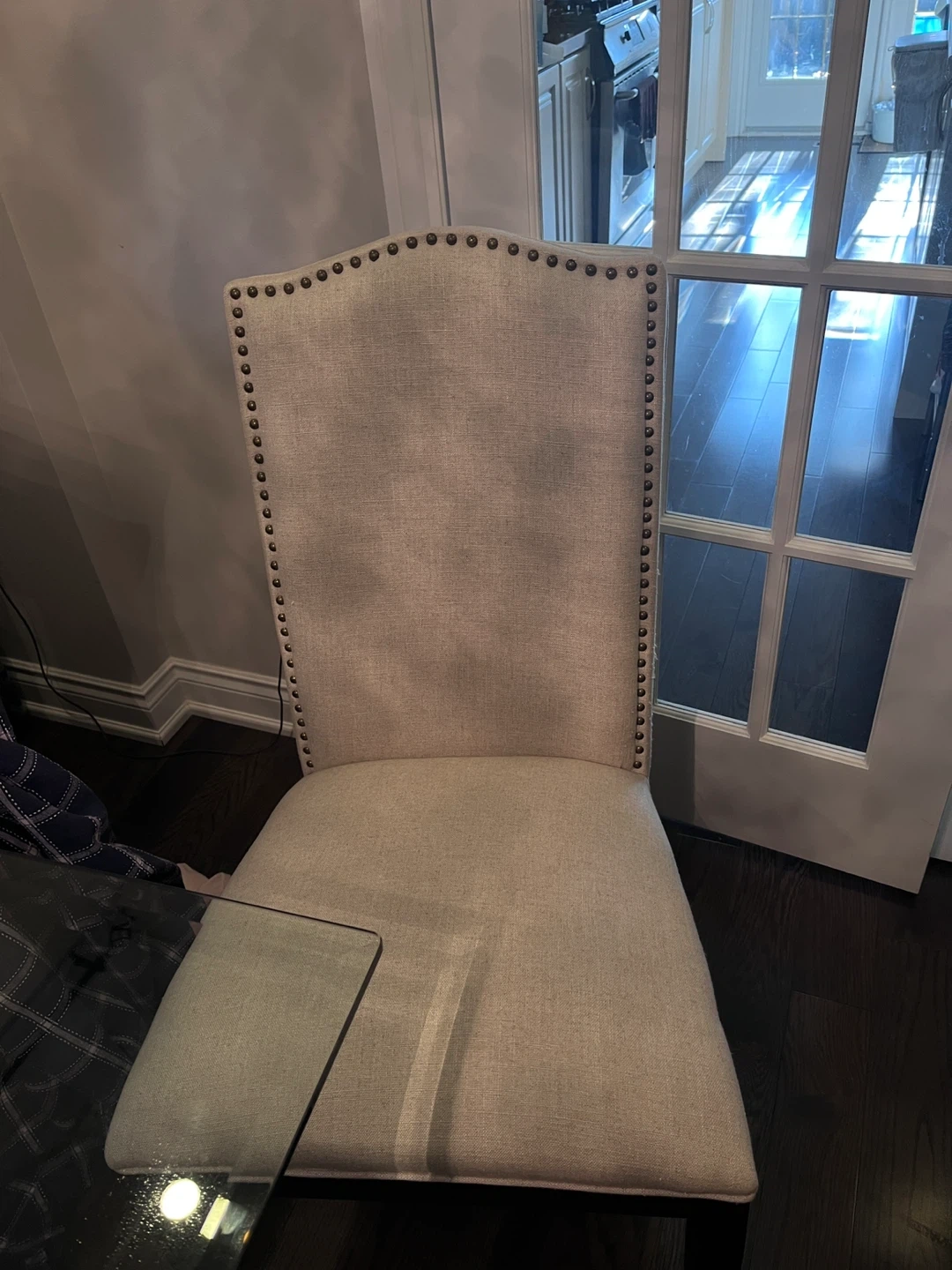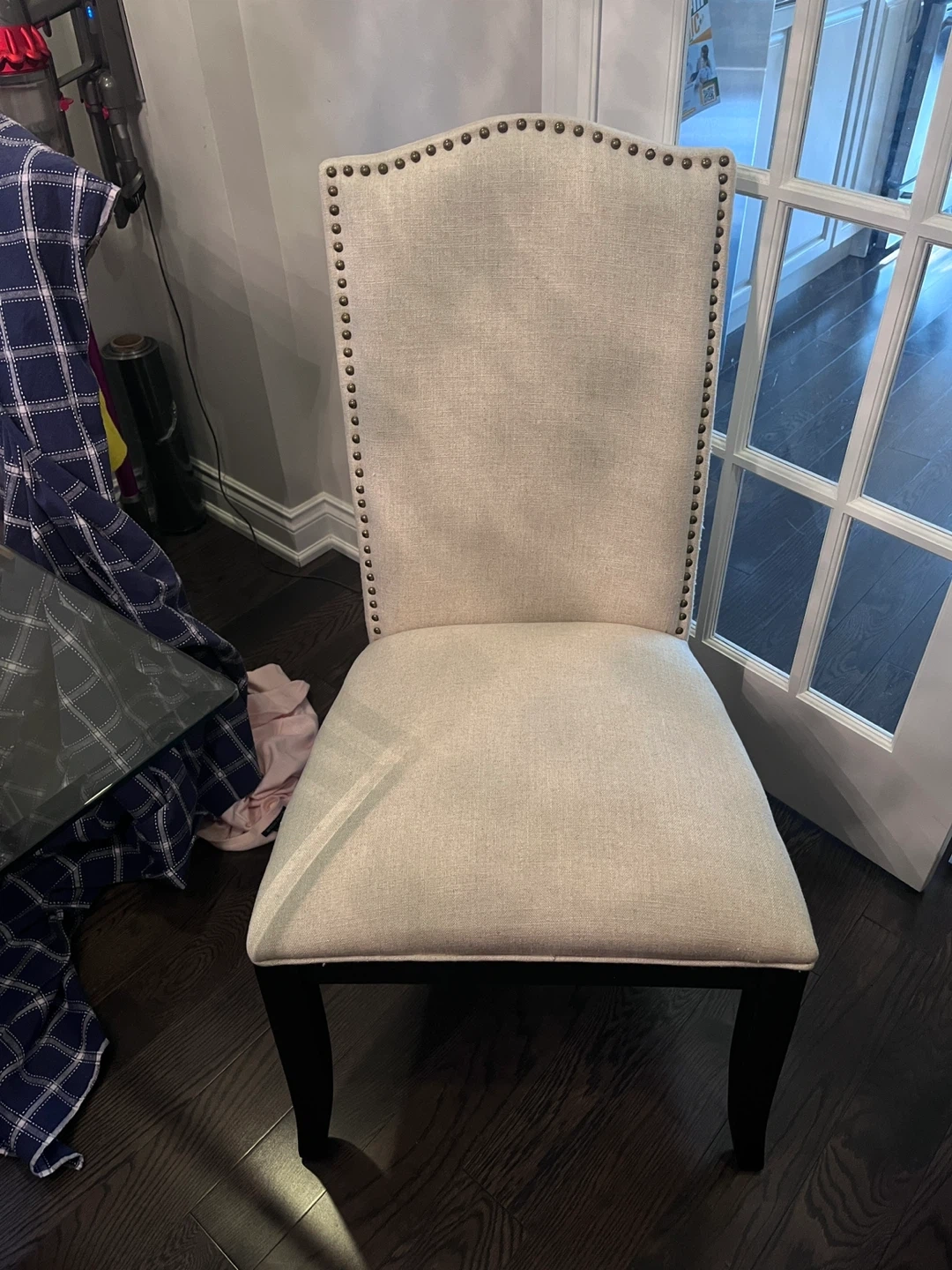 41Selling a dining table with six upholstered dining chairs. The table has a glass top and a dark wood base. The chairs are upholstered with a neutral fabric and have a nailhead trim. They would look great in your dining room! Some chairs in the back has fixable scratches