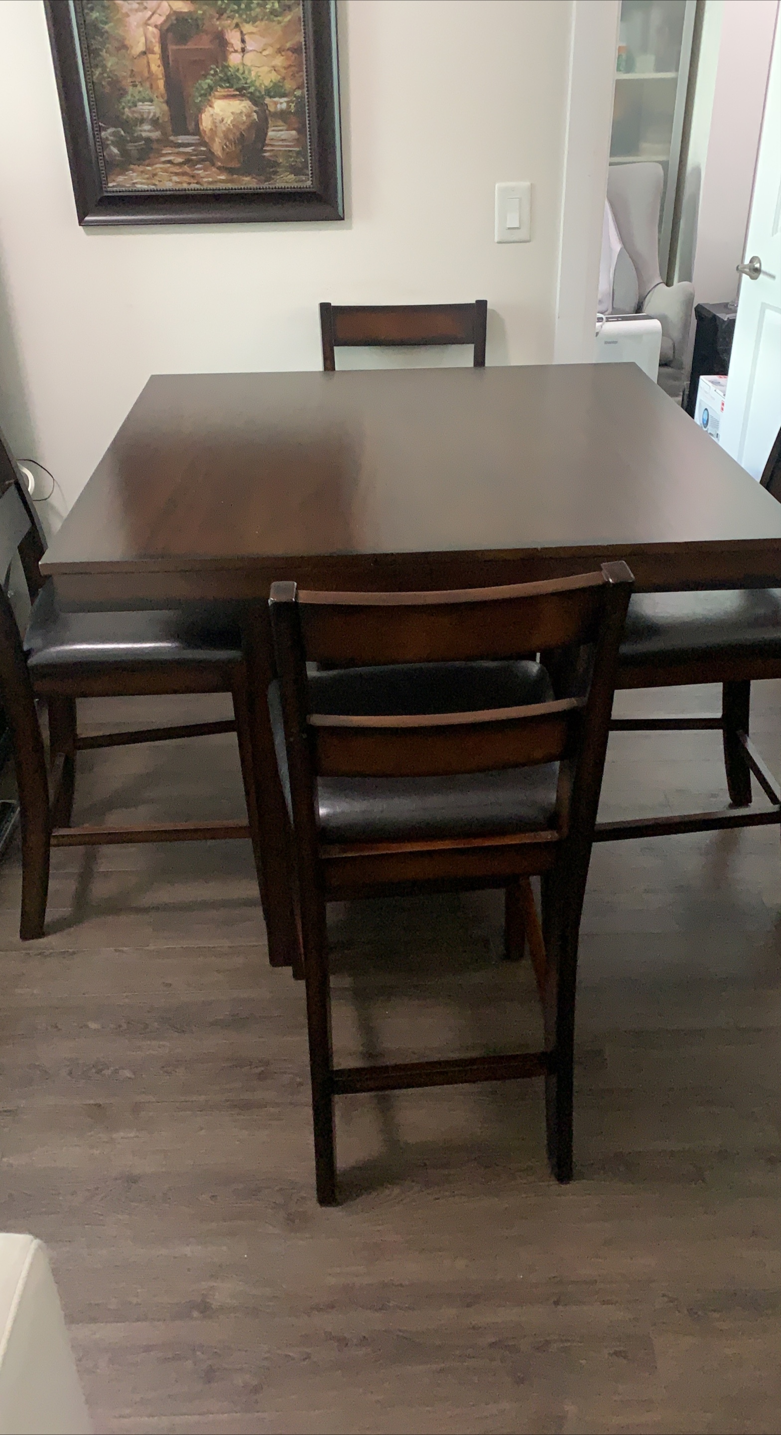 Selling a dining table with four chairs. The table and chairs are a dark brown colour with black leather seats. Perfect for a small dining room or kitchen!
