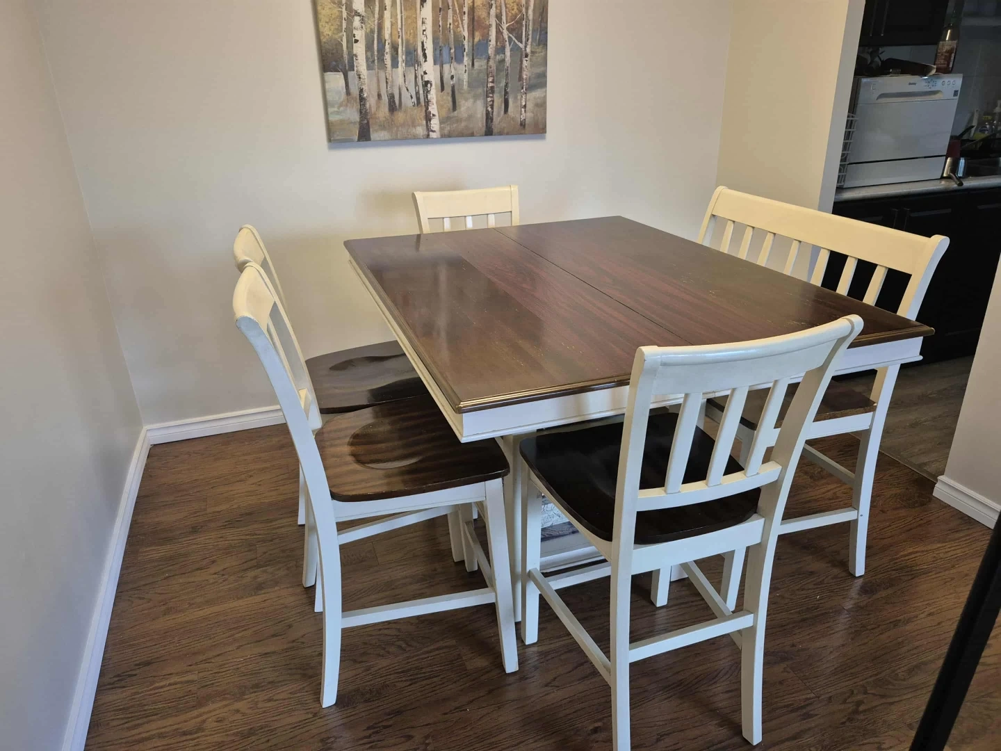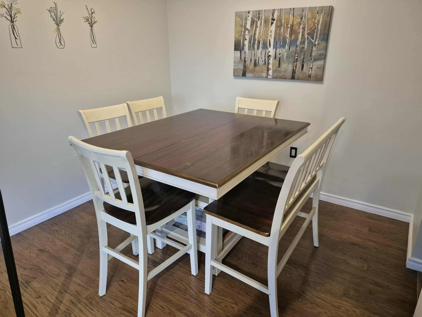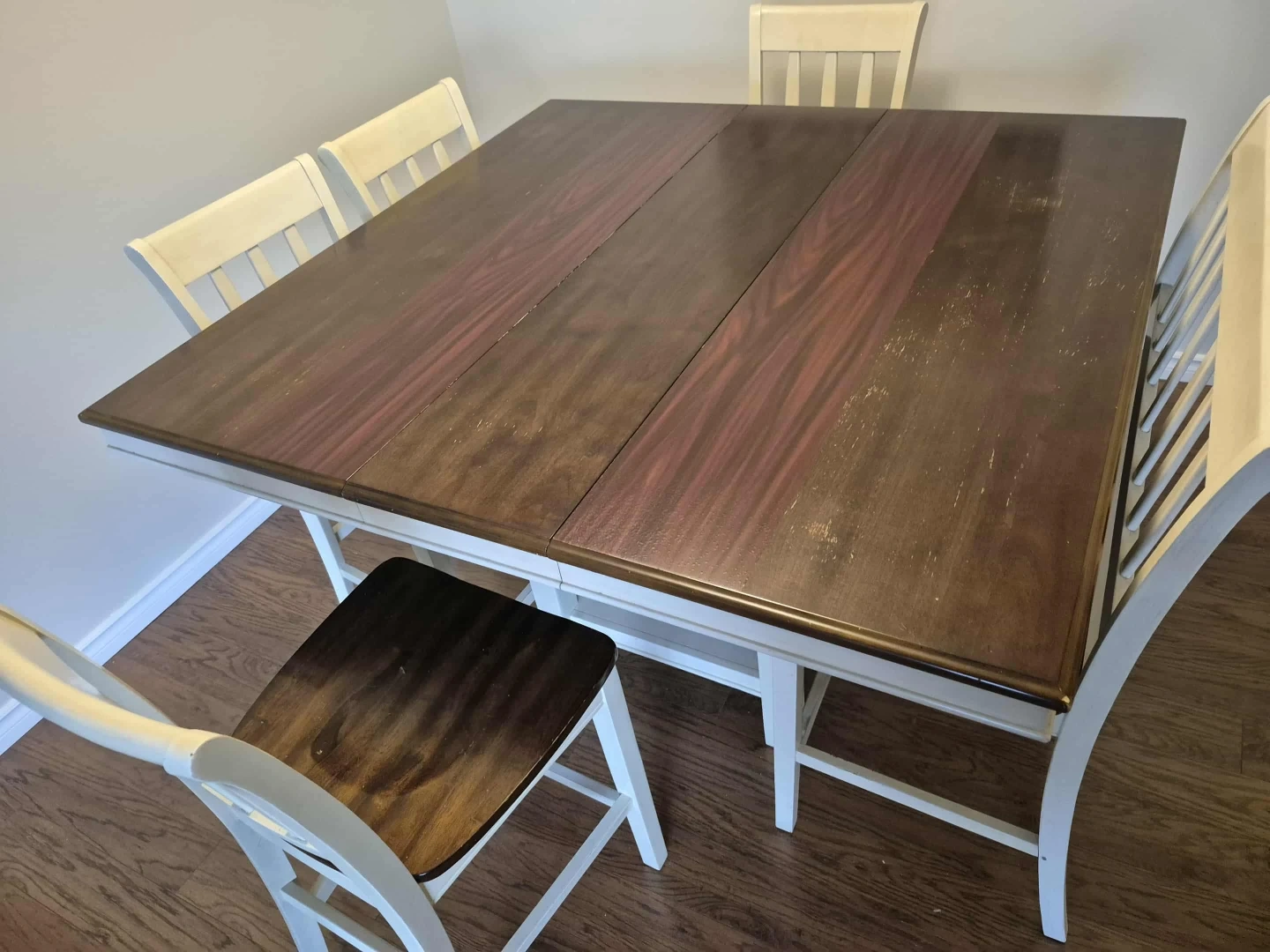 26Selling a dining table with a leaf and four chairs. The table is a dark wood colour with a white base, and the chairs are white with dark wood seats. It's in good condition and perfect for a family or small gathering