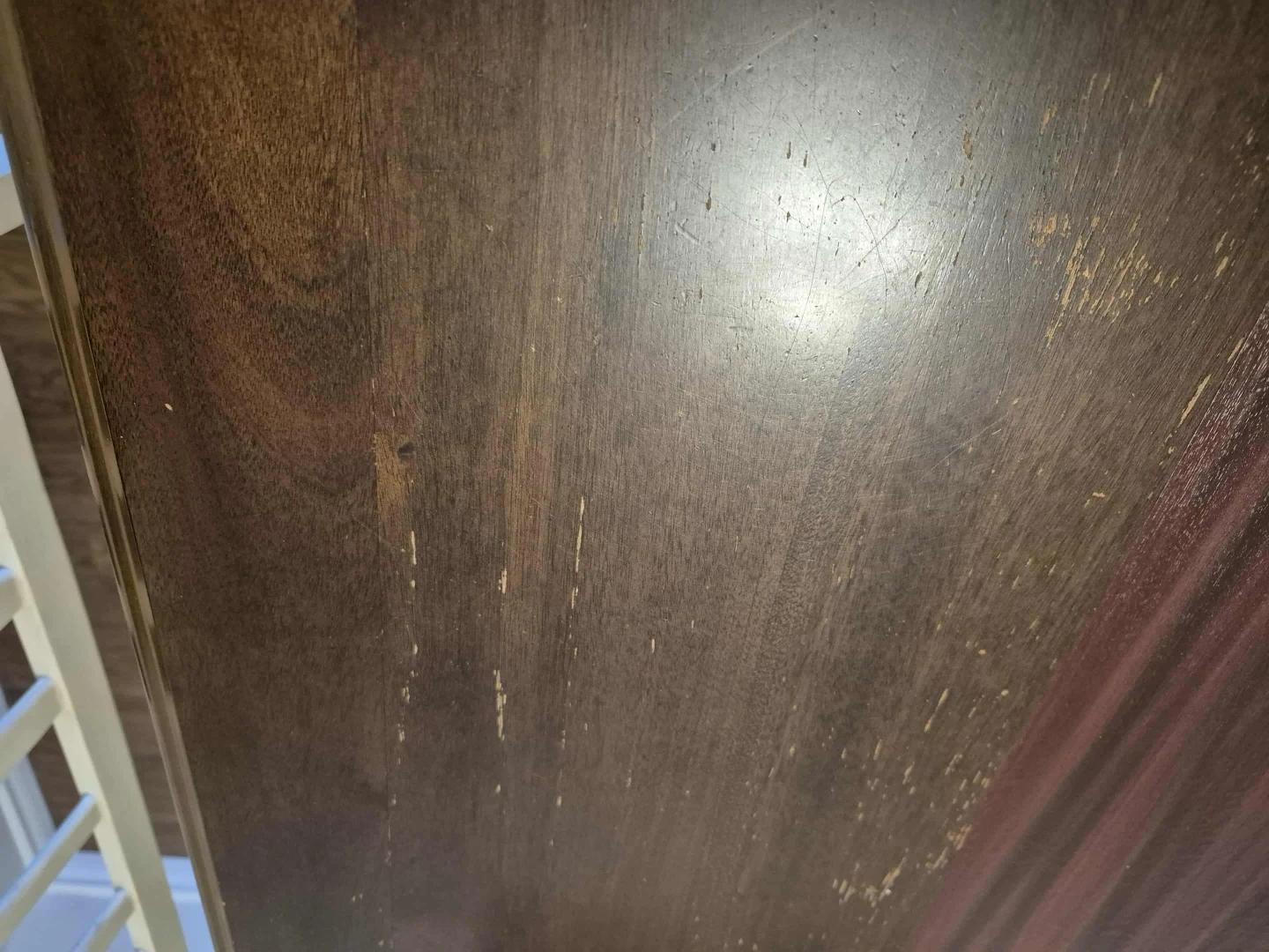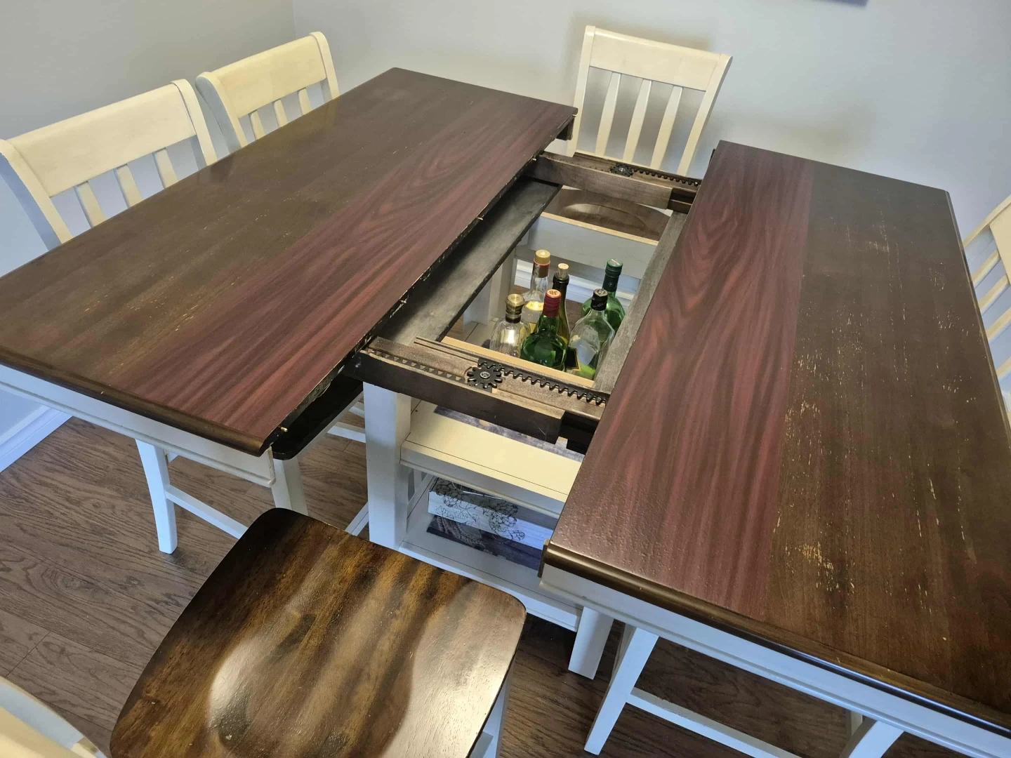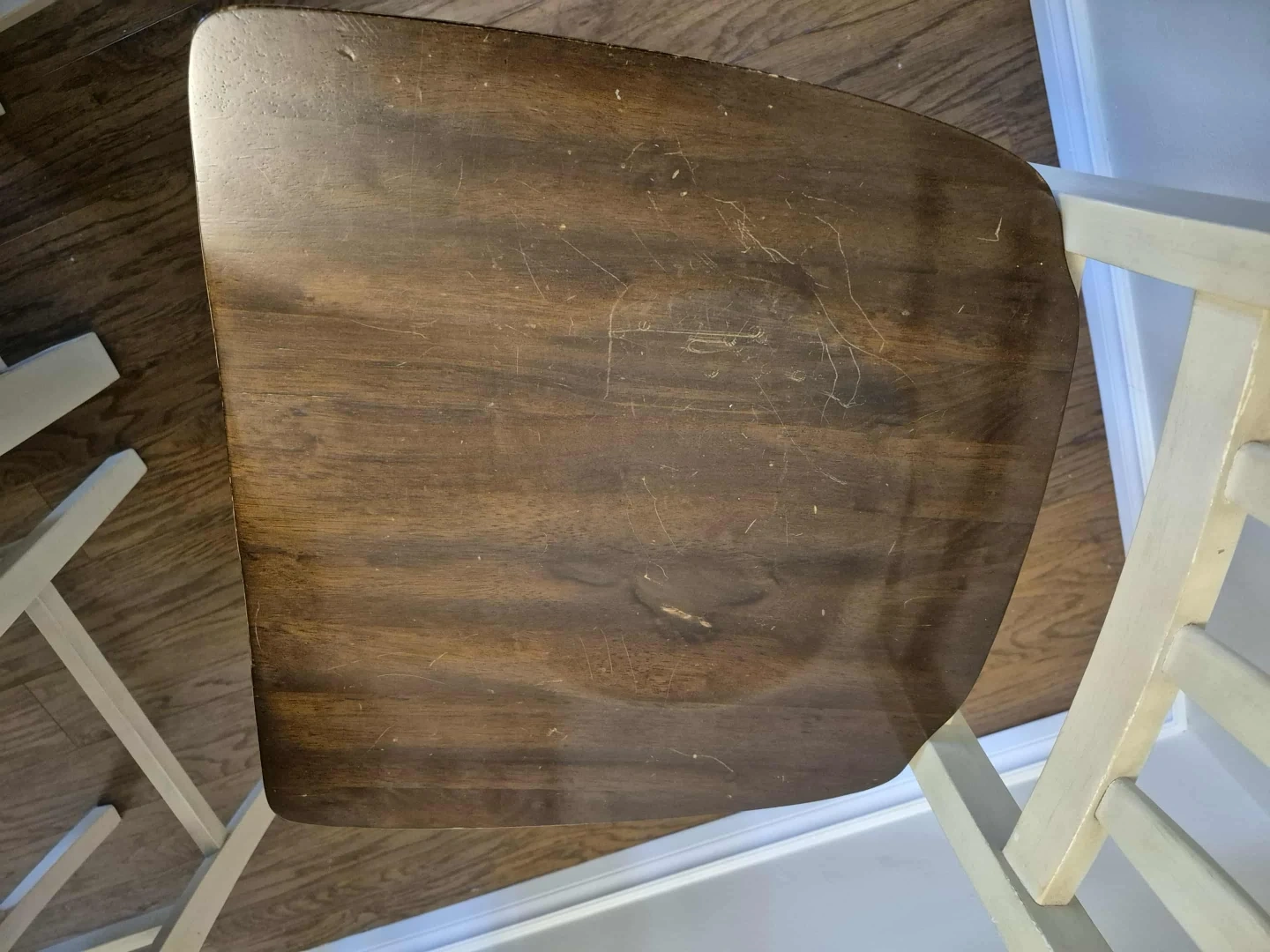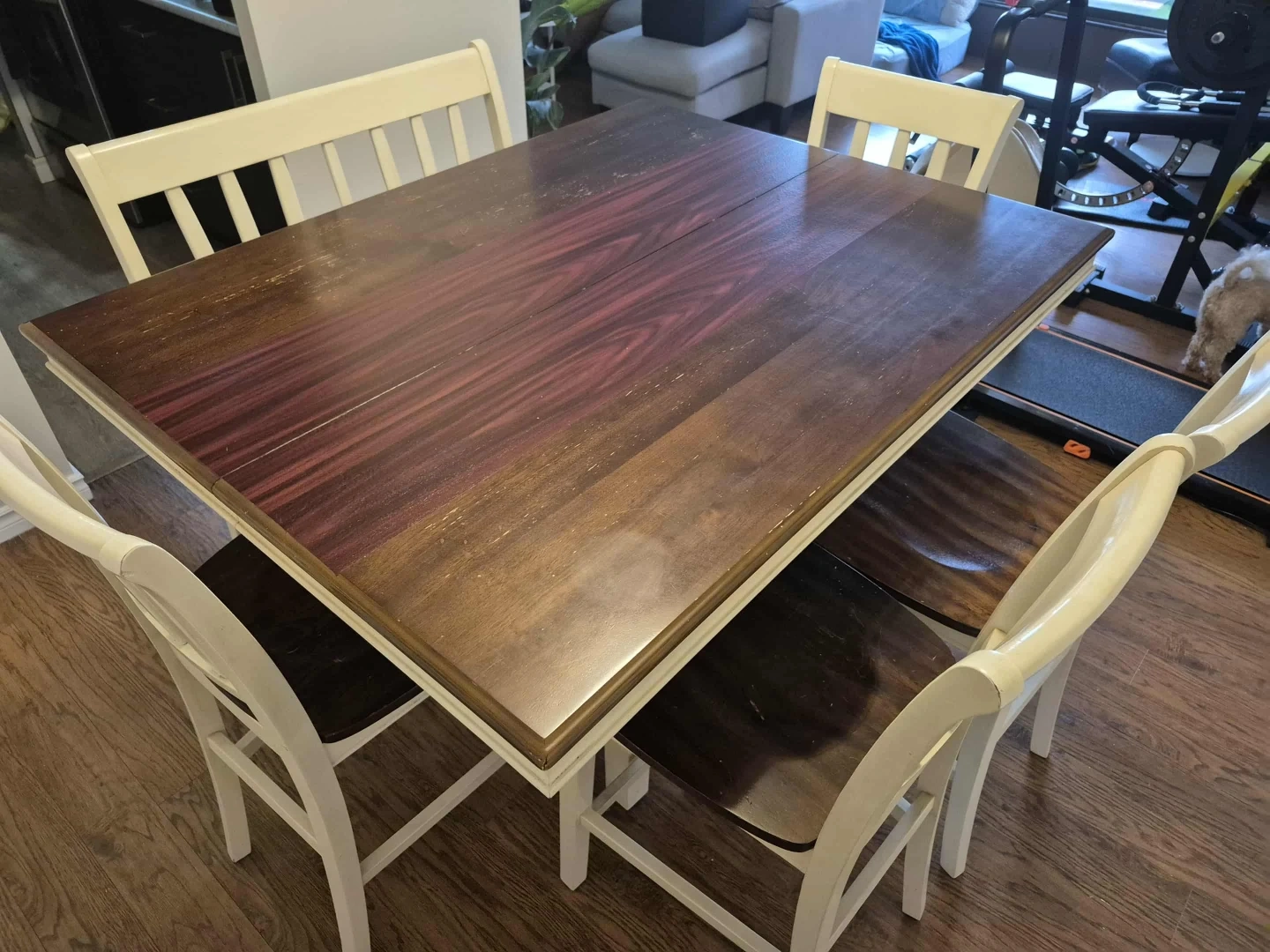 26Selling a dining table with a leaf and four chairs. The table is a dark wood colour with a white base, and the chairs are white with dark wood seats. It's in good condition and perfect for a family or small gathering