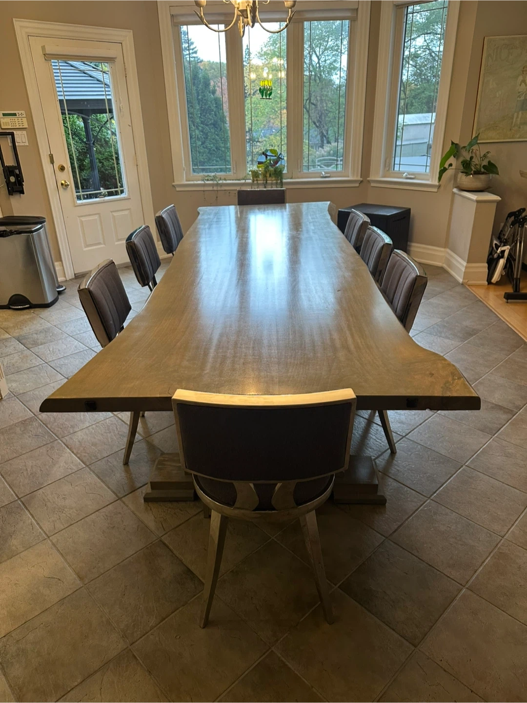20Selling a dining table with eight upholstered chrome chairs! The table has a unique design and is perfect for a large family or hosting dinner parties. The chairs are upholstered and complement the table nicely. It's a great set to enhance your dining room! Happy to sell chairs and table separately