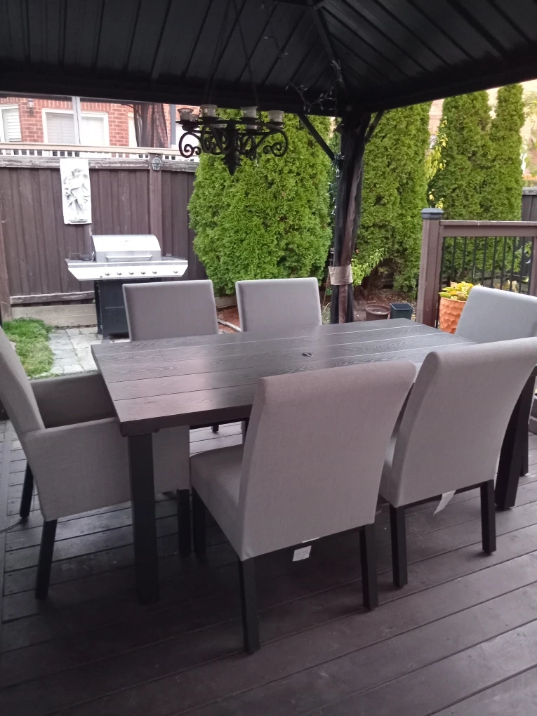 15Selling a dining table along with six chairs. The set features a rectangular table with a dark wood top and matching dark legs. The chairs are upholstered in a light grey fabric. It's a great set for family dinners or entertaining guests
