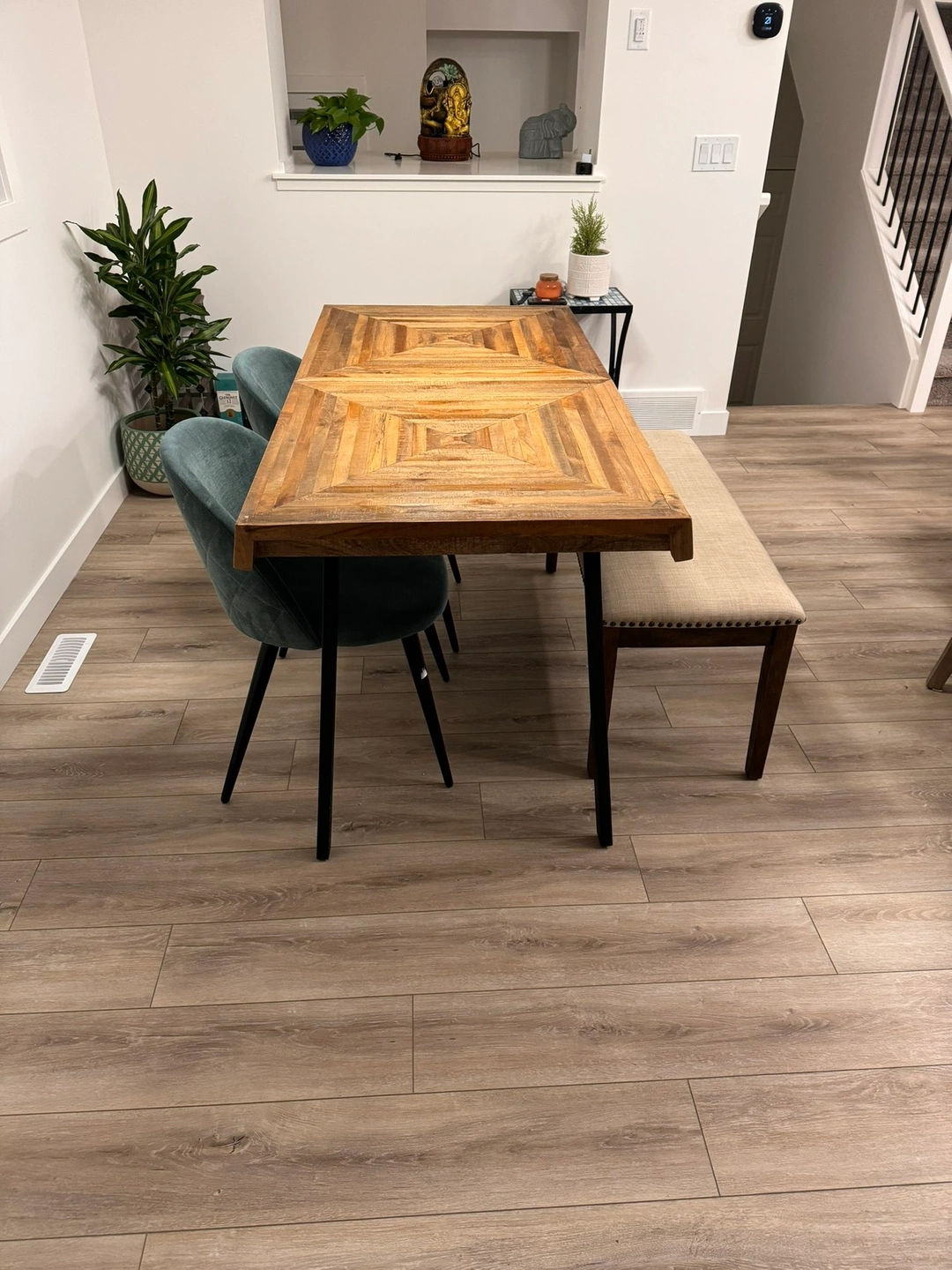 10Dining table with two chairs and a bench. Great condition, well kept. Minor scratches on the table. Prices to sell as a package for $564.00 Pick up/ delivery available, cash only