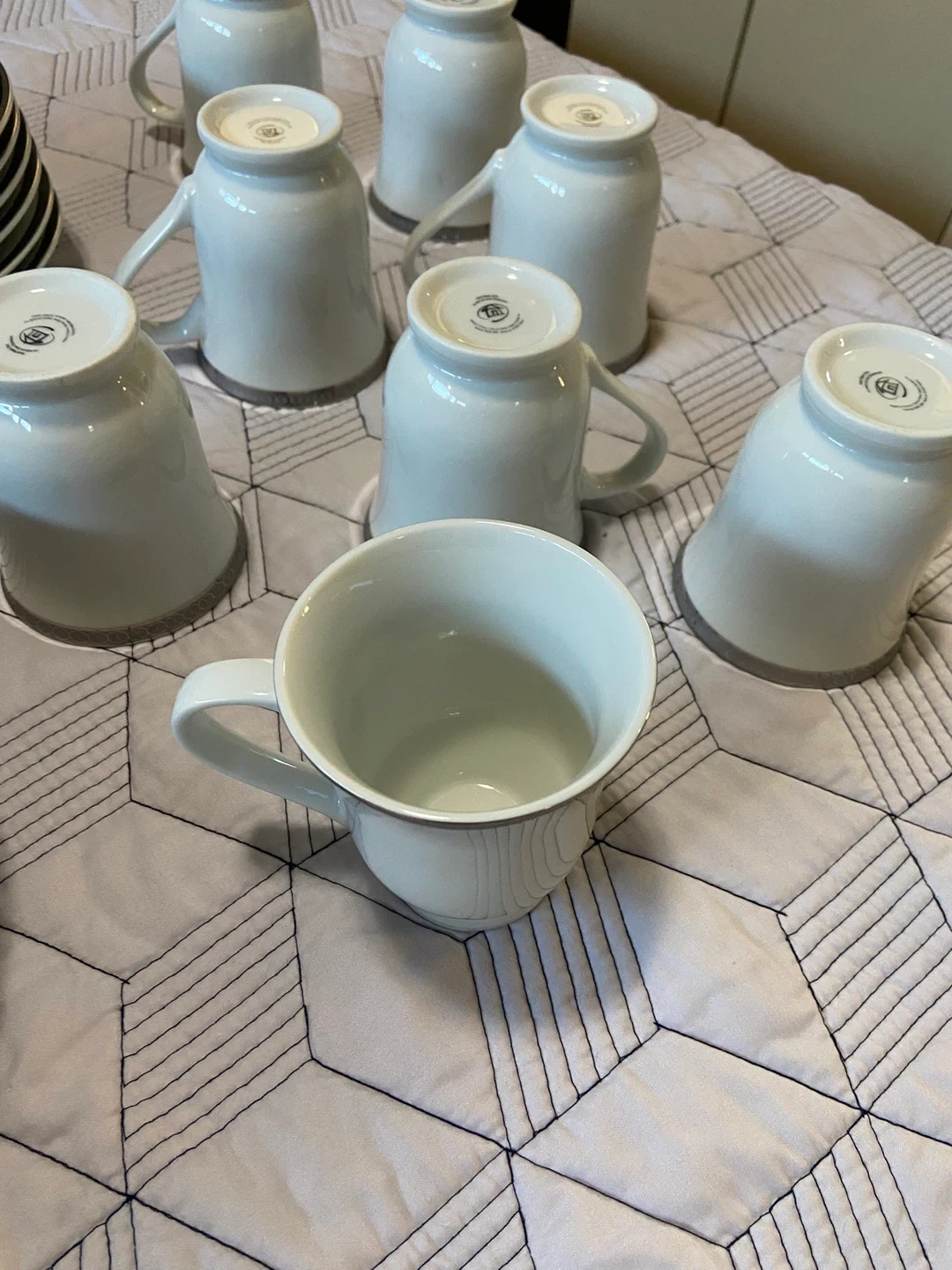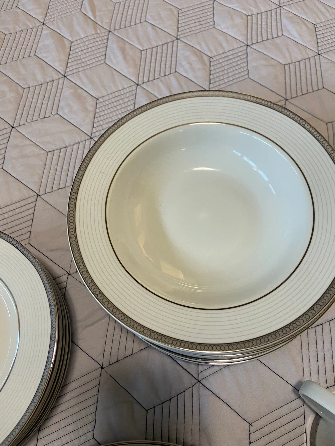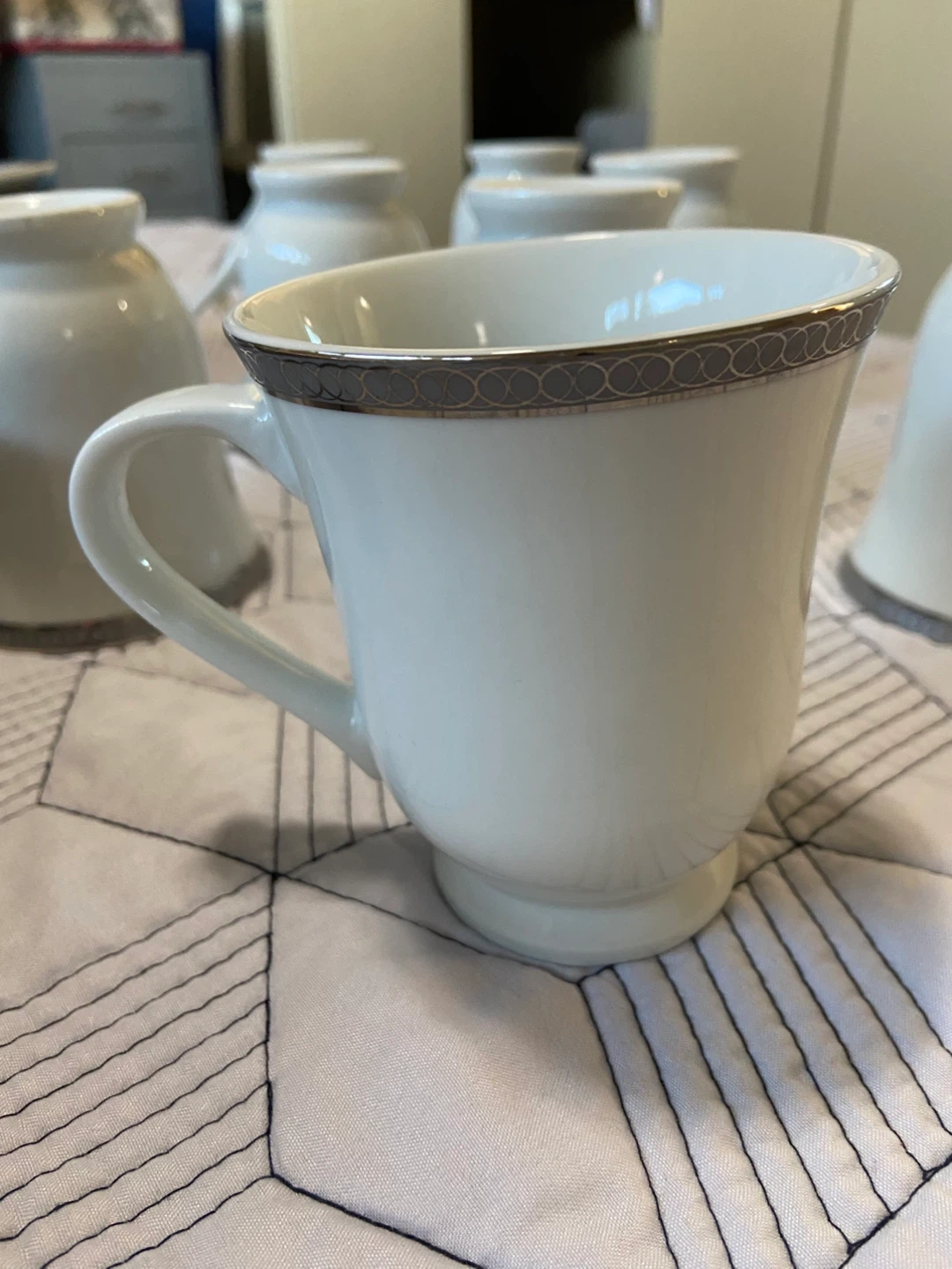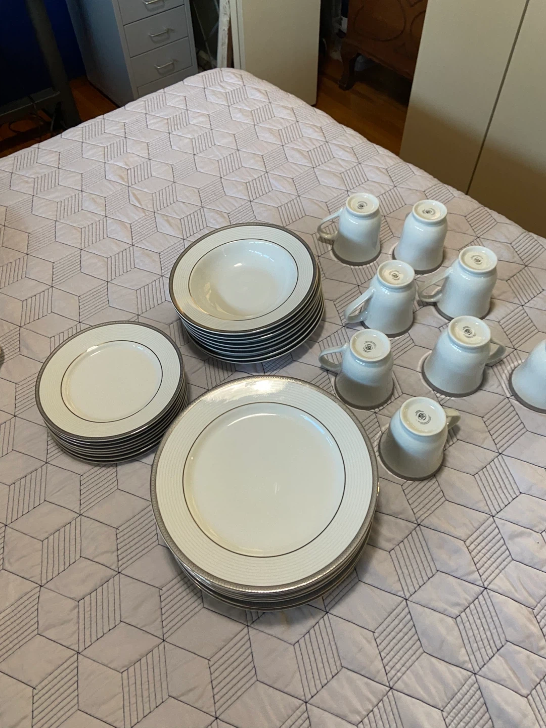 1036 pc The set includes 8 dinner plates, 8 side plates, 8 bowls, and 8 mugs. all in excellent condition. The design features a delicate silver trim.