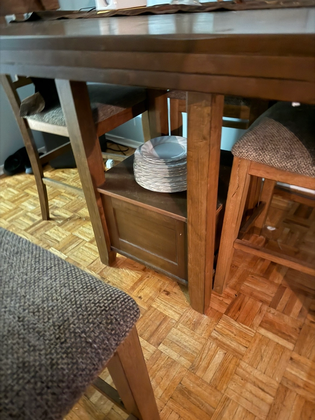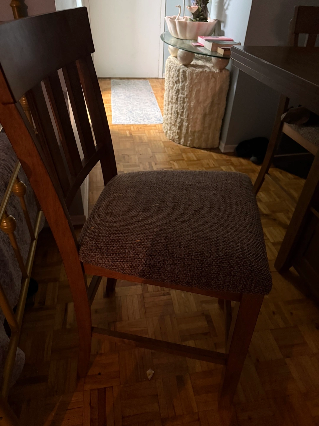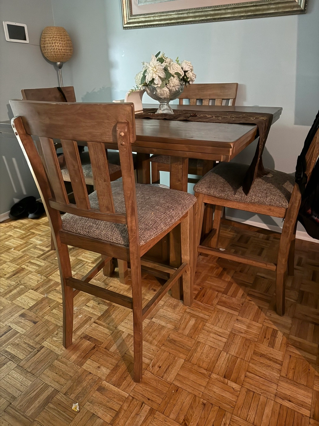 60For Sale – Ashley High-End Furniture Set Beautiful pub-height table with 4 upholstered chairs in a lovely walnut dark brown finish. • Chairs feature Scotchgard-protected fabric for durability and easy maintenance. • The table includes a display/storage base, perfect for showcasing your fine china or décor. • Elegant, sturdy, and versatile—suitable for dining, entertaining, or everyday use. ✨ Excellent condition – ready for a new home! 📞 Contact Natasha today and make me your best offer!