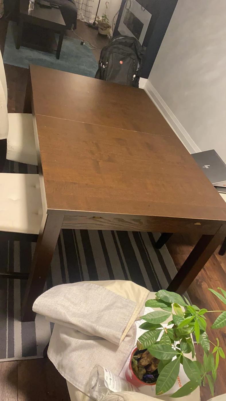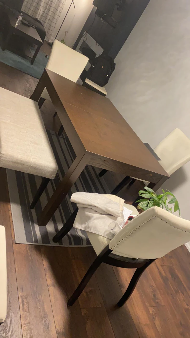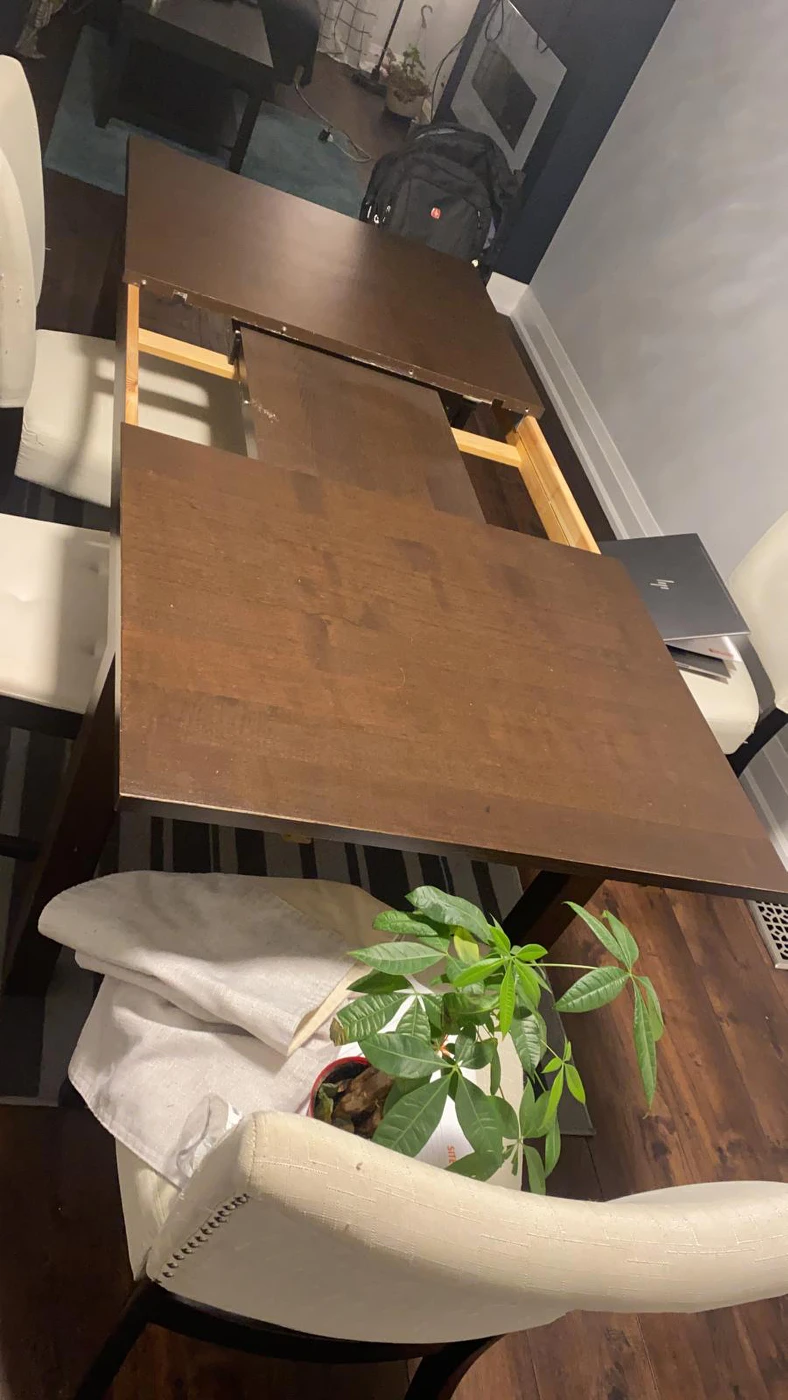 15Dinning table with 4 chairs and bench,in perfect conditions, selling as im moving to a smaller apartment and it doesn't fit.Width 82 cm,Length 140,height 90,Bench size length 1m,width 45.The table opened is 170 cm.It has only one small scratch as you can see in the photo.