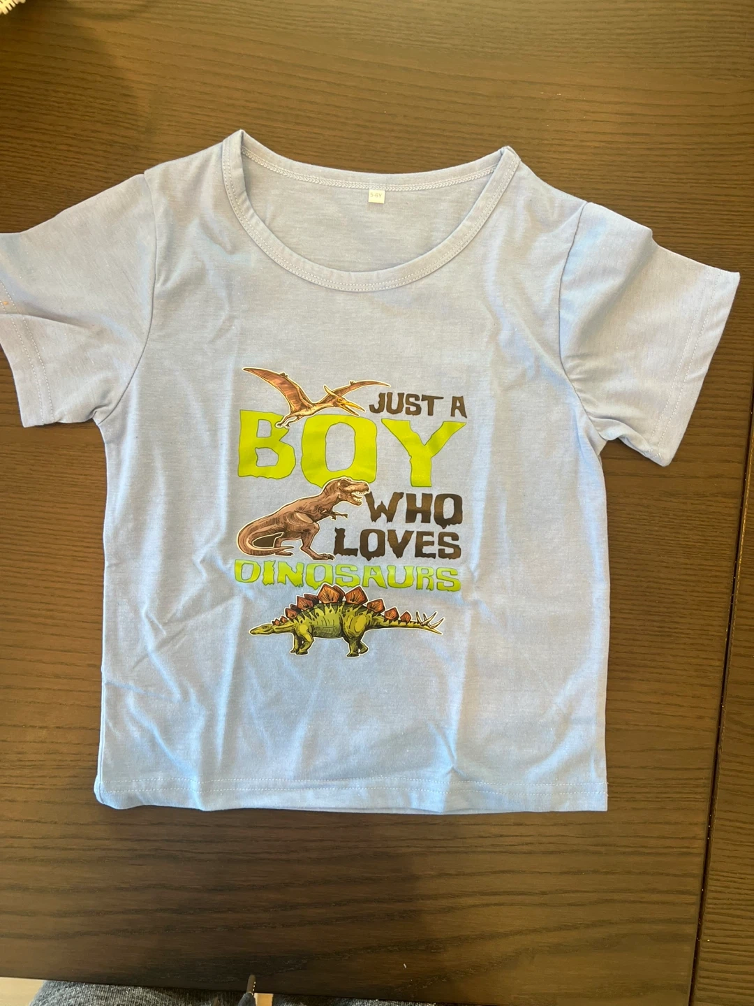 A cute light blue t-shirt with a dinosaur theme! The shirt says "Just a boy who loves dinosaurs" with a pterodactyl, T-Rex, and Stegosaurus. The size is 5-6Y