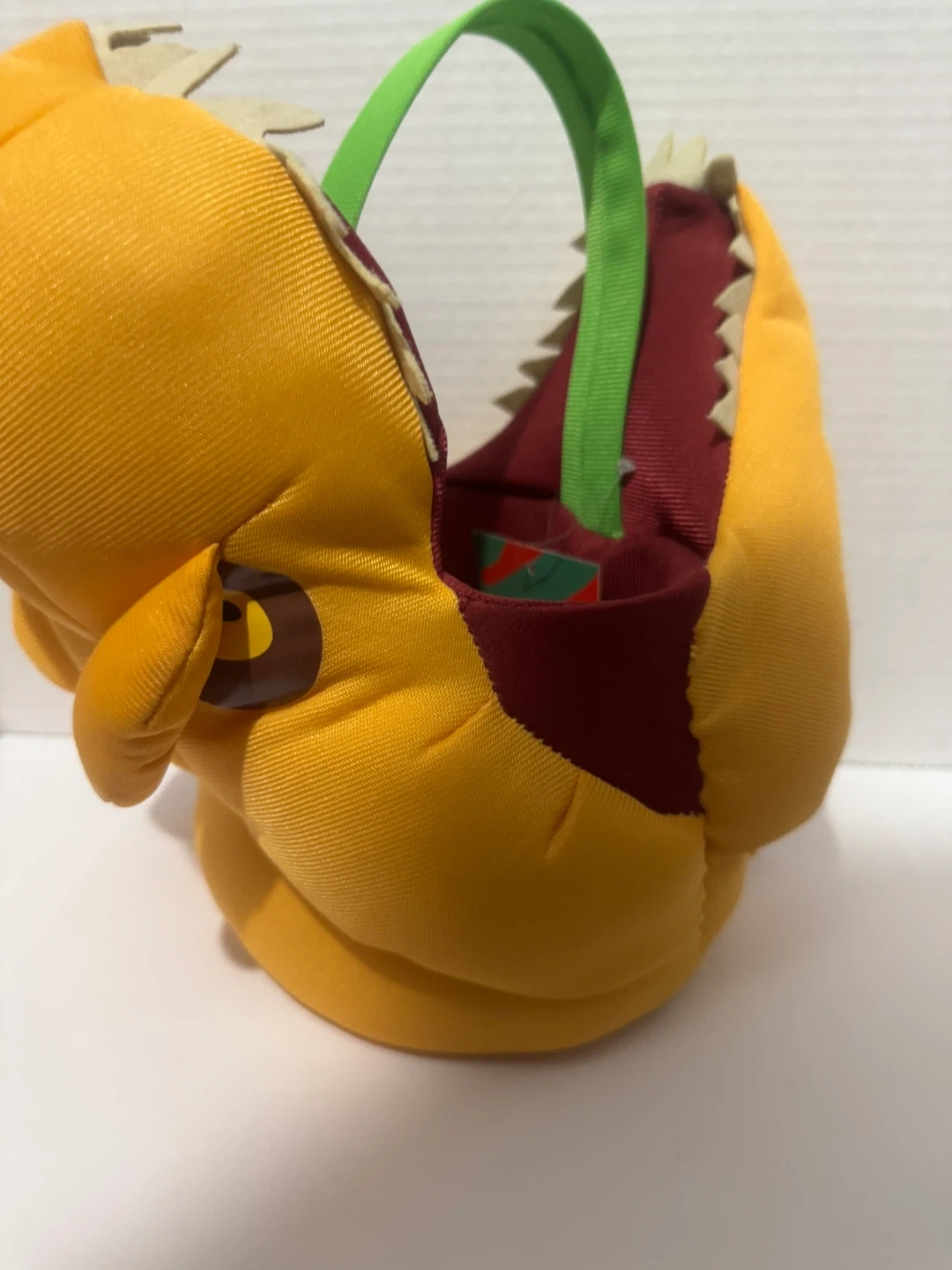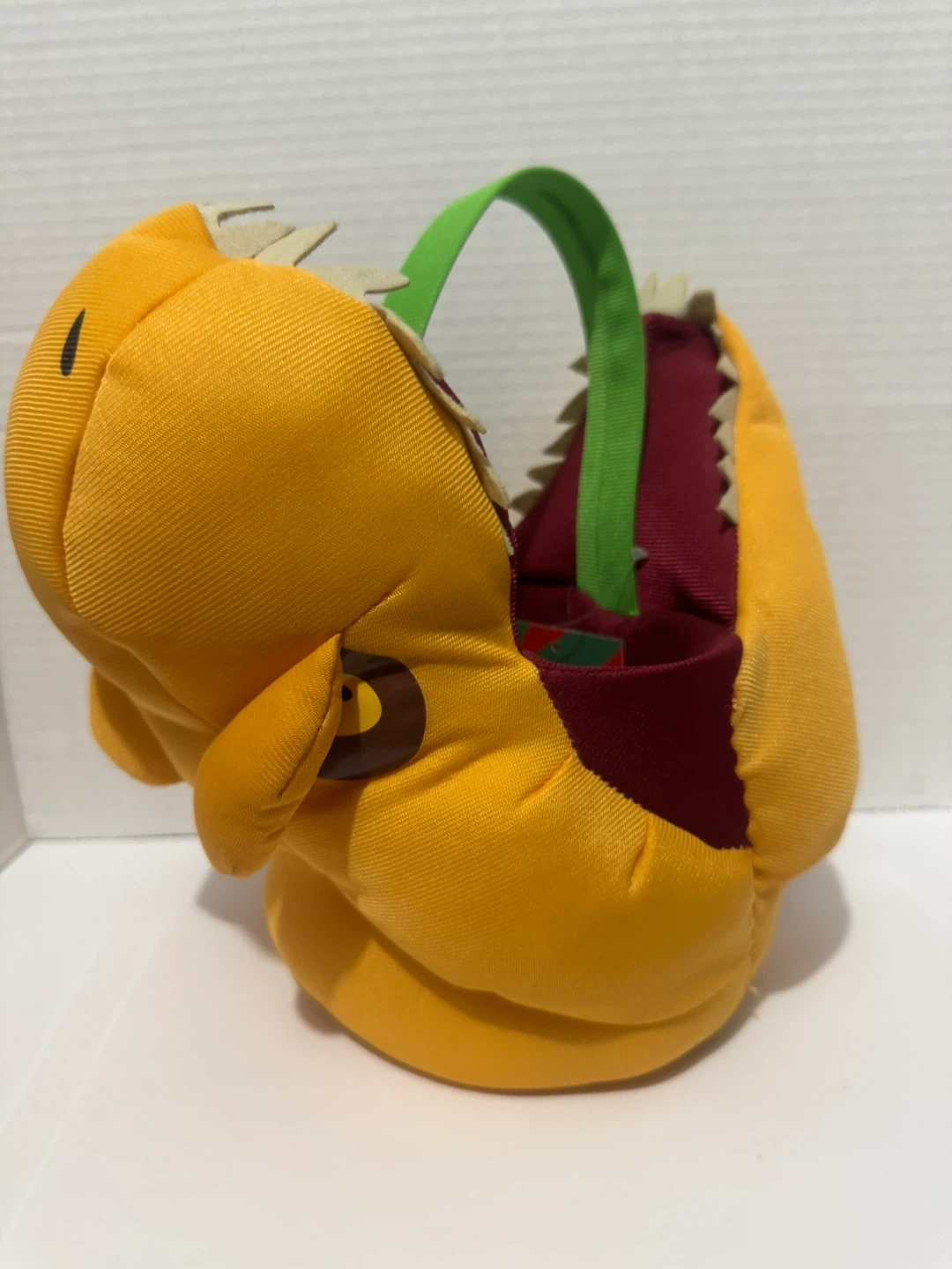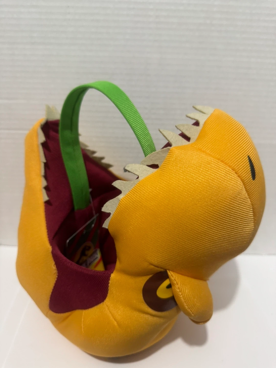 78Here's a fun dinosaur-themed trick-or-treat bag, perfect for Halloween! It's a bright yellow colour with a green handle and a cute, cartoonish dinosaur design. Great for collecting candy or using as a fun little tote bag for kids