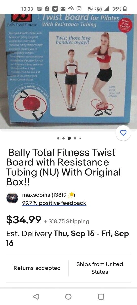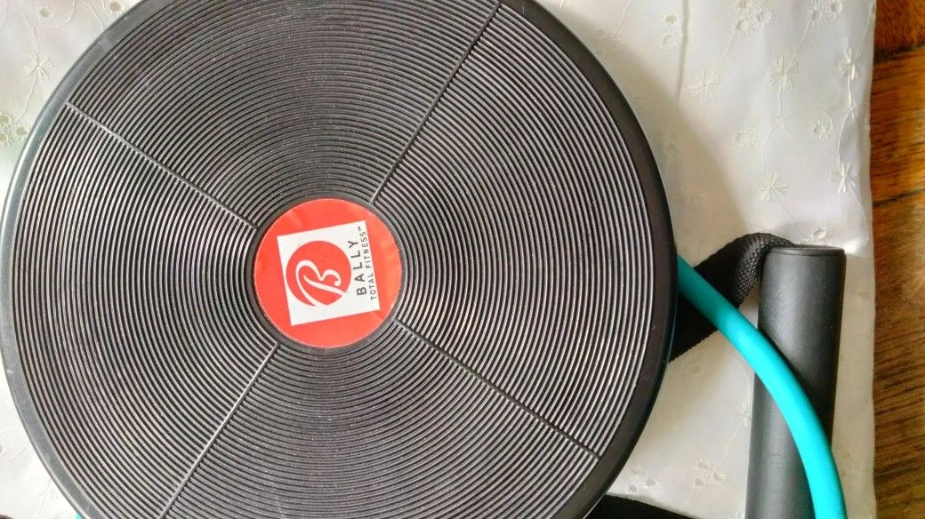This Bally Total Fitness Twist Board with resistance tubing is no longer made, and you can't find them attached like this anymore. It was in storage and never used, just a bit dusty so I wiped it down. The heavy-duty resistance tubing helps stabilize your body for a complete workout. Features massage points for foot stimulation and traction. You can also stretch and bend your arms for bicep curls or triceps extensions. It's portable and can be used at home, in the office, or at the gym. Color: Blue. Activity: Fitness.