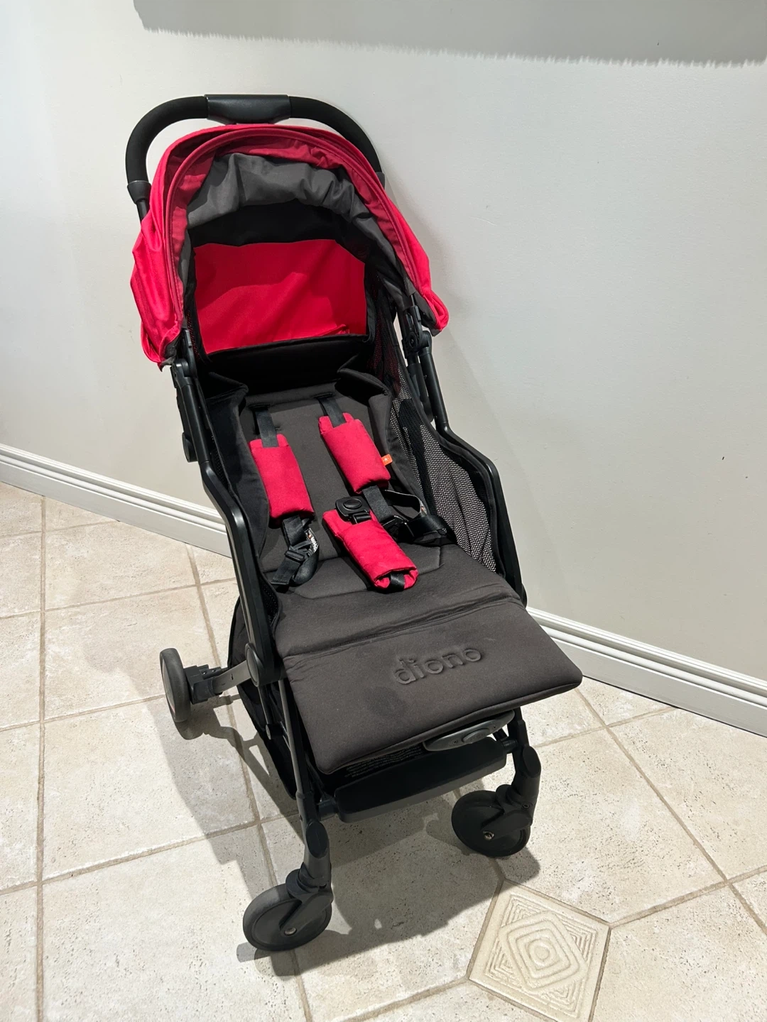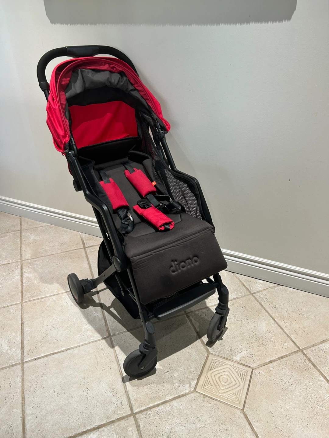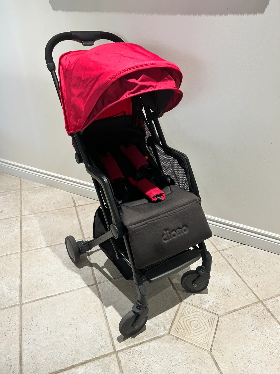 Hi, I’m selling my Diono stroller. It is a great stroller for travelling and easy to carry in airplane. It has been barely used. Only a few days on our trip to Cancun. Purchased Price in retail : 319$+tax Condition : excellent Traverze is the Diono super-compact stroller created to make traveling easier for families on the move whether you're pulling along in an airport with a toddler in tow or folding down in an instant for speedy boarding, we've got it bagged, and good to go.... With a clever and versatile extendable luggage style handle for easy transportation, and a hide away protective cover to keep your stroller clean and protected, the Traverze is good to go... anywhere, and even fits in most overhead cabins.* We know what it means to travel through busy airports, train stations and crowded shopping malls. You could be on a mini break or long haul, and we all love to explore. So in an ever-smaller world, whether traveling or shopping we've created some big ideas to help you and your little one arrive happy. * Diono Traverze Stroller is a luggage-style super Compact stroller * Features a reclining backrest allowing a near flat position for ride comfort * Integral 5 point harness with removable plush pads * Added storage pocket – behind leg rest * Telescopic pull-along handle – just like your luggage * Complete with water resistant travel carry bag * Super-compact and free standing when folded with secure auto-lock * Full sized sun canopy with integrated air vent * Tailored rain cover included * Lightweight stroller weights less than 12.3 lbs (5.6 kg) * Smooth rolling wheels that never go flat * Easy access – XL basket