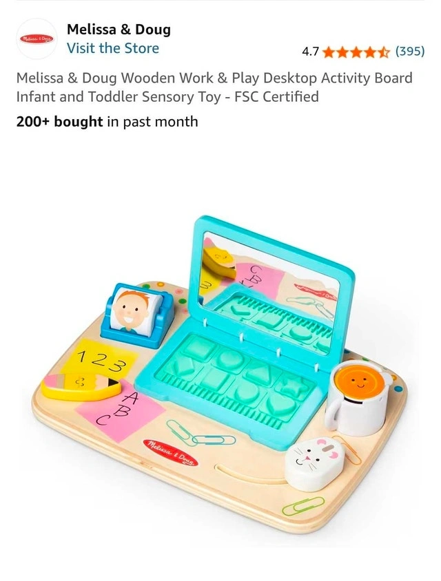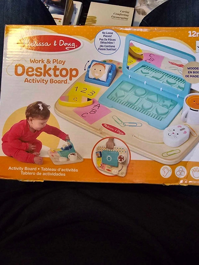 New in box. Infants and toddlers will have fun “working” just like grown-ups do and discovering textures and sounds with this wooden desktop activity board. All pieces are attached and it has a built-in handle. Open the laptop lid to reveal a peekaboo mirror and rubberized, shaped keyboard buttons to touch and press to help develop fine motor and shape recognition skills. Spin the rolling contact list to hear beads inside tumble, spin the wooden pencil, slide the wooden mouse, and flip the mug insert for hot chocolate or juice. No loose pieces, great for travel. Melissa & Doug infant and toddler toys inspire “a-ha!” moments of discovery. Adorable, diverse characters and a variety of fun shapes and textures encourage exploratory, skill-building play. Makes a great gift for infants, ages 12 months to two years, for hands-on, screen-free play and developmental skill-building. This product is certified by the Forest Stewardship Council (FSC C156584).