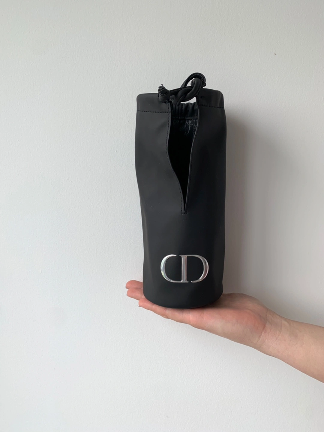 Black pouch. Drawstring closure. Features a logo. A great way to keep your essentials organized.
