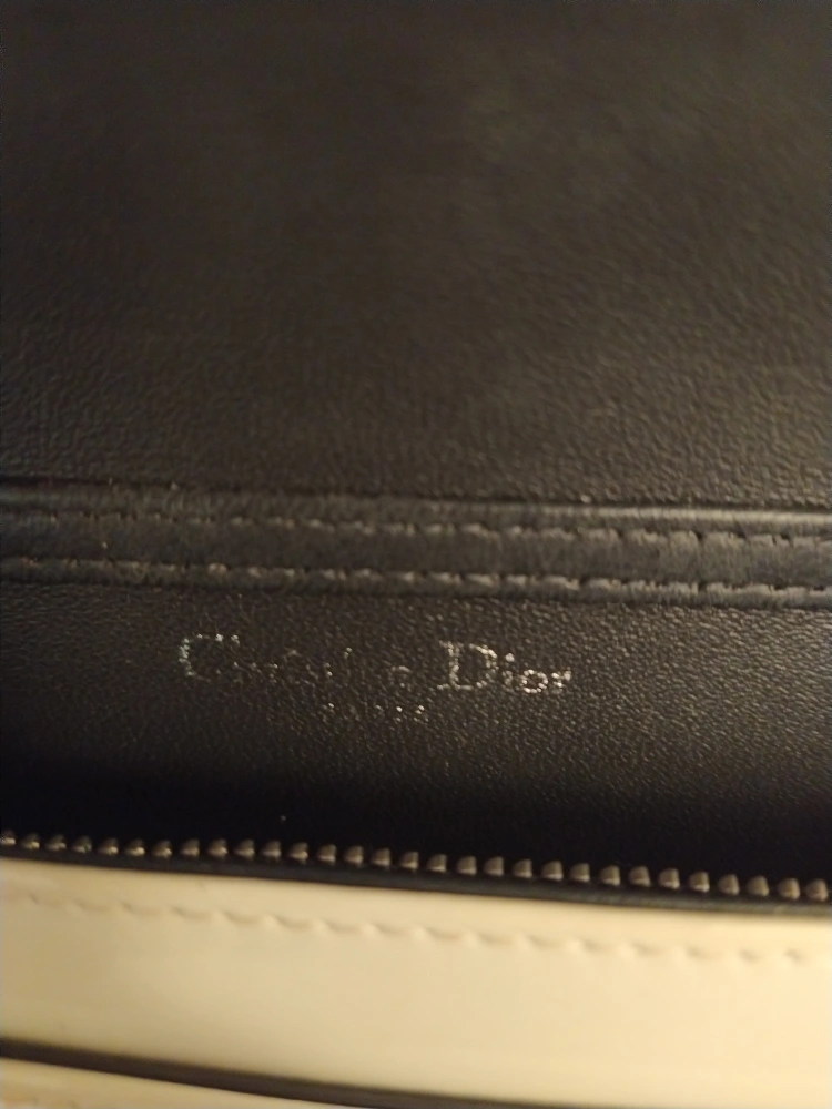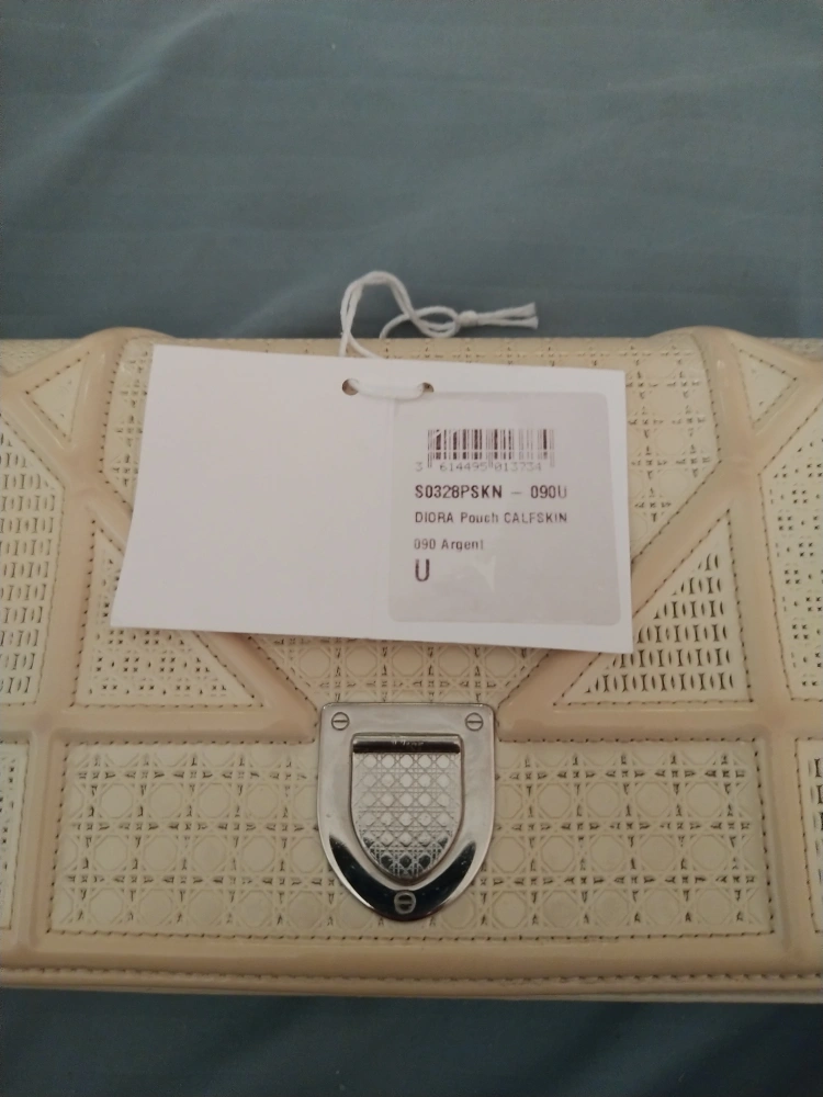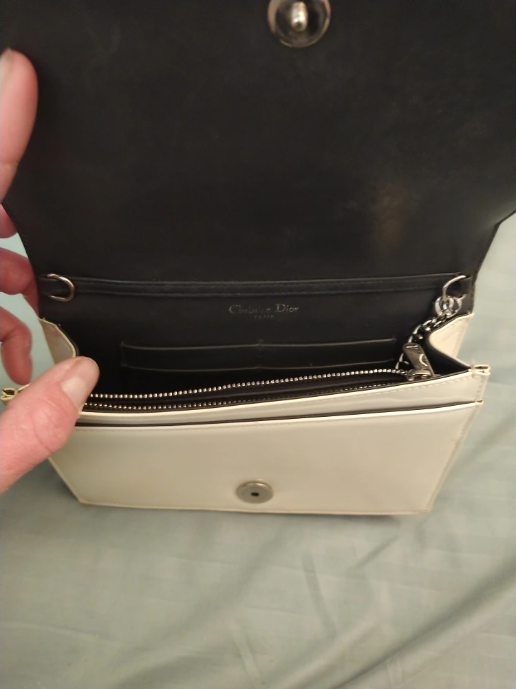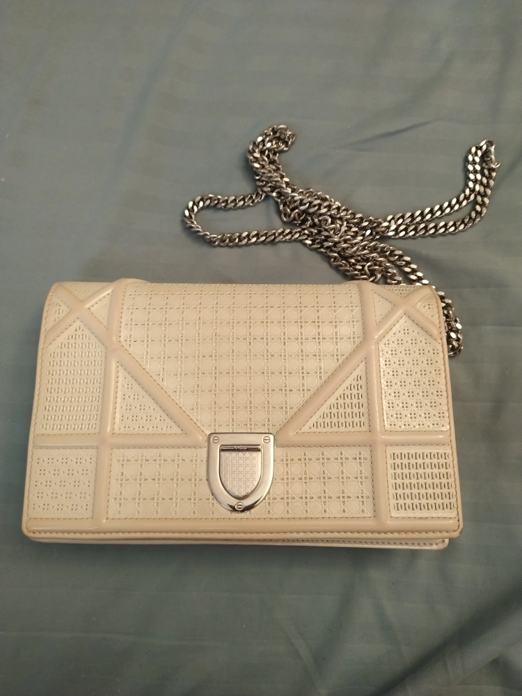 17Cream coloured Dior pouch with a silver chain. The pouch has a unique geometric design with a flap closure and a silver D-shaped buckle.