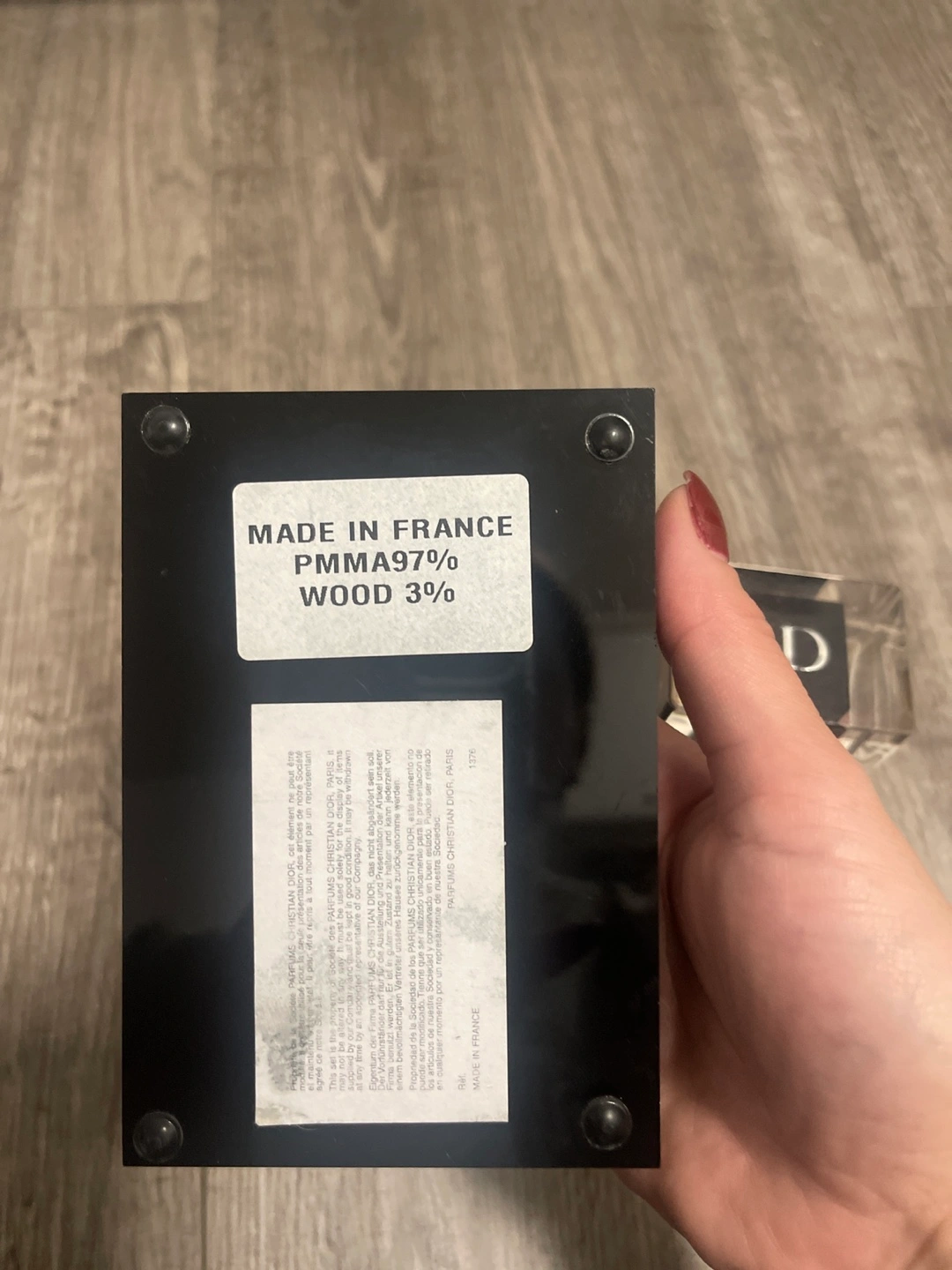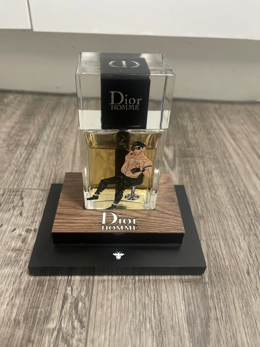 Dior Homme perfume display stand, incomplete bottle, used several times .Includes a 100ml bottle of Dior Homme Eau de Toilette. Made in France. PMMA and wood construction.