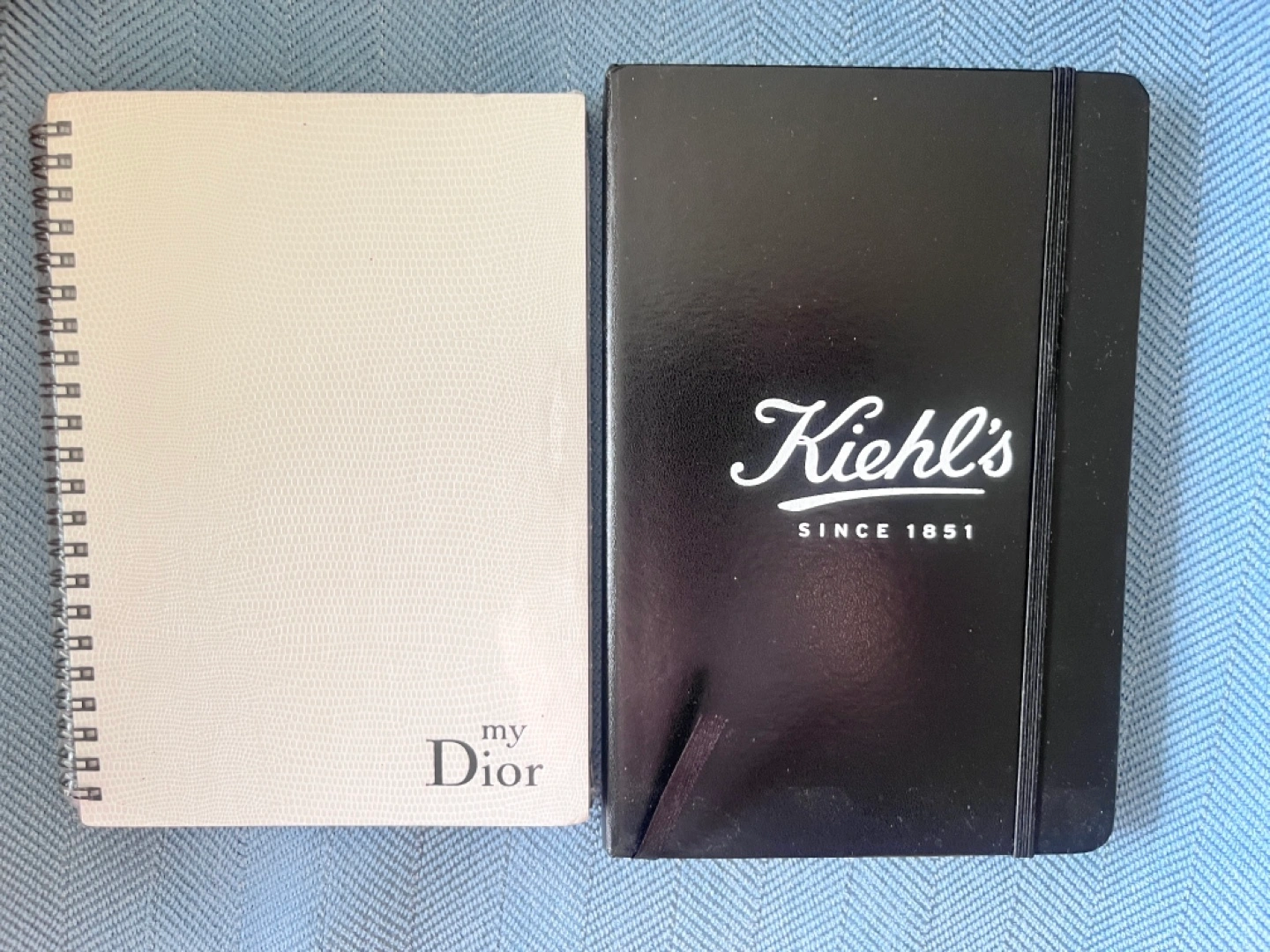 Two notebooks for sale! One is a 'my Dior' spiral notebook, and the other is a black Kiehl's notebook with an elastic closure