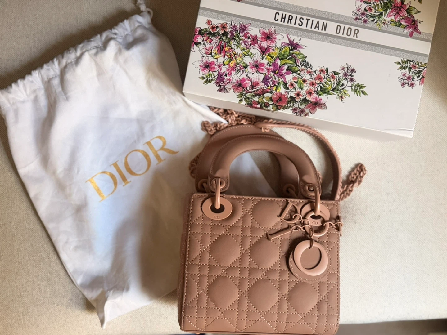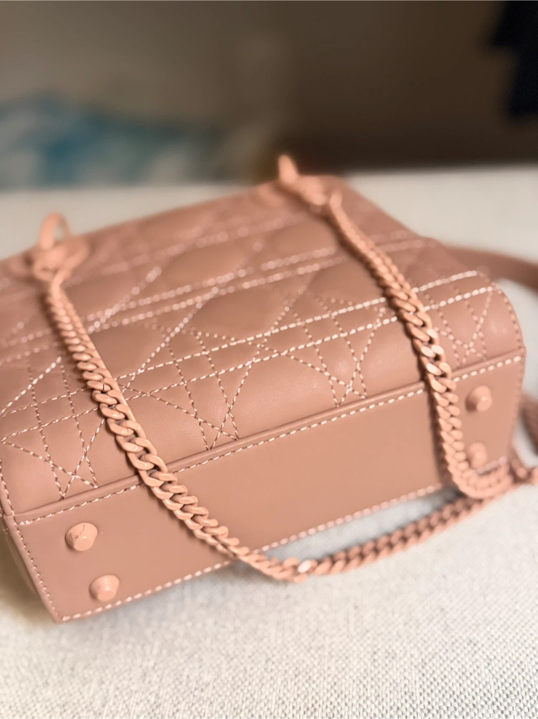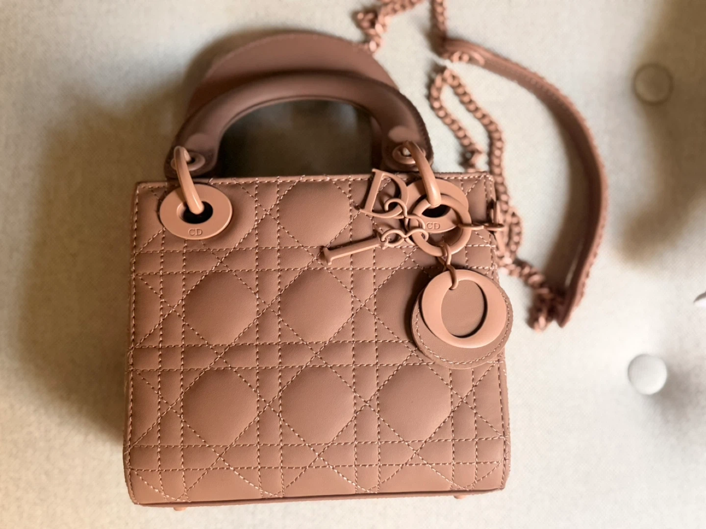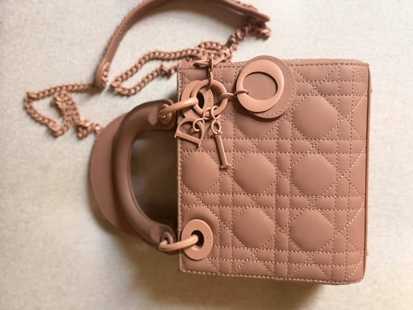 89Selling a beautiful Lady Dior mini bag in a lovely rose gold colour! It's in great condition and comes with the original box and dust bag. This iconic bag is perfect for adding a touch of elegance to any outfit. Feel free to ask any questions!