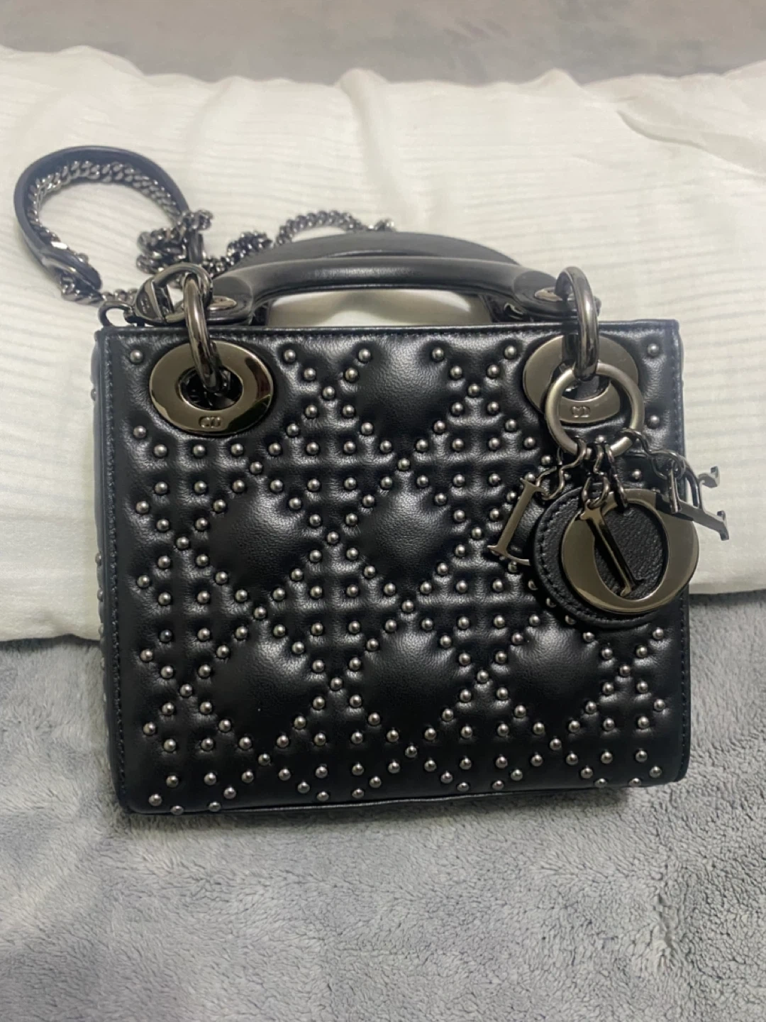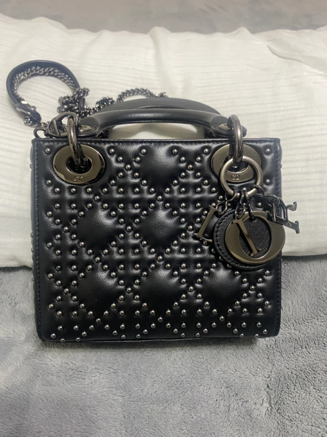 10Selling a beautiful Dior Micro Lady Dior bag in black. It features a studded design and the iconic Dior charms. Perfect for adding a touch of elegance to any outfit!