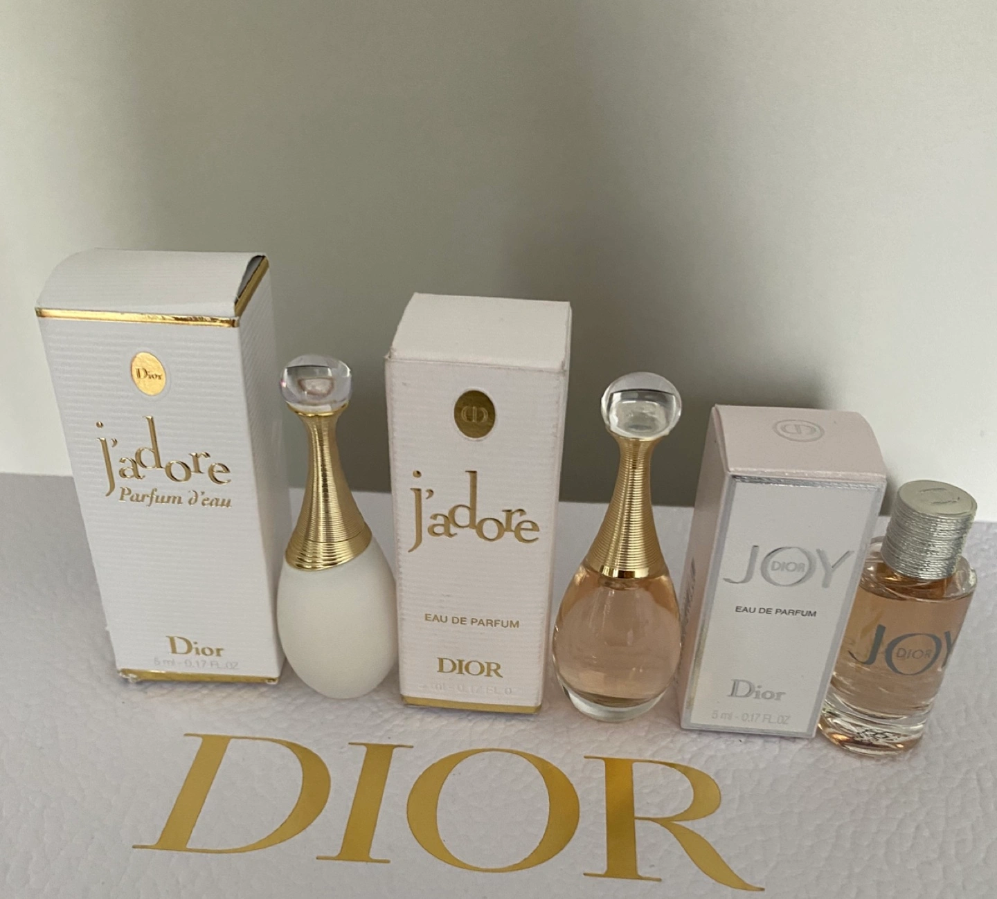 Collection of miniature Dior perfumes. Includes J'adore parfum d'eau and J'adore eau de parfum, plus Joy eau de parfum. Great for travel or sampling. $20 each. 5ml each.