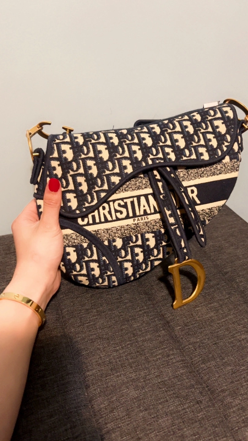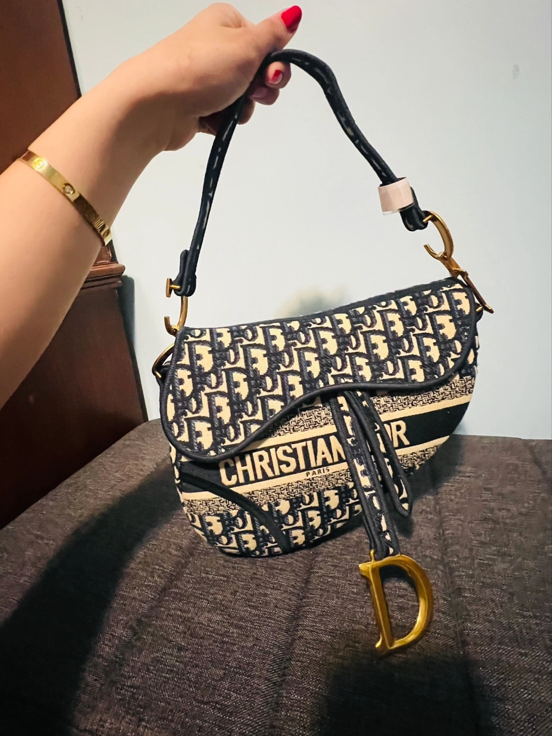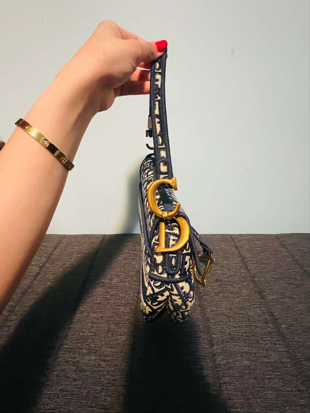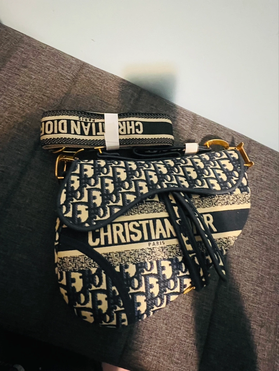 Show allBlue and beige CD saddle bag. Features the iconic Dior monogram. Includes an additional strap. Gold-tone hardware. Perfect sized.