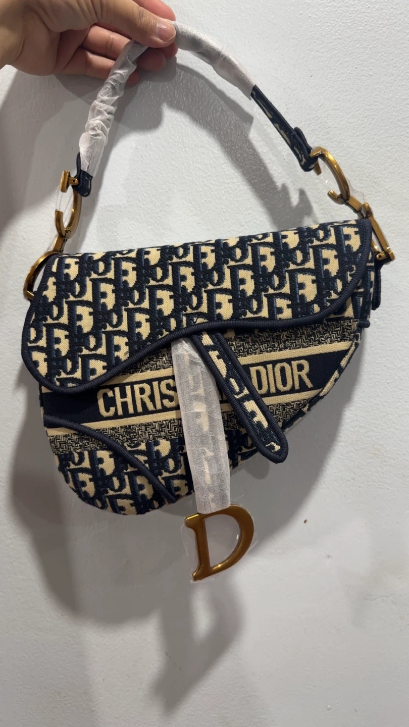 29Selling a Dior Saddle Bag. It features the iconic Dior Oblique pattern in navy and beige. The bag has a unique shape and the signature 'D' stirrup magnetic clasp. The handle has the 'CD' signature on either side. It's a stylish and recognizable piece! addle bag top qualit. just like the og bag