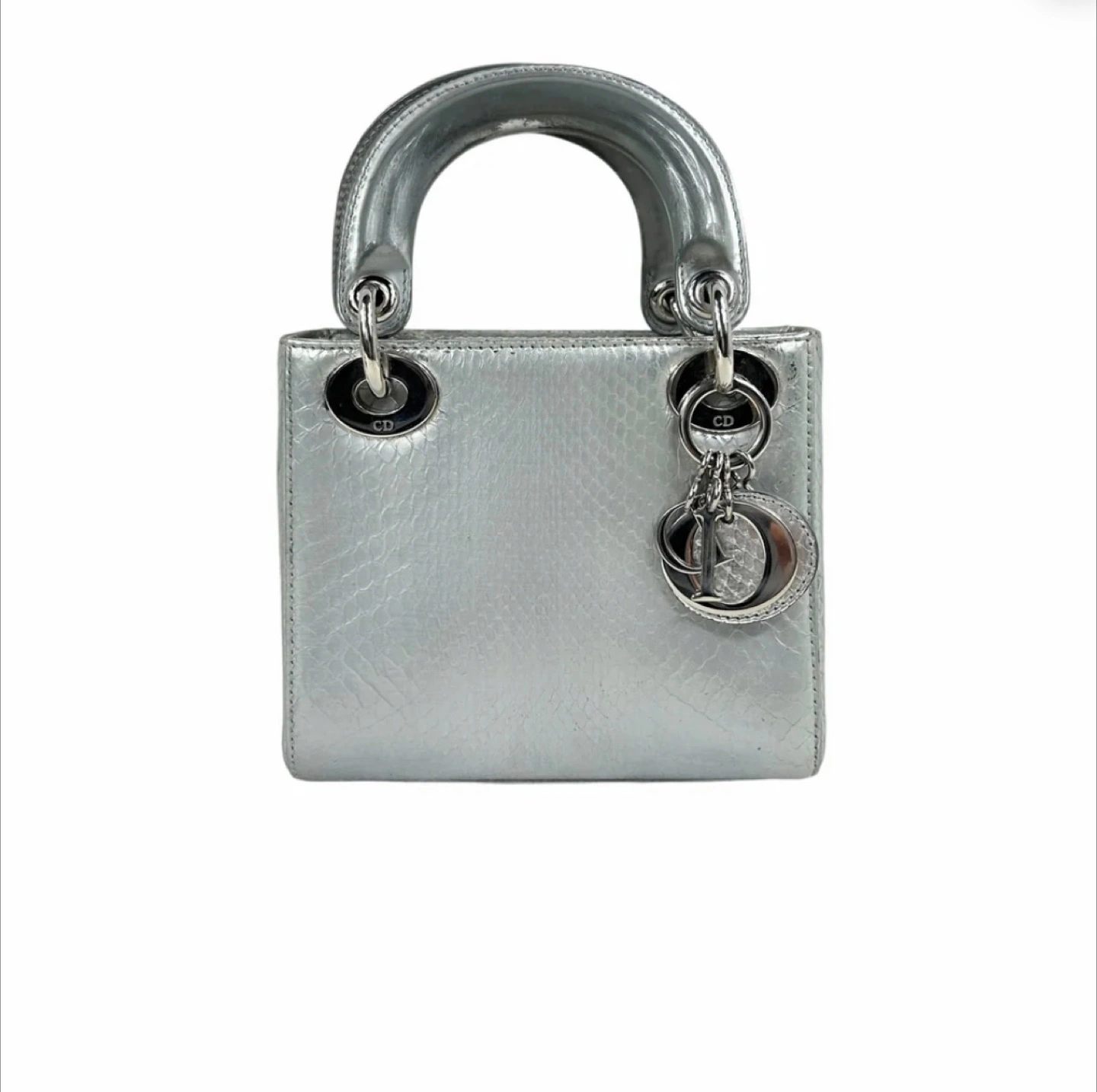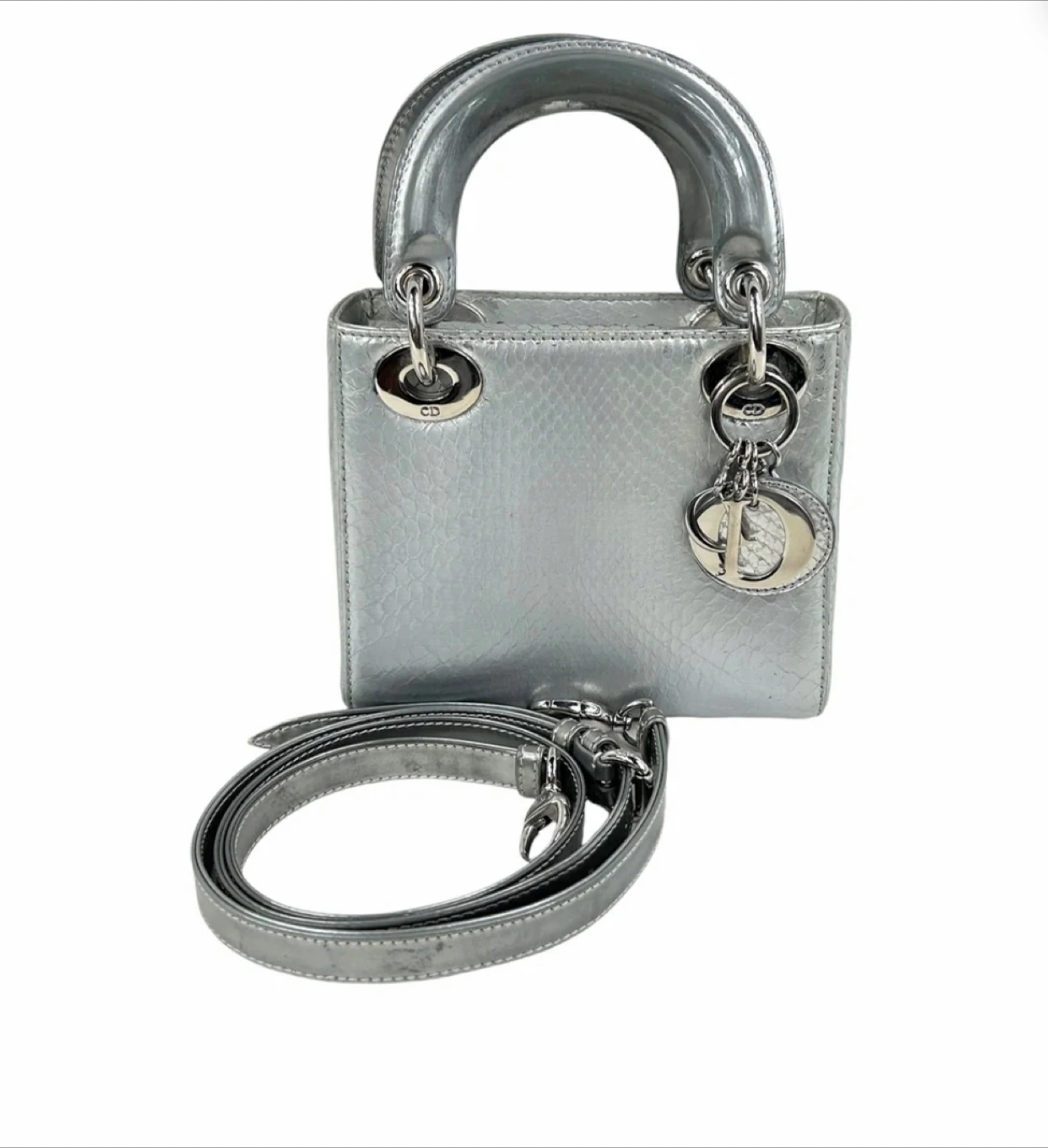 Shiny silver handbag. Features a handle and an additional strap. Accented with metal hardware, including a dangling charm. A great accessory to add to your wardrobe and find a sense of serenity in its elegance.