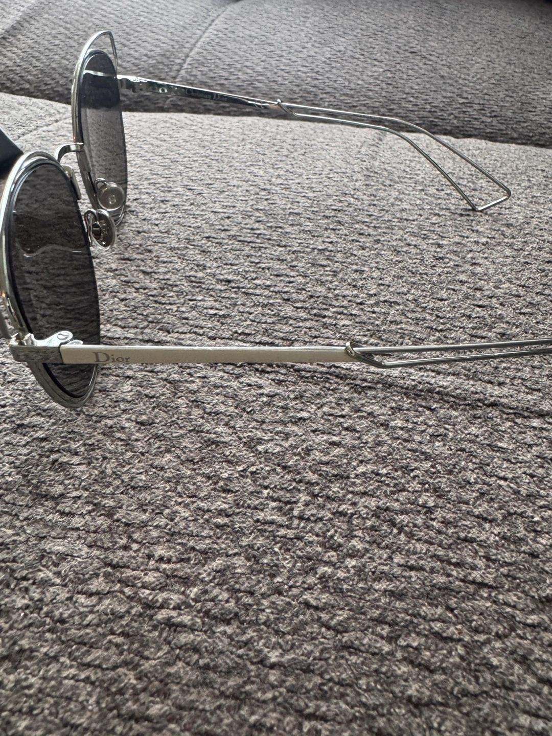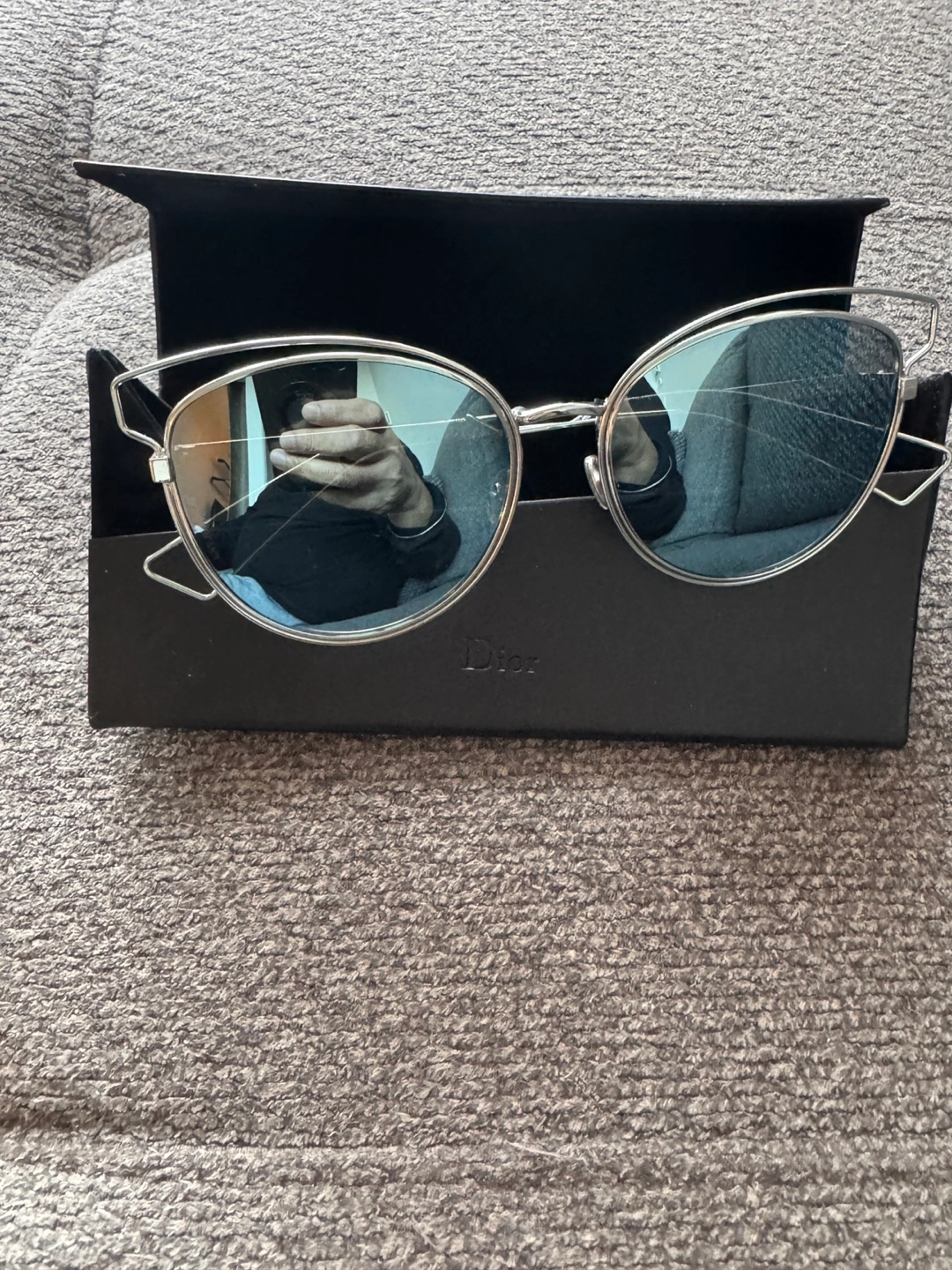 Dior sunglasses. Cat-eye style, silver metal frame, blue mirrored lenses. Comes with original case.