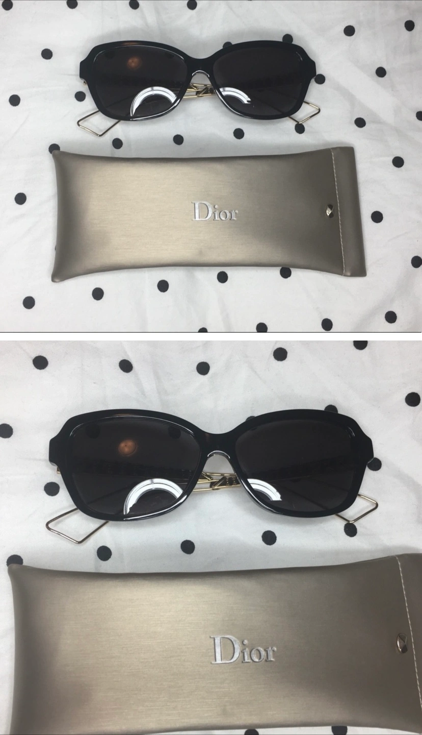 Selling a pair of Dior sunglasses. They come with a Dior case for protection. The sunglasses have a sleek black frame with gold detailing on the sides. They are in great condition and ready for a new owner!